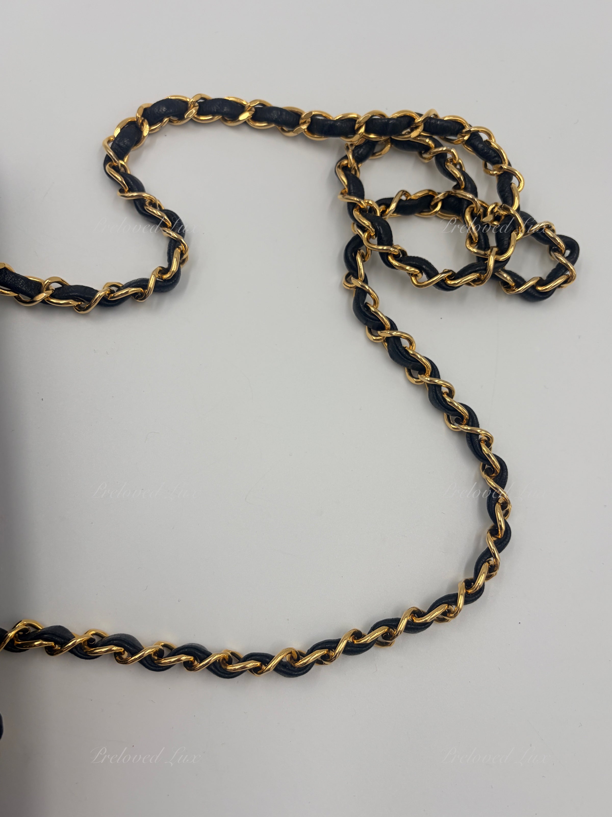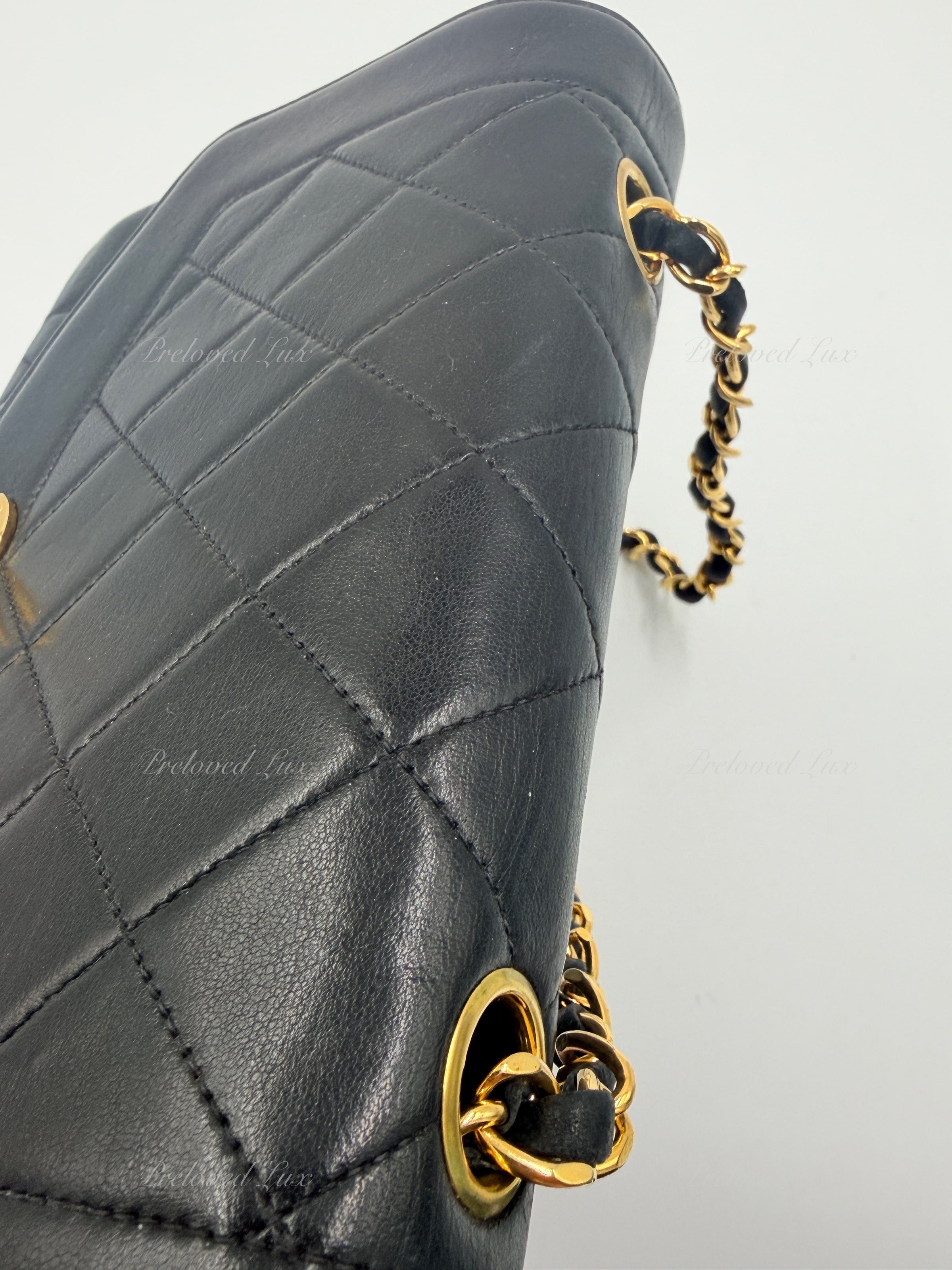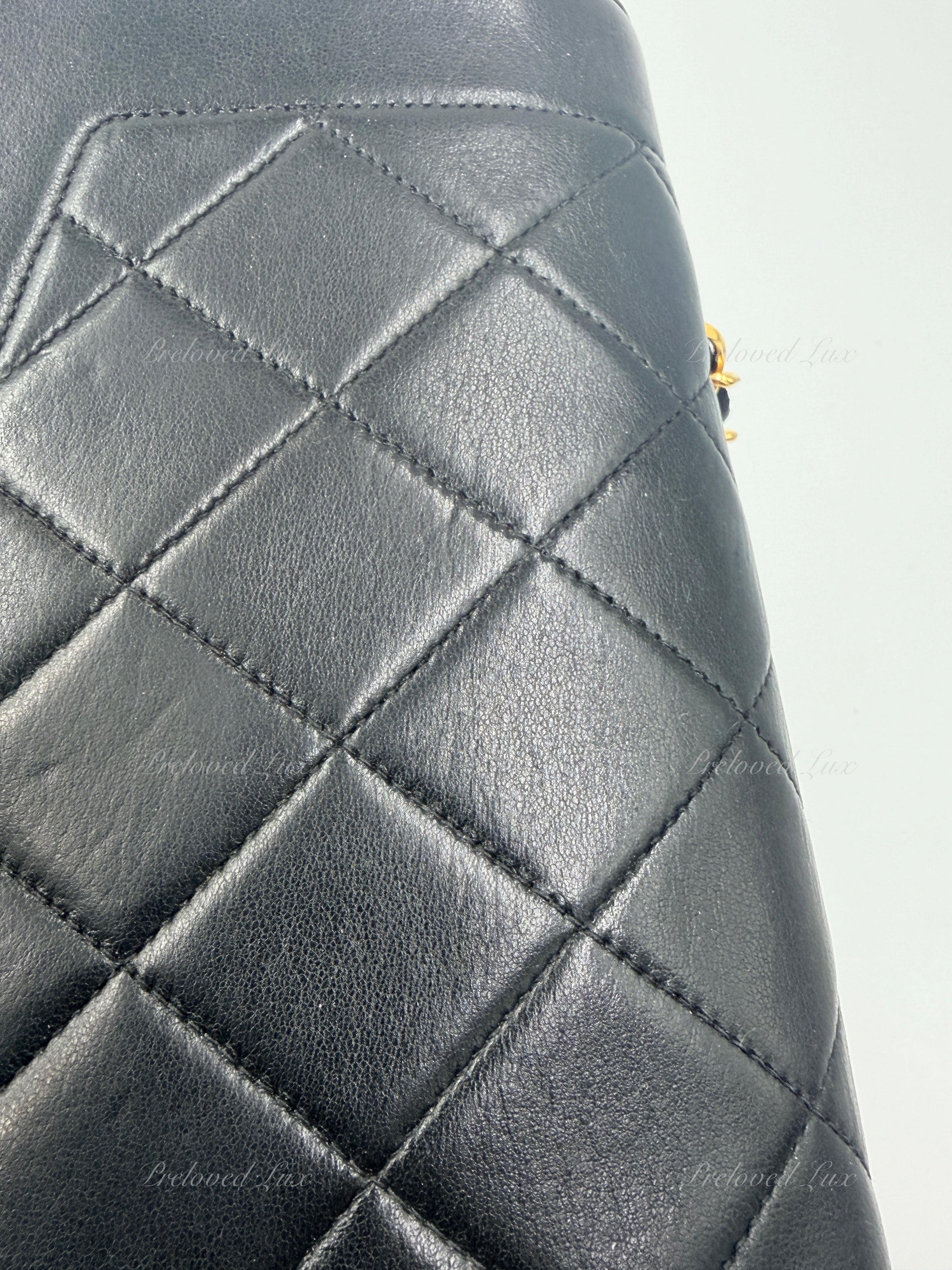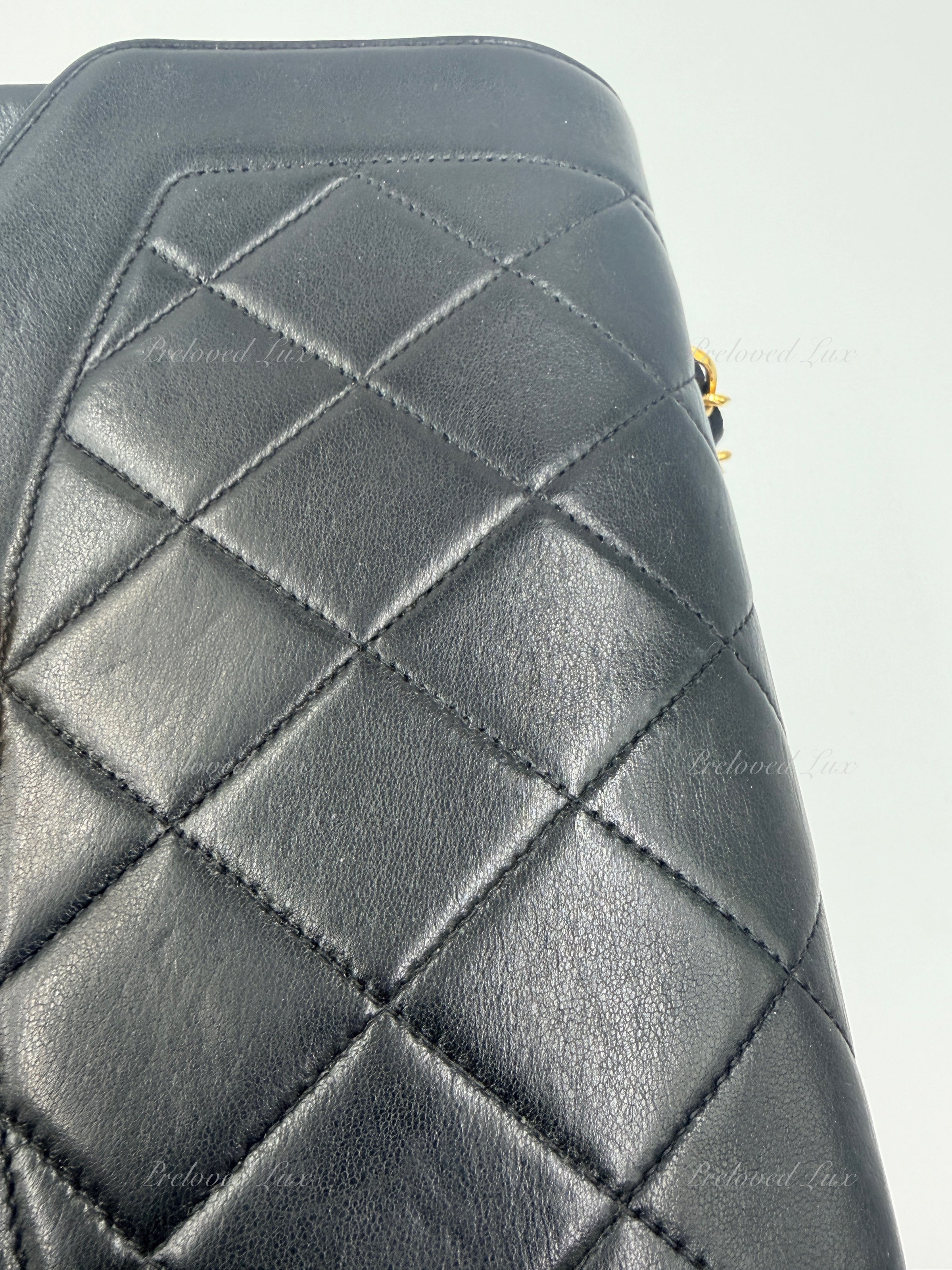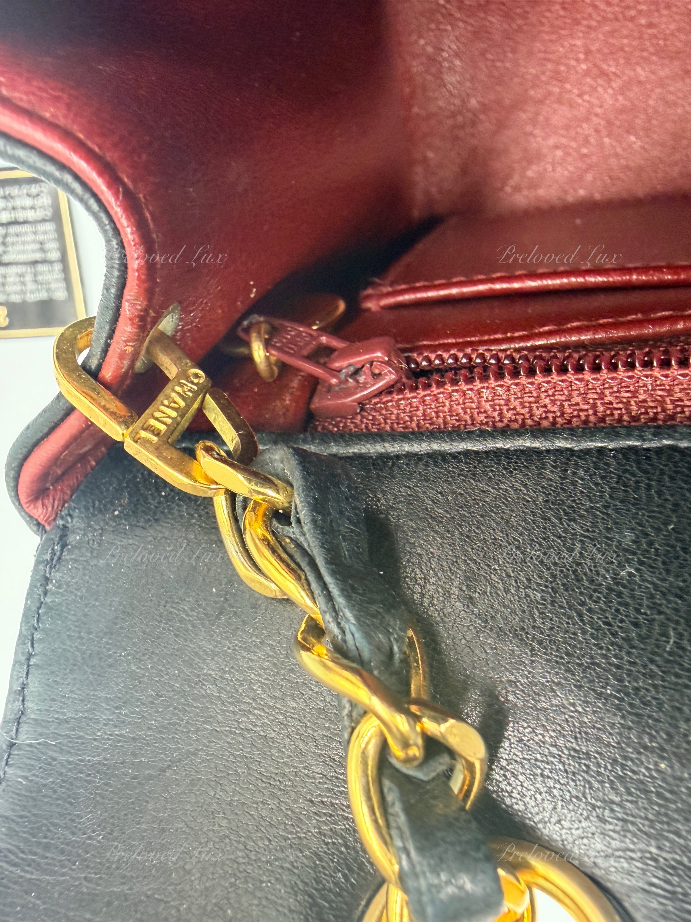 We guarantee this is an authentic CHANEL handbag or 100% of your money back.  This Chanel vintage bag is crafted in black lambskin leather and paired with a gold/leather chain. 24K gold plated hardware.