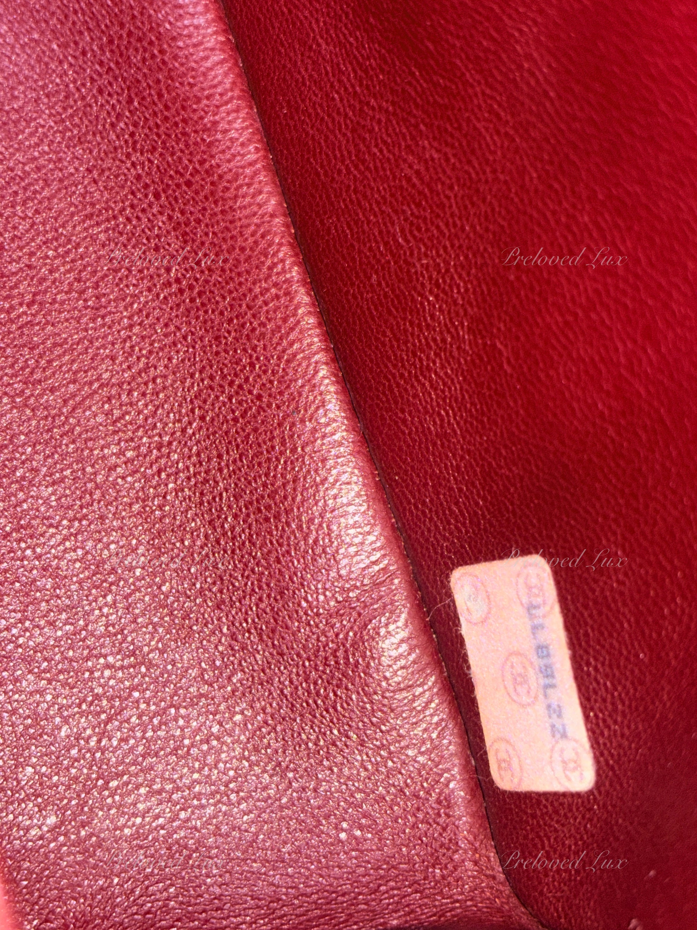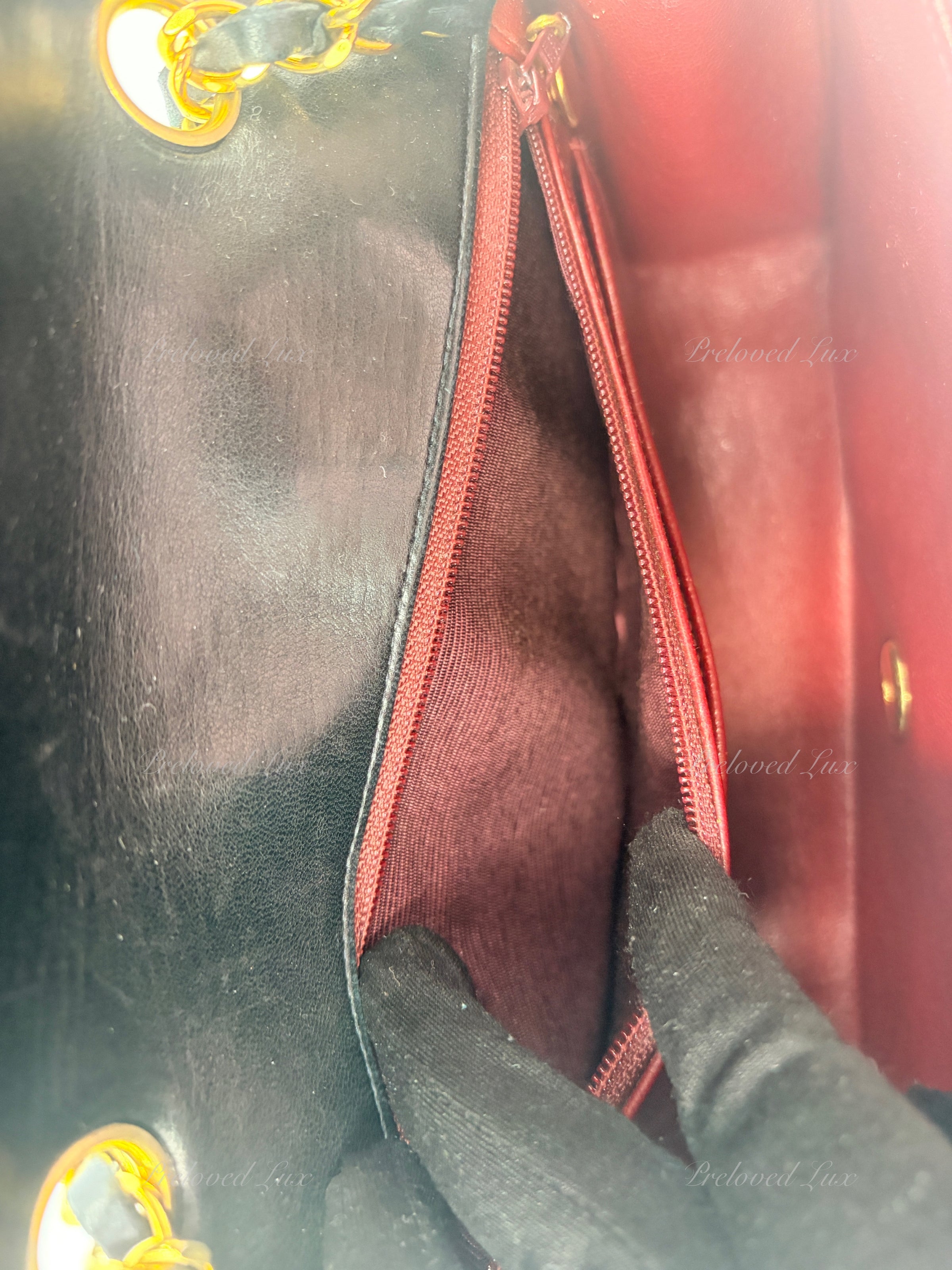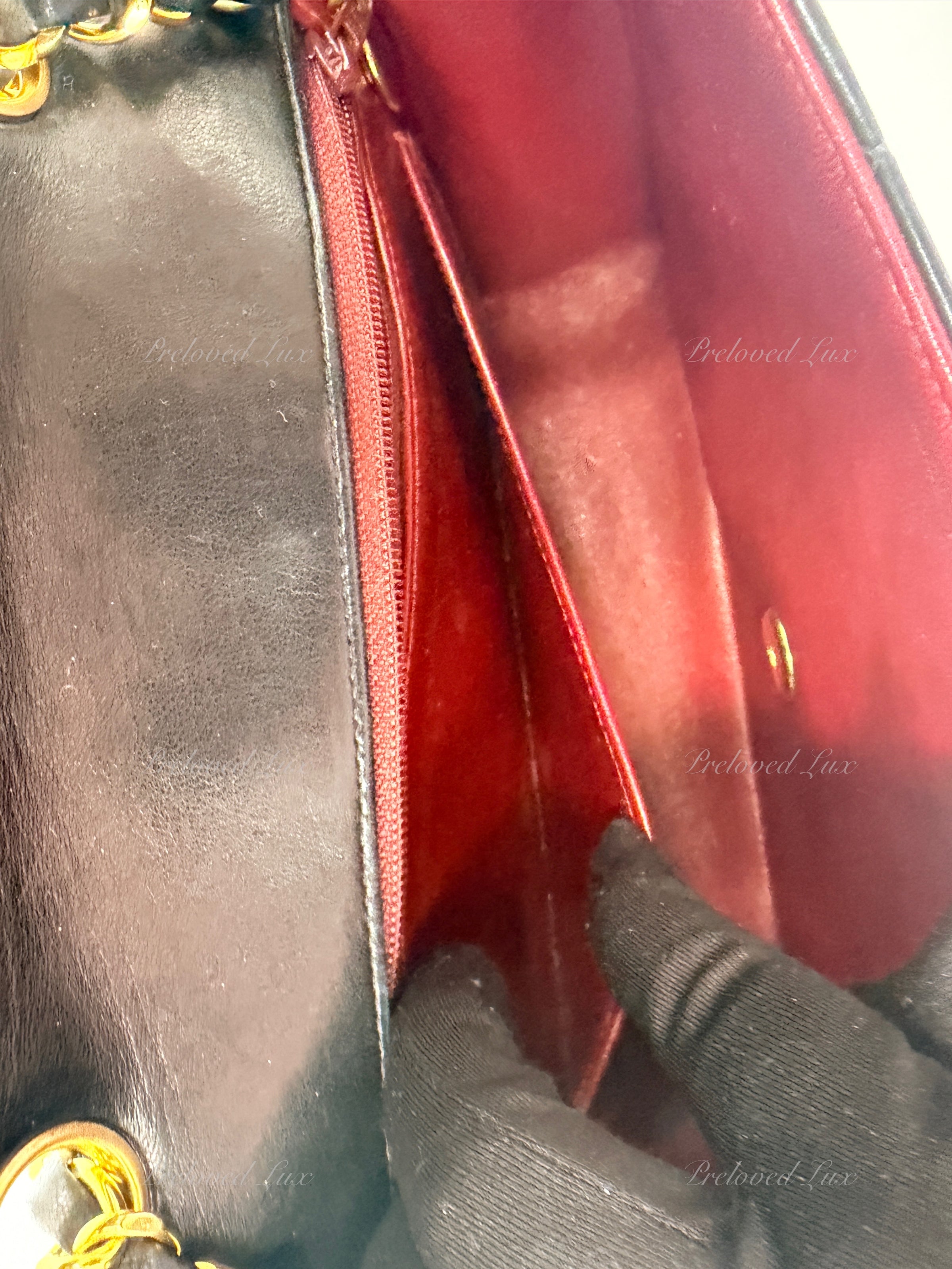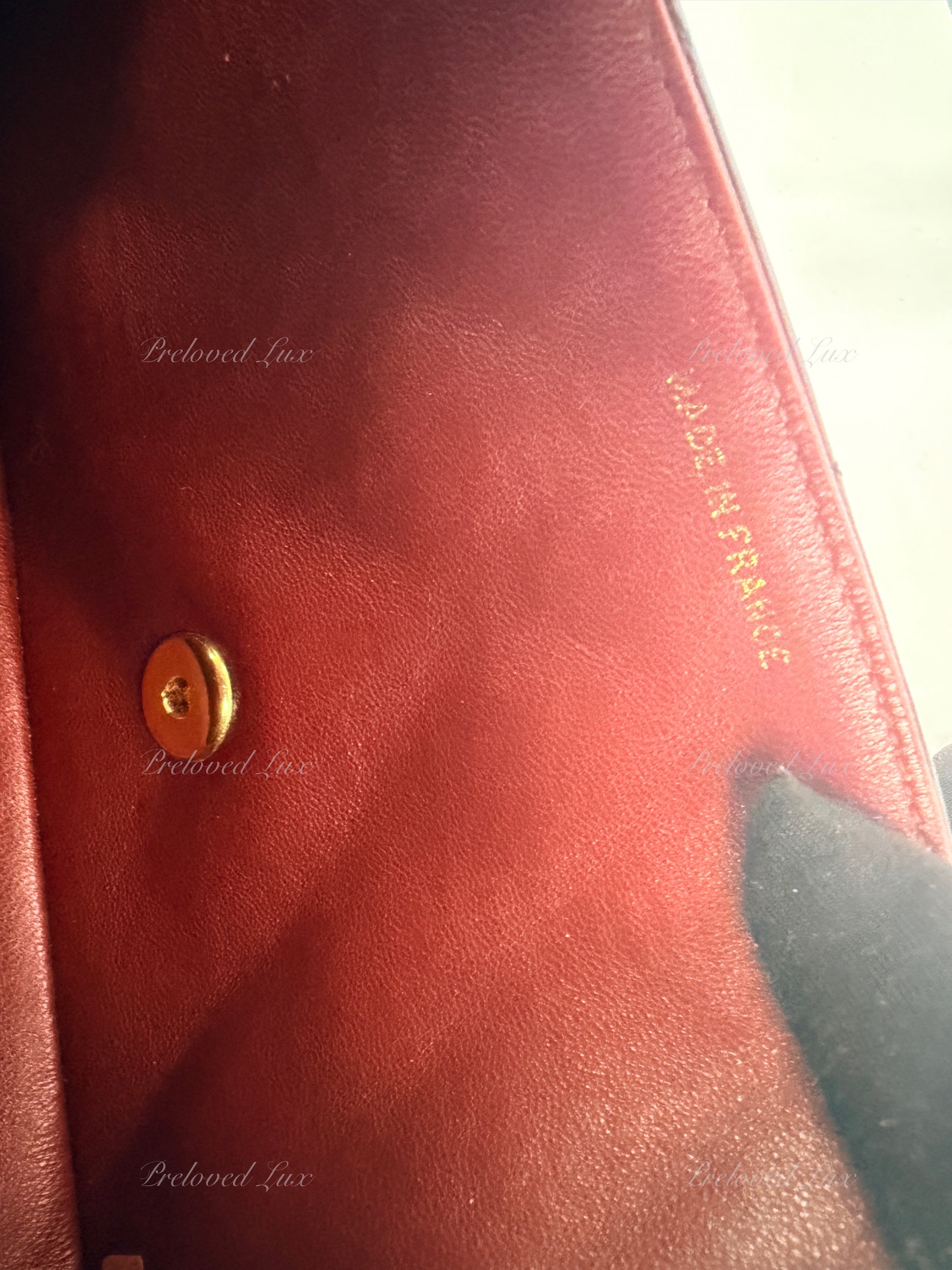 Outside: Good vintage condition, fine scratches on hardware. Some wrinkling/fine scratches/rubs/indentation on exterior leather.  Corners and edges of the flap with very mild unnoticeable rubs and scratches. Leather buttery smooth.
