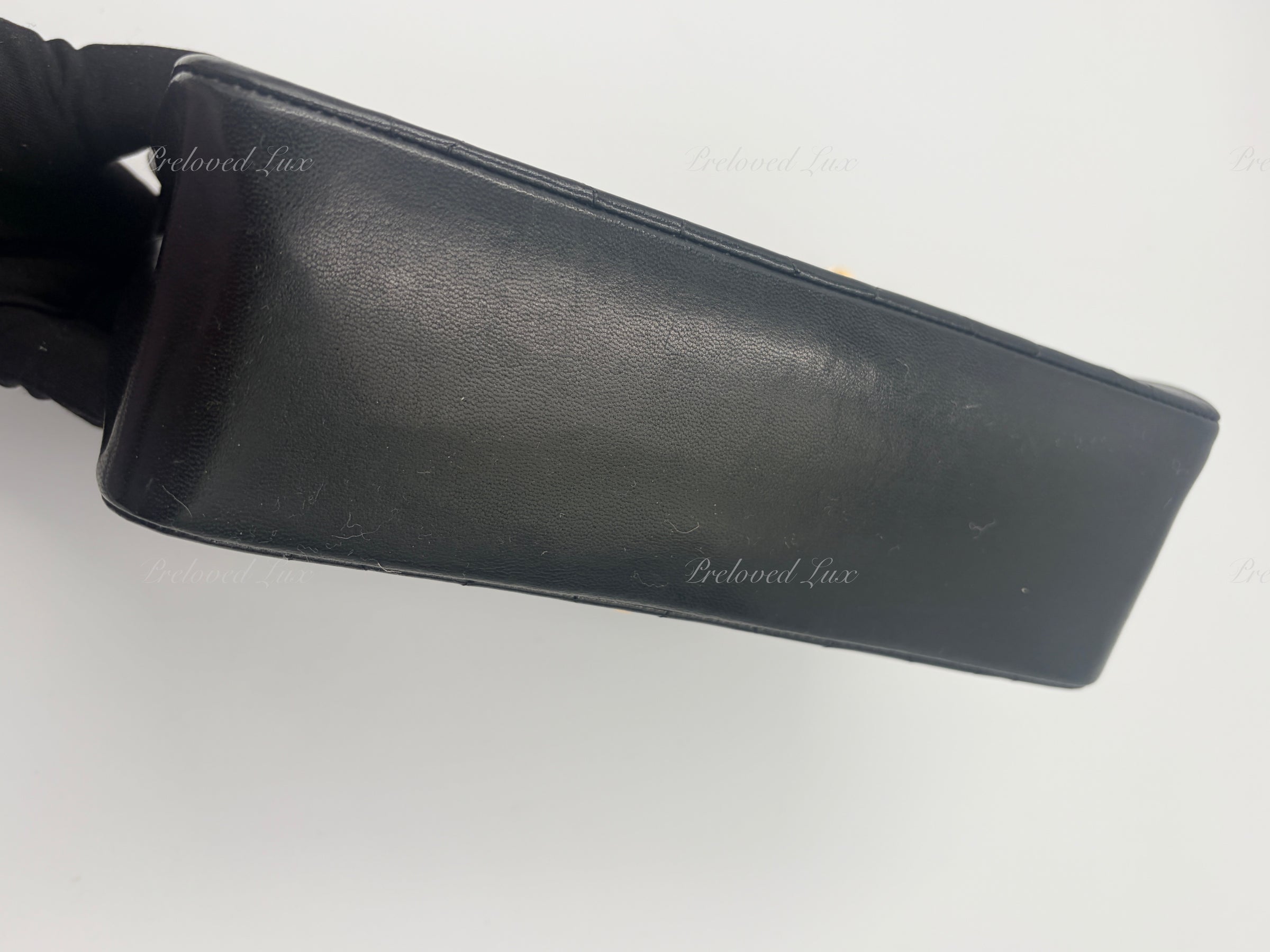 Strap: Minor scratches on hardware, gold hardware bright and shiny. Leather is rubbed but hard to see because of the black color.