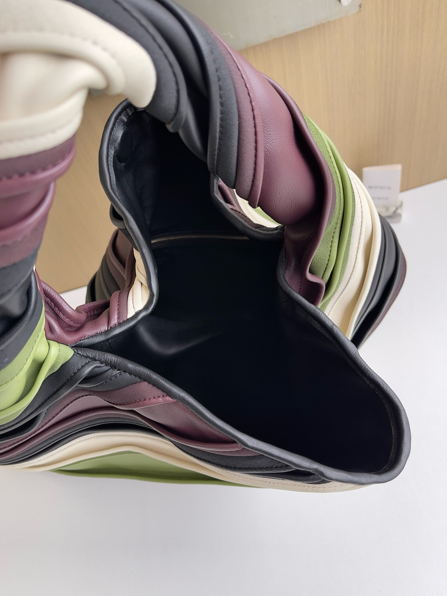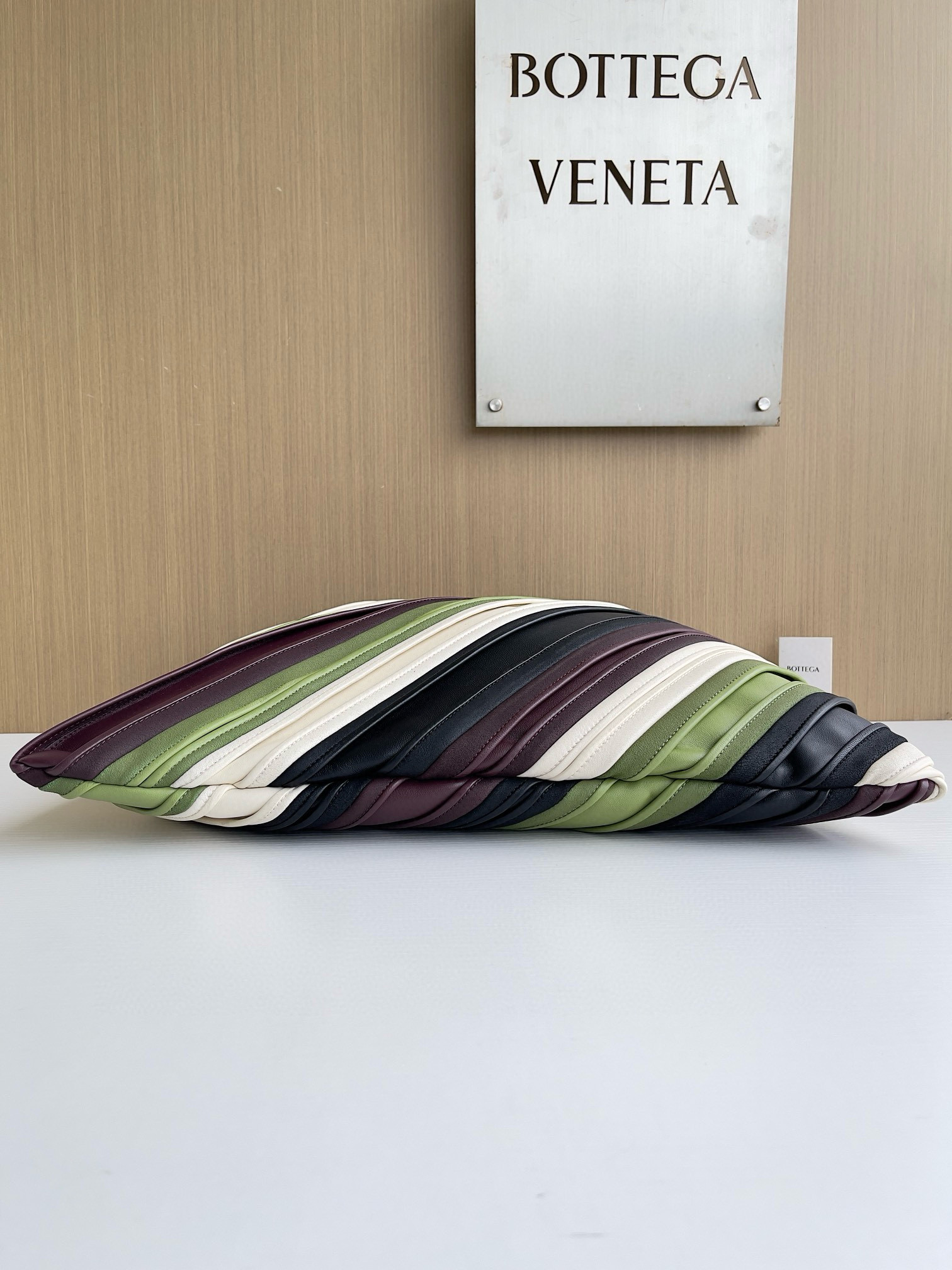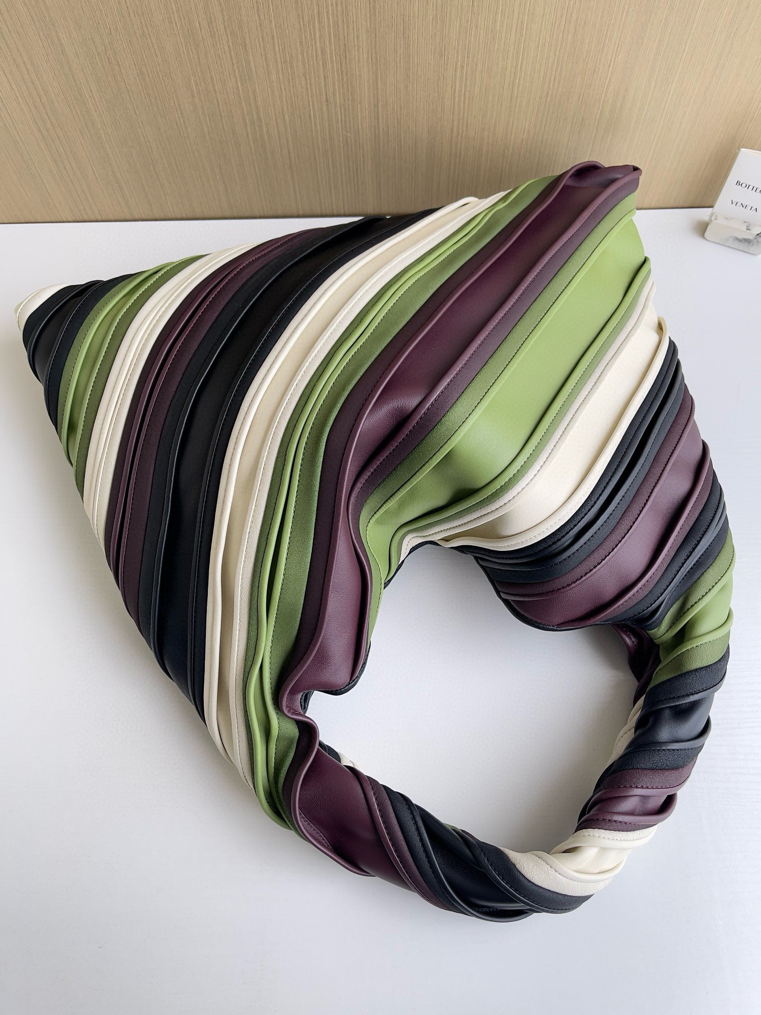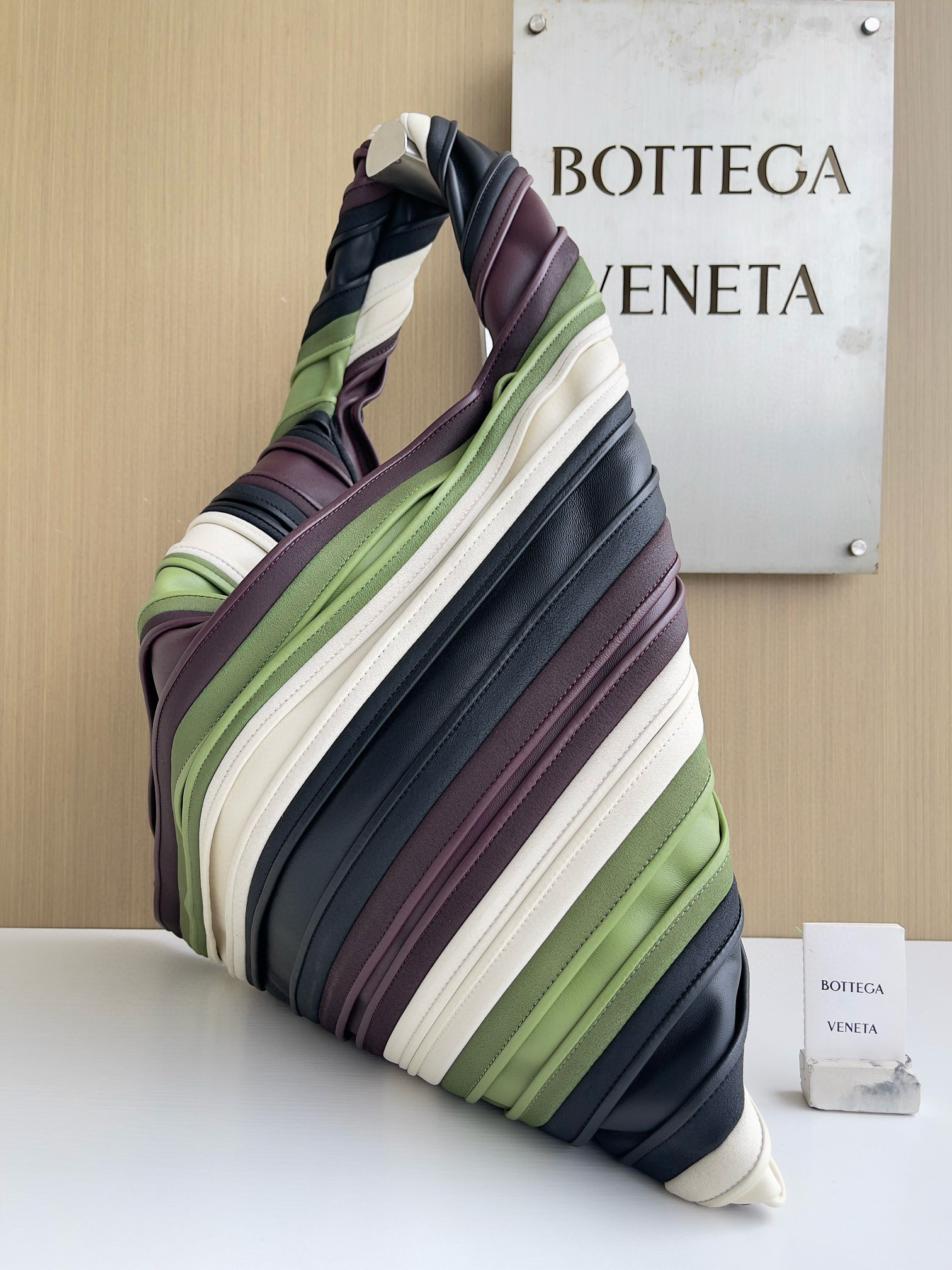 حقيبة Big Hop الجديدة من BOTTEGA VENETA، وهي حقيبة كتف كبيرة عصرية مخططة ومتعددة الألوان مصنوعة من شرائط جلد الماتشا والأبيض والتوتي، تذكرنا بالتنانير الجلدية الحيوانية للقبائل البدائية، المليئة بالأسلوب الغريب ومهارات النسيج الرائعة والانصهار الملهم بالطبيعة ، ألوان غنية، تصادم ألوان قوي، جلد قوي، خفة غير متوقعة، نعومة، صورة ظلية كبيرة، ملمس خفيف الوزن