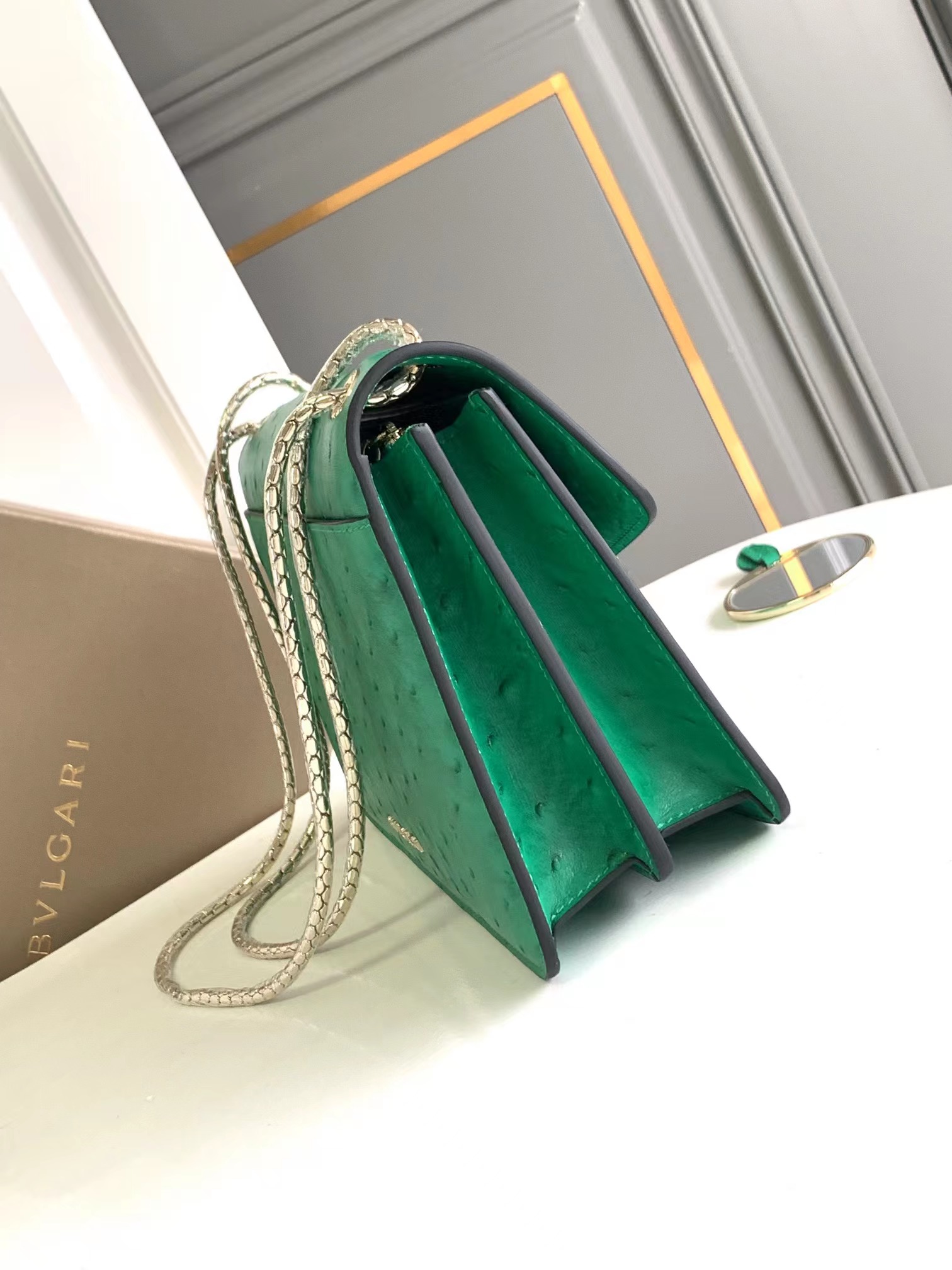 🔹مزودة بحجرتين، جيب أمامي، وجيب خلفي مقسم، وسحاب داخلي وجيب مفتوح، ومرآة مكياج قابلة للتخصيص، وشعار بولغري المعدني على الظهر