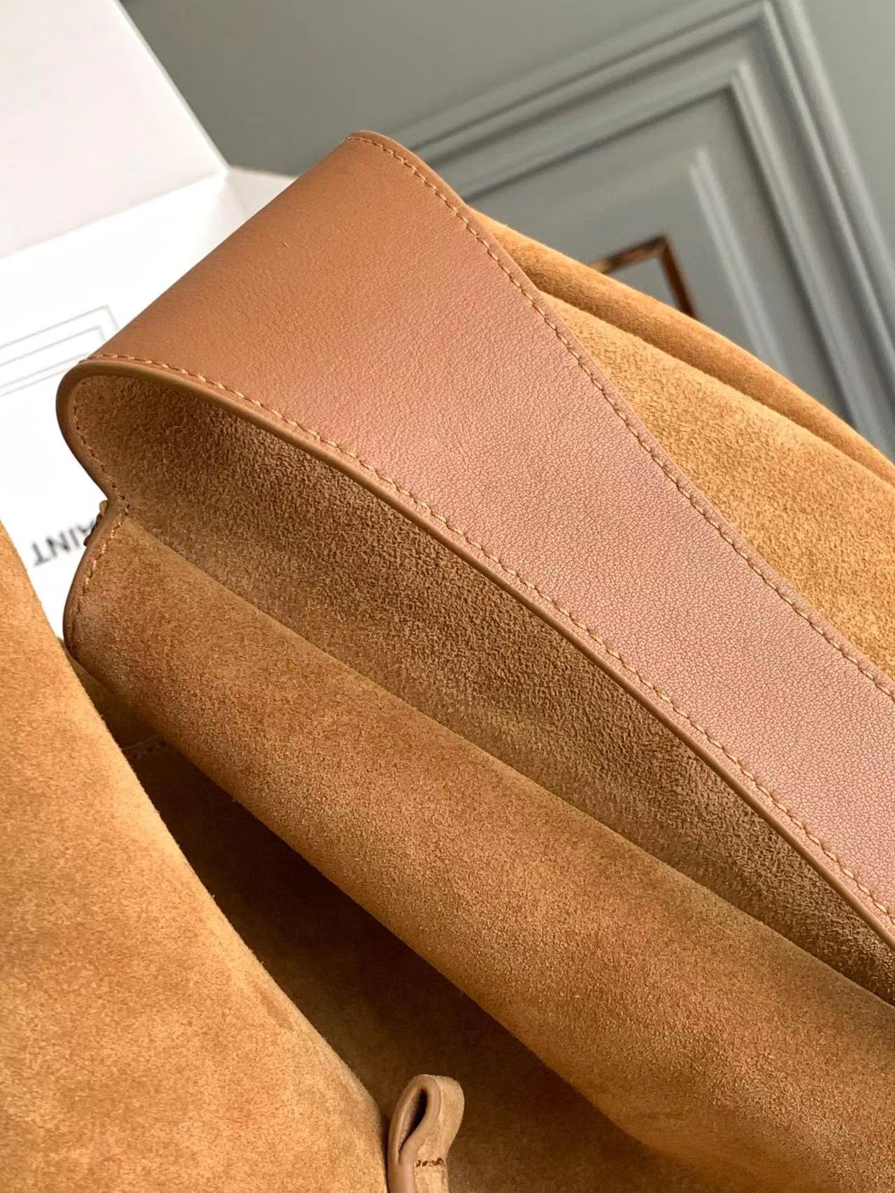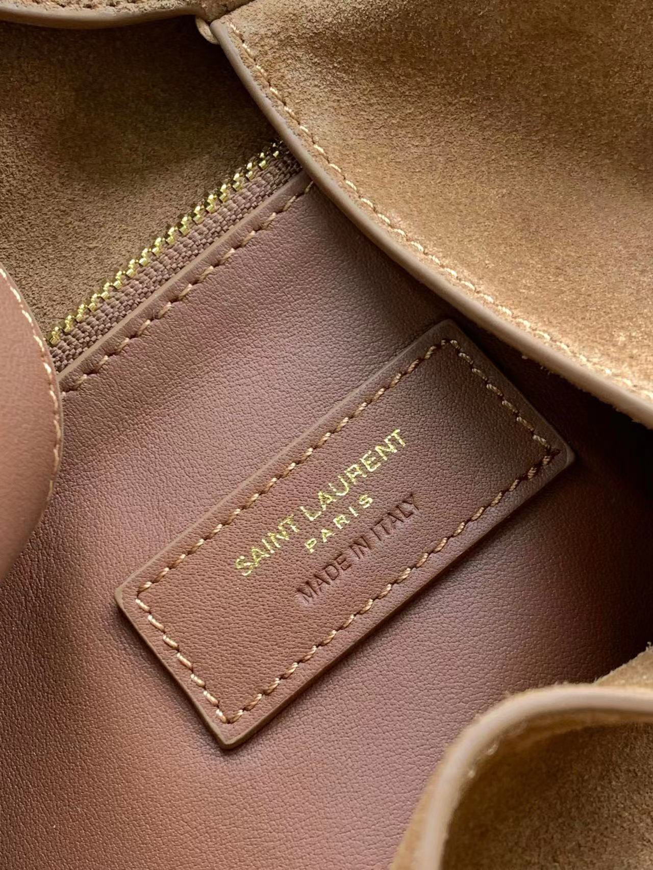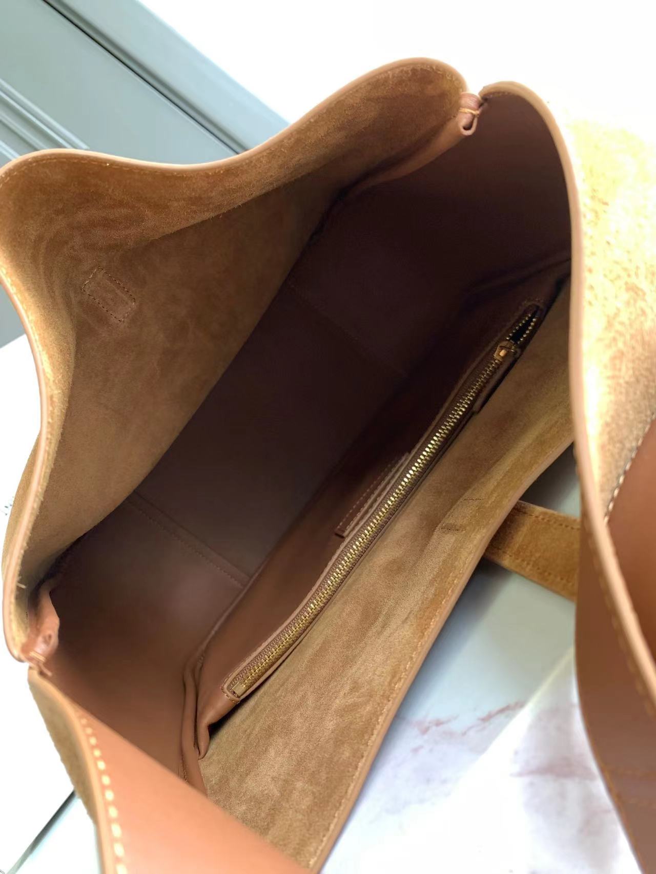 مبطن بجلد سويدي متناغم ويحتوي على قسمين رئيسيين وجيب داخلي بسحاب.