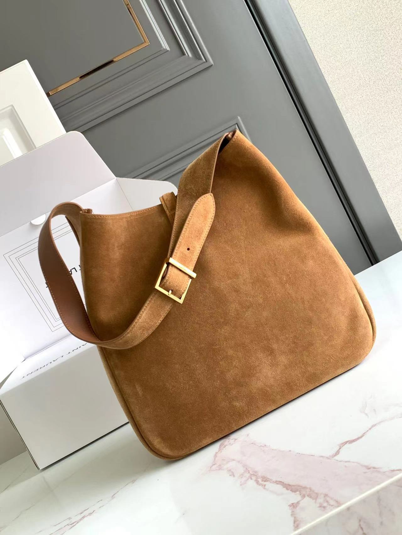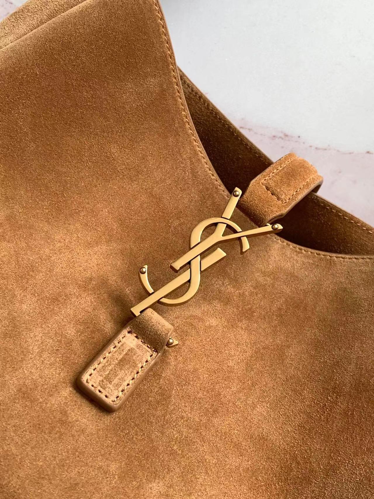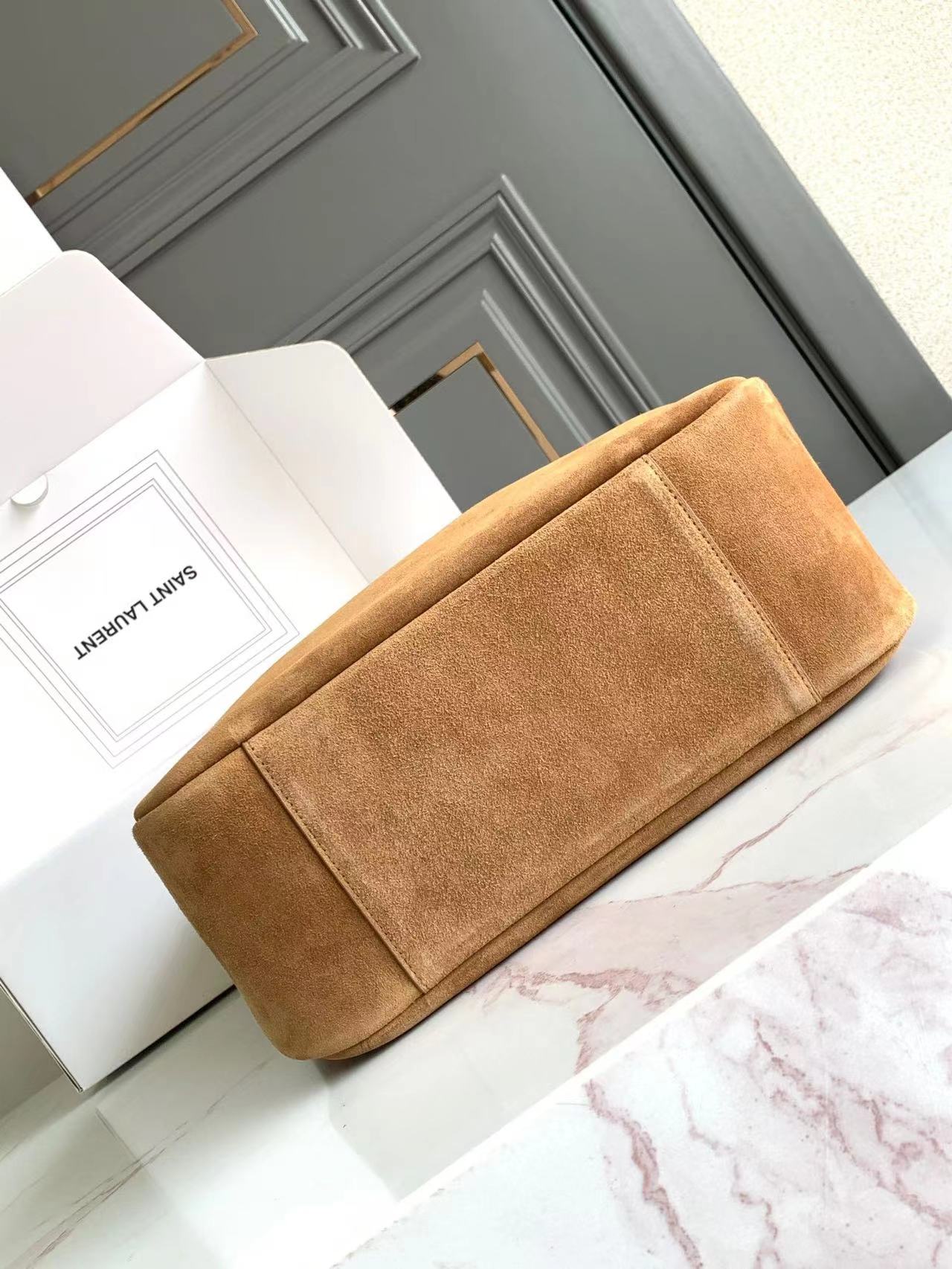 مبطن بجلد سويدي متناغم ويحتوي على قسمين رئيسيين وجيب داخلي بسحاب.