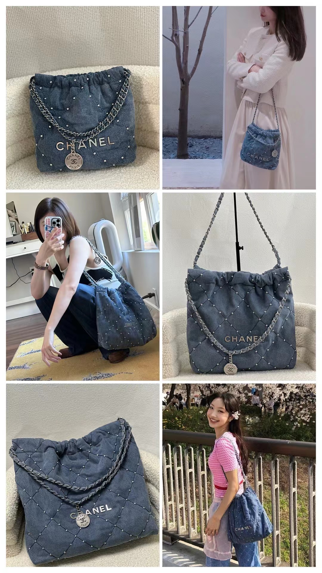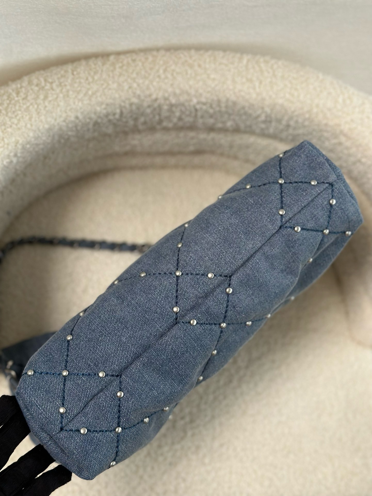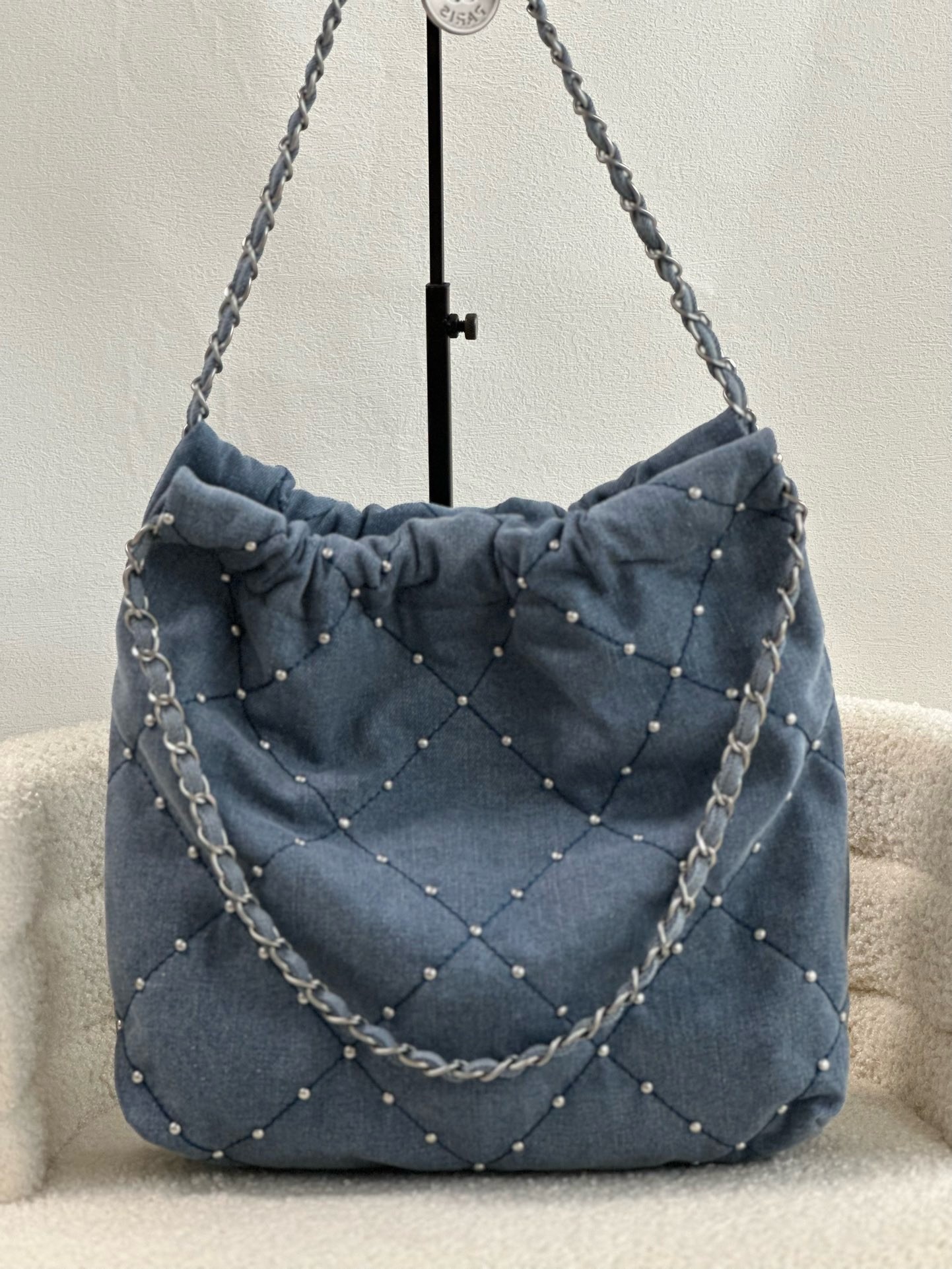24 حقيبة من الدنيم 22 حقيبة قادمة🔥 لون الدنيم المغسول الفاتح + تصميم برشام فضي، شبابي ومرح، تصميم البرشام يبدو مثل اللؤلؤ من مسافة بعيدة، مما يضيف القليل من المزاج المهذب ~
