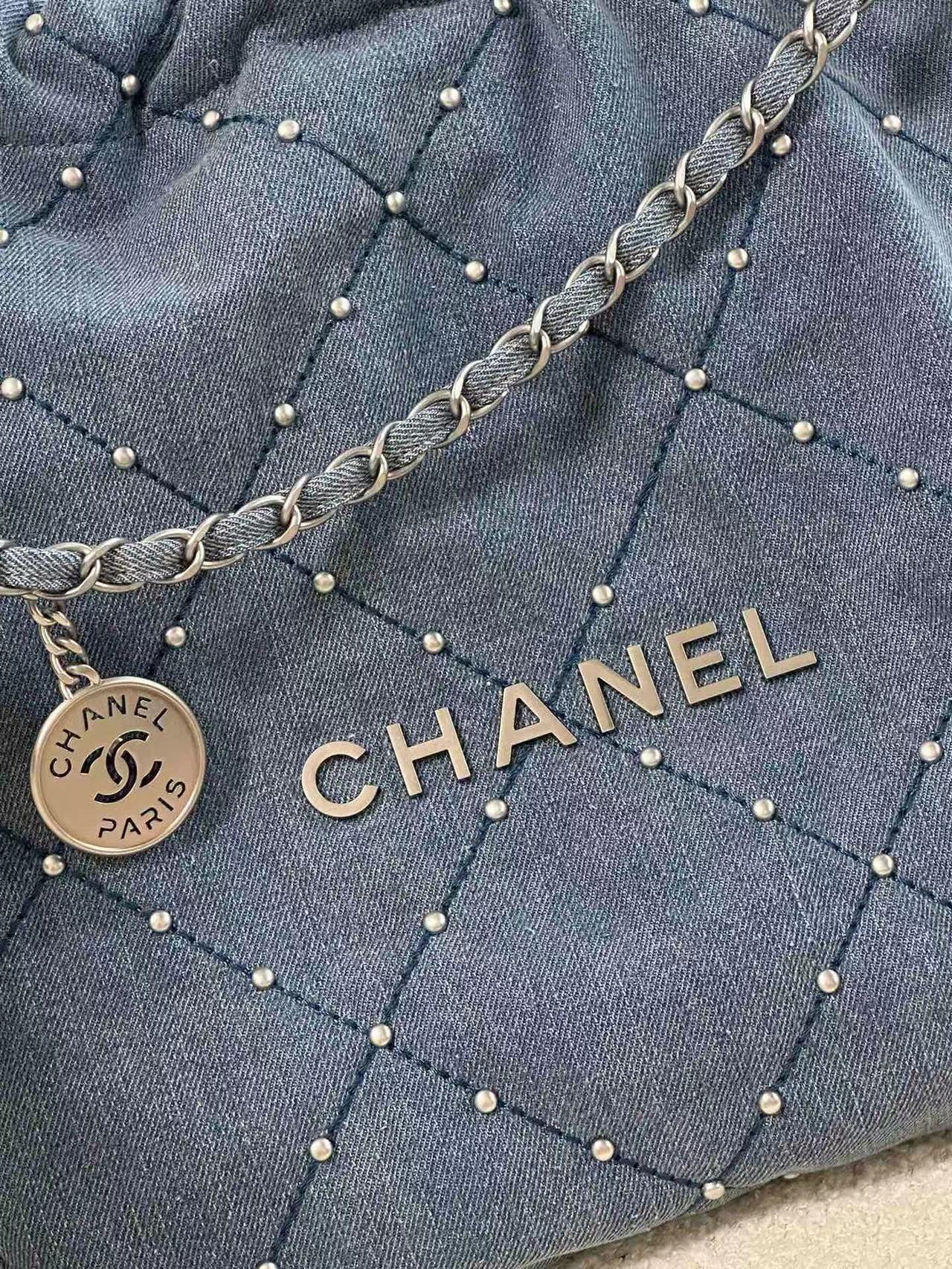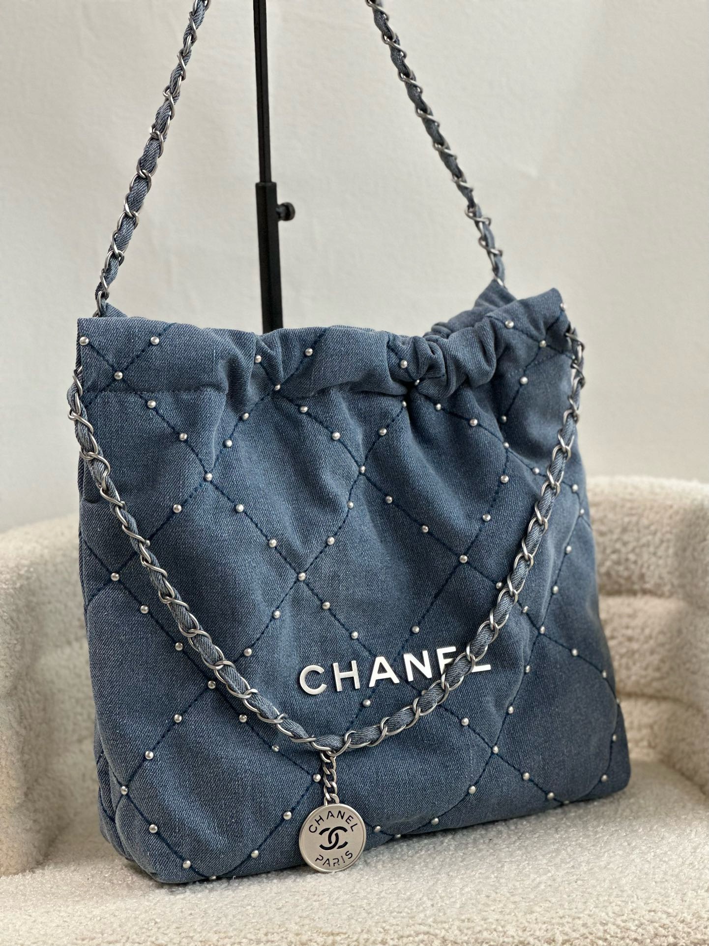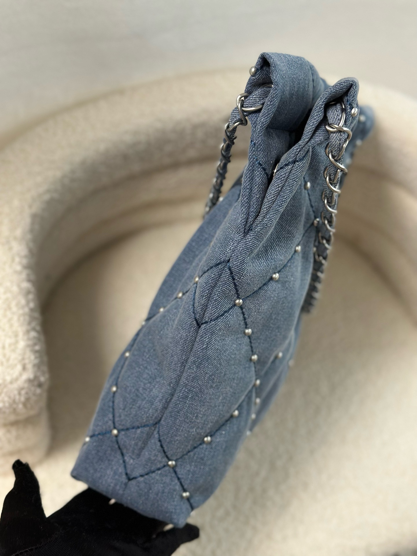 24 حقيبة من الدنيم 22 حقيبة قادمة🔥 لون الدنيم المغسول الفاتح + تصميم برشام فضي، شبابي ومرح، تصميم البرشام يبدو مثل اللؤلؤ من مسافة بعيدة، مما يضيف القليل من المزاج المهذب ~
