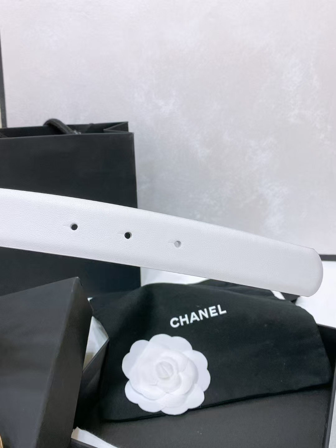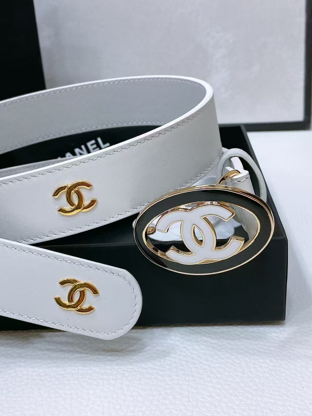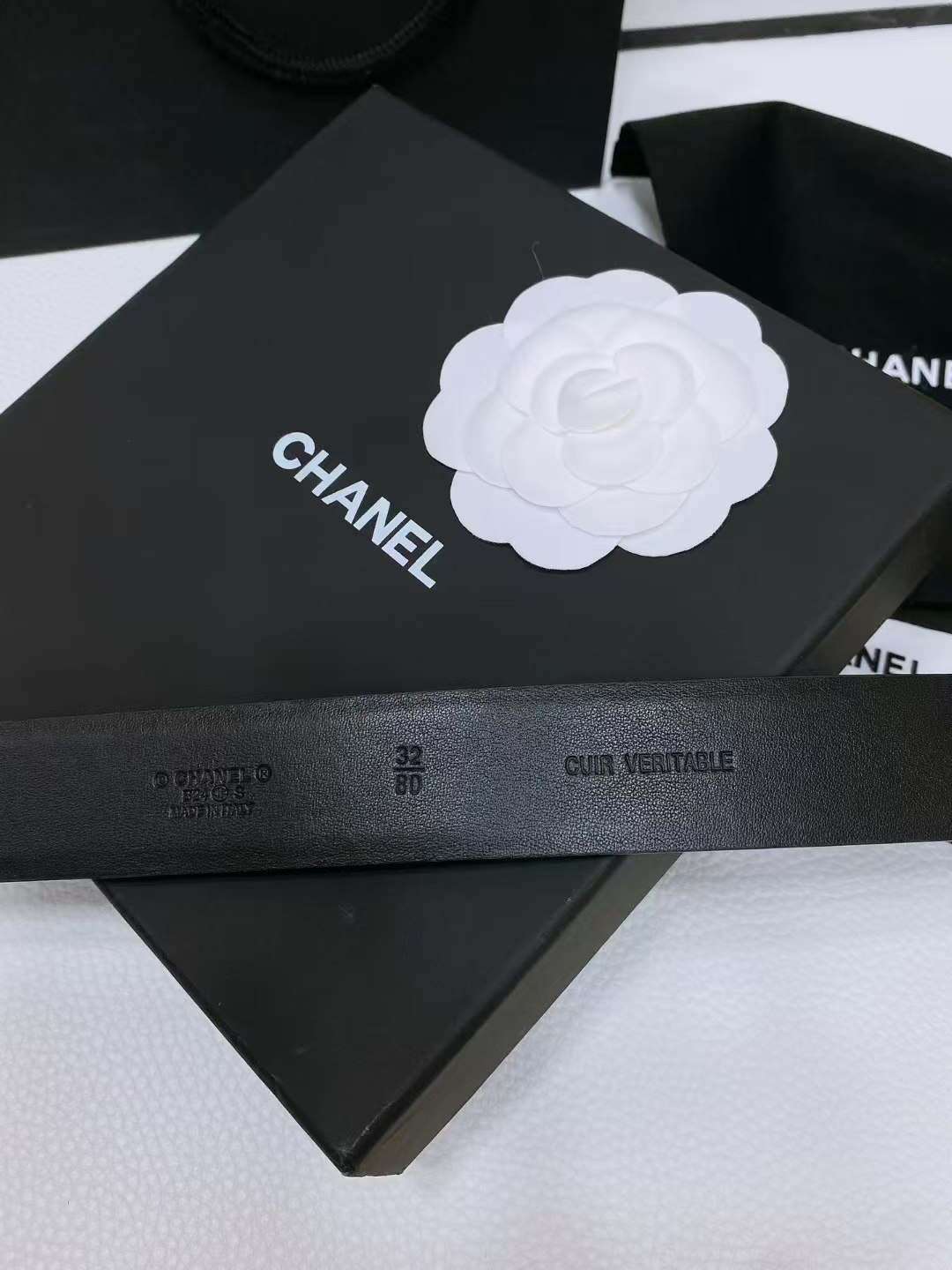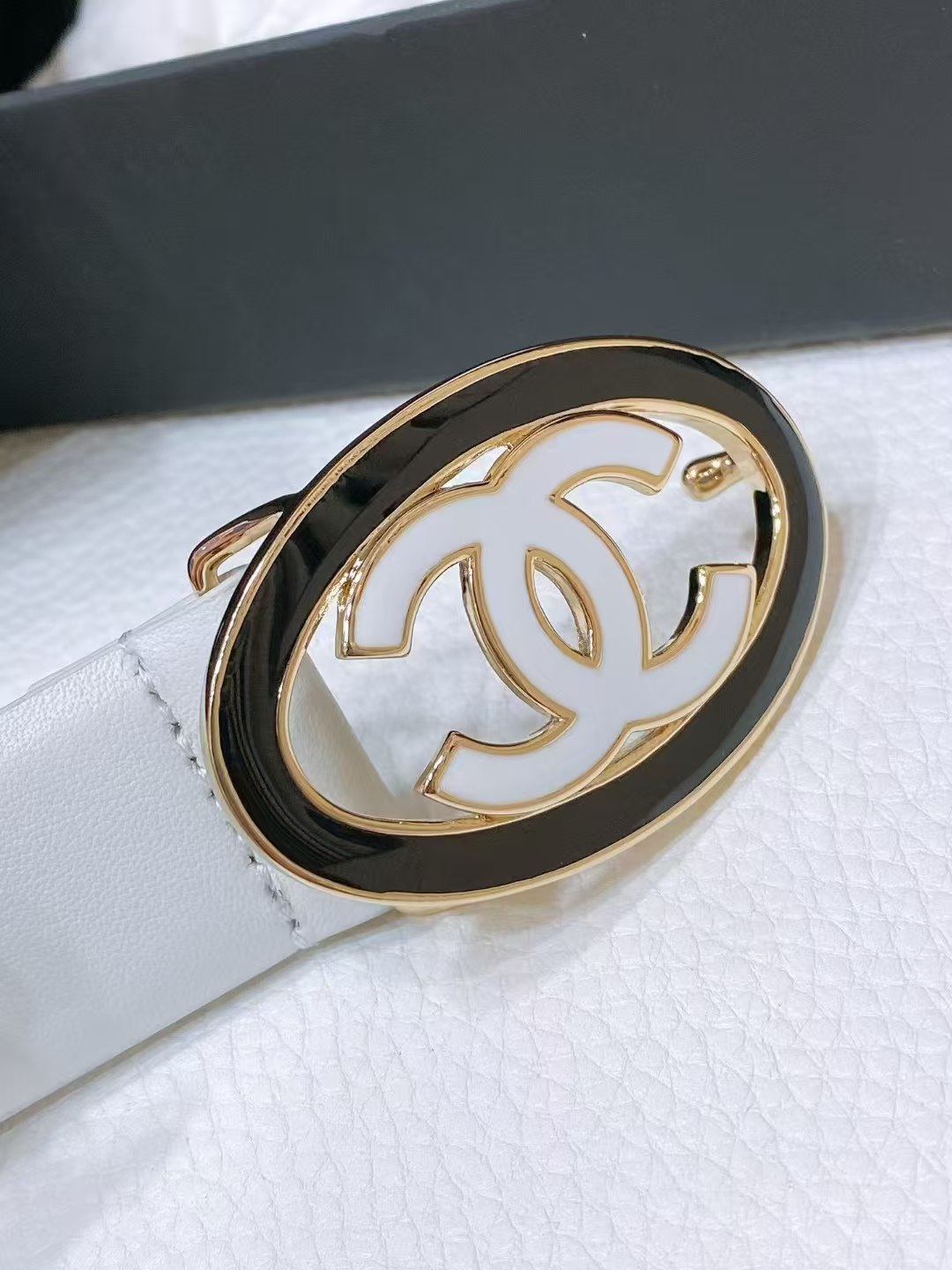 شانيل 24C نحاسي معدني حجر الراين أبيض وأسود شعار مشبك نحاسي معدني مستورد من جلد البقر الجنيني حزام عادي مزين بشعار cc صغير يشعر بالنعومة والحساسة 3.0 سم