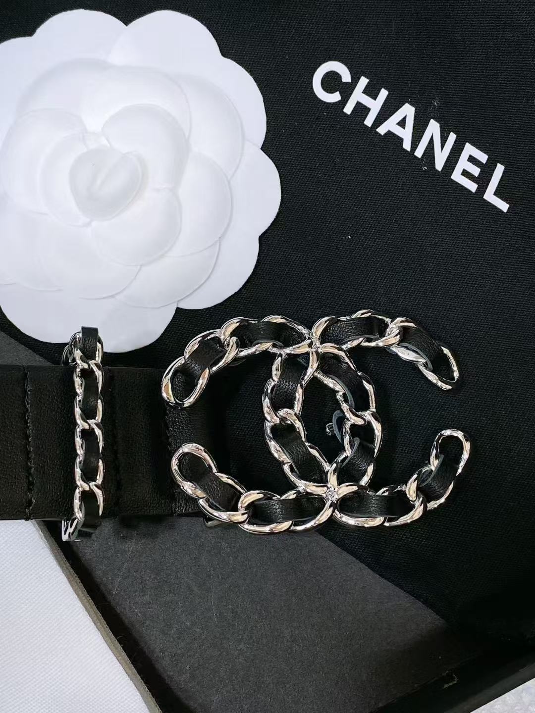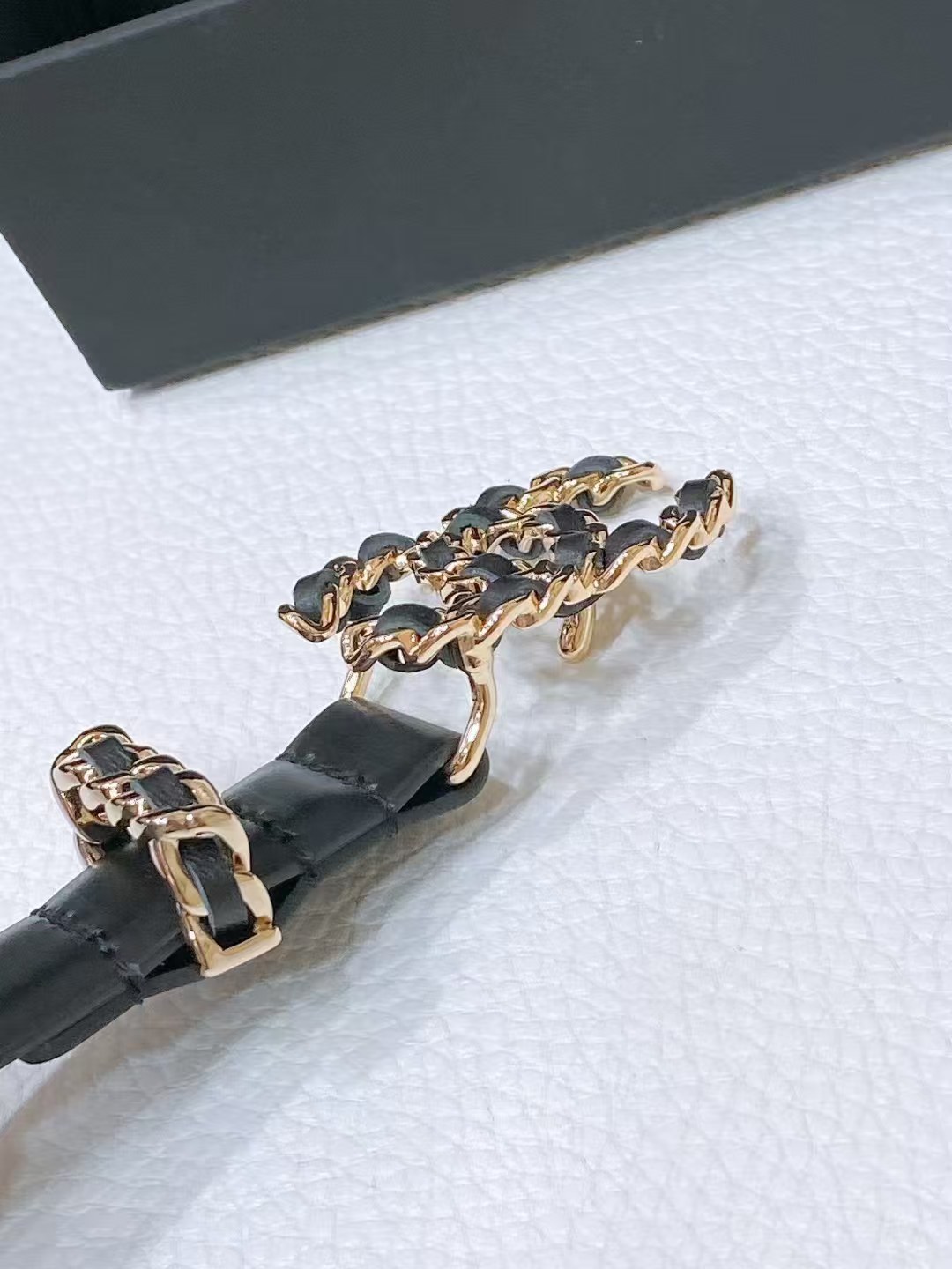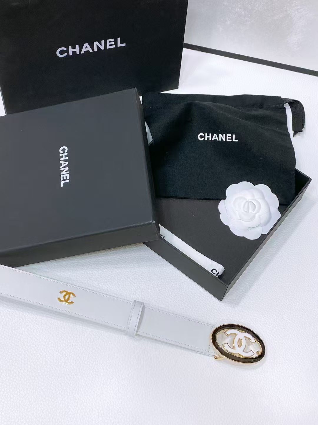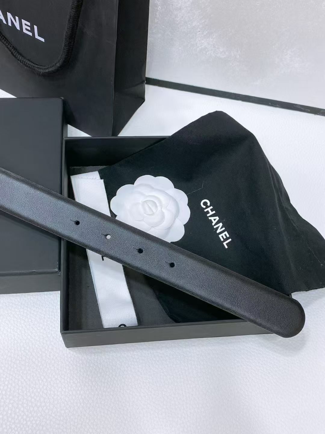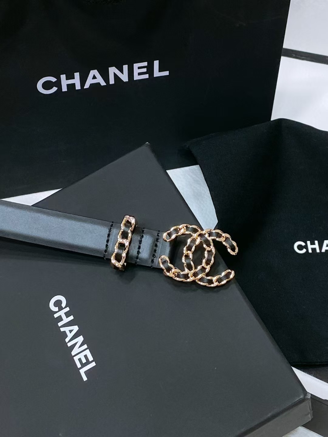 شانيل 24C نحاسي معدني حجر الراين أبيض وأسود شعار مشبك نحاسي معدني مستورد من جلد البقر الجنيني حزام عادي مزين بشعار cc صغير يشعر بالنعومة والحساسة 3.0 سم