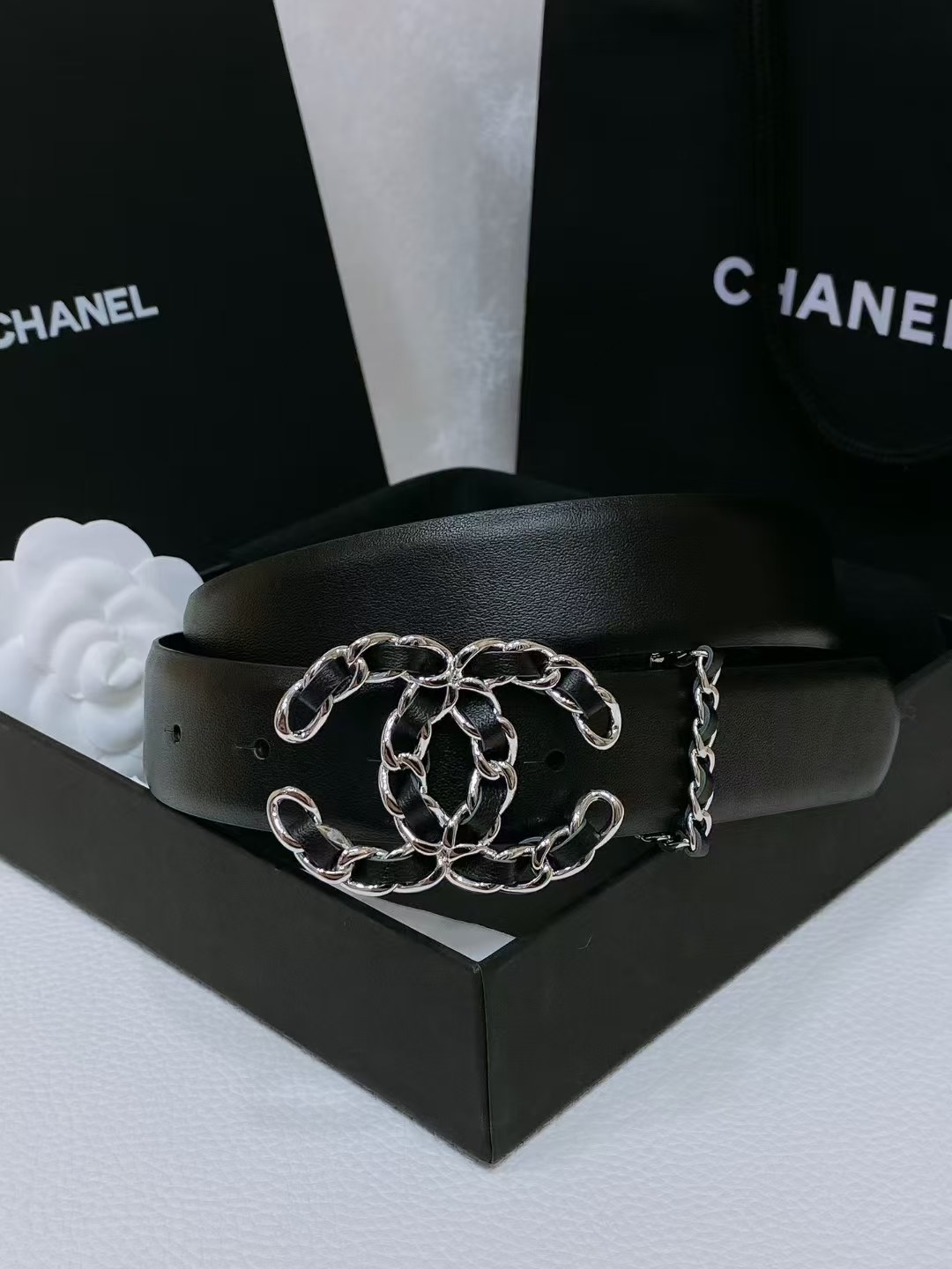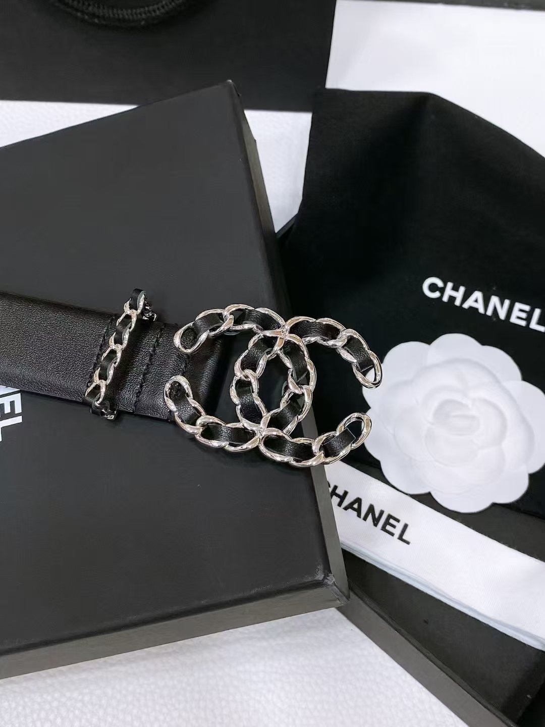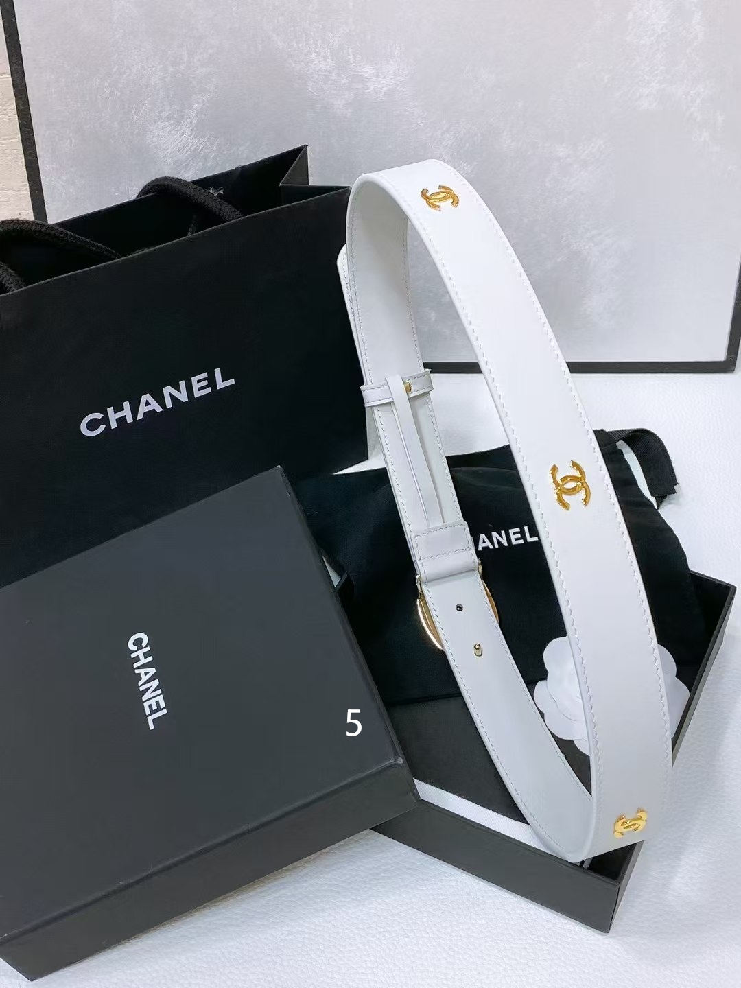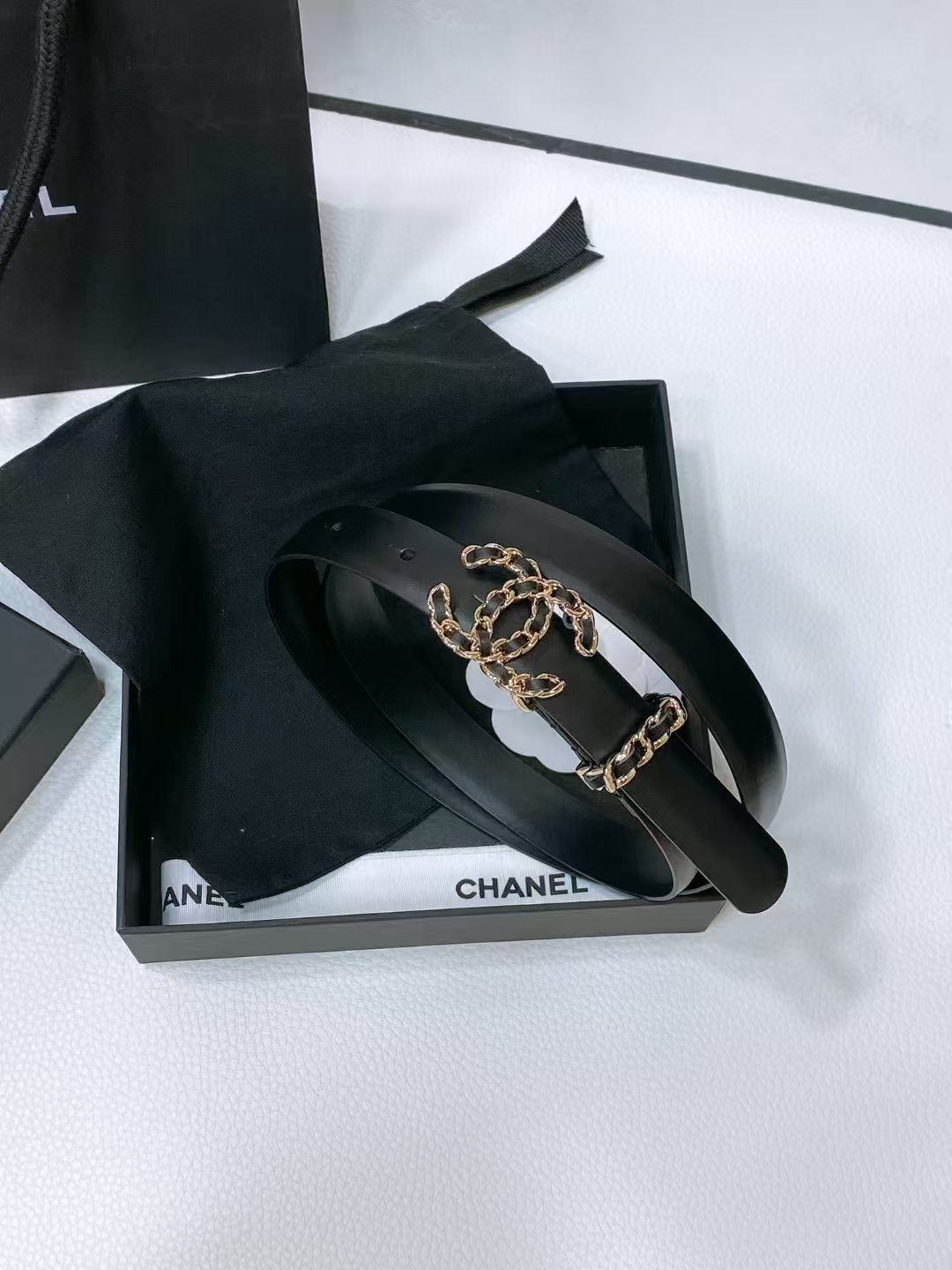 شانيل 24C نحاسي معدني حجر الراين أبيض وأسود شعار مشبك نحاسي معدني مستورد من جلد البقر الجنيني حزام عادي مزين بشعار cc صغير يشعر بالنعومة والحساسة 3.0 سم