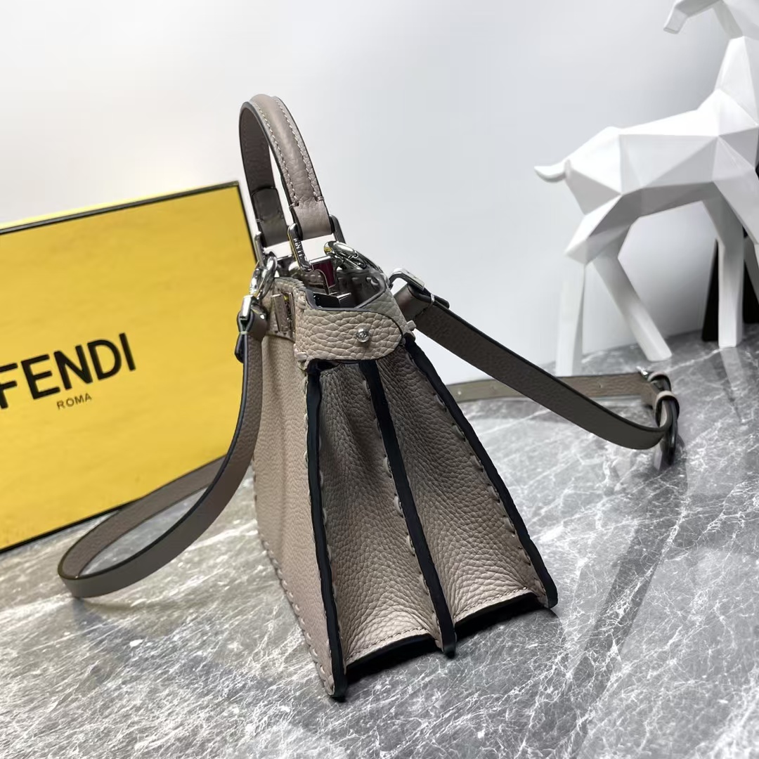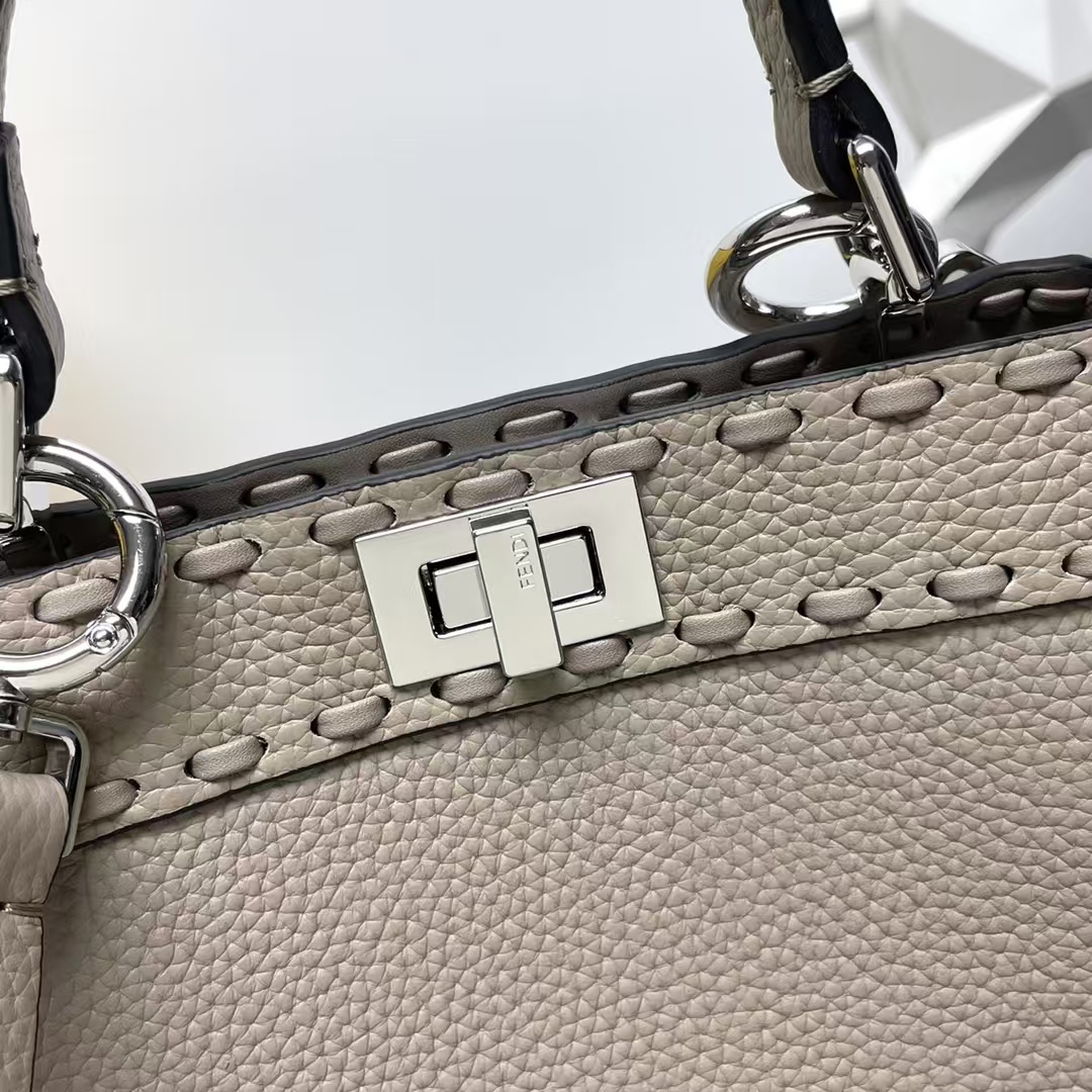 Fend Iconic Peekaboo ISeeU Mini مصنوعة من جلد العجل المستورد، ومخيطة يدويًا بخياطة كبيرة من نفس اللون، ومزينة بأقفال كلاسيكية ملتوية، ومجهزة بمقابض وحمالات كتف قابلة للتعديل والفصل، ويمكن حملها باليد أو عبر الجسم.
