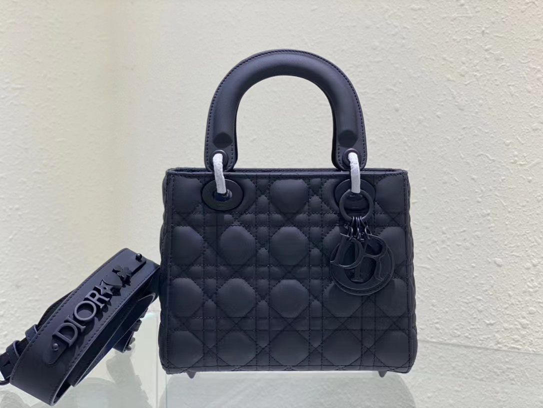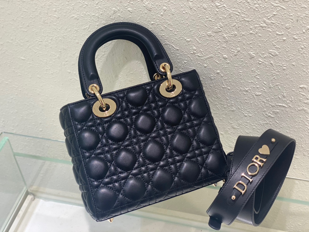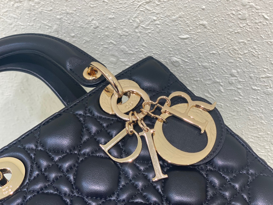 تجسّد حقيبة Lady Dior My ABCDior رؤية Dior العميقة للأناقة والجمال. مصنوع بعناية من جلد الغنم الأسود، مع خياطة علوية بنمط كاناج لخلق تفاصيل مبطنة لافتة للنظر، التصميم الأنيق والأنيق لا يتأثر بمرور الزمن. مزين بحلية D.I.O.R. من المعدن المطلي باللون الذهبي الفاتح لمظهر أنيق. طراز صغير مكون من أربعة أقسام بتصميم فريده، يمكن تزيين حزام الكتف بشارة لإظهار شخصيتك، ويمكن حمله باليد أو حول الجسم. الأبعاد: 20 × 17 × 8 سم