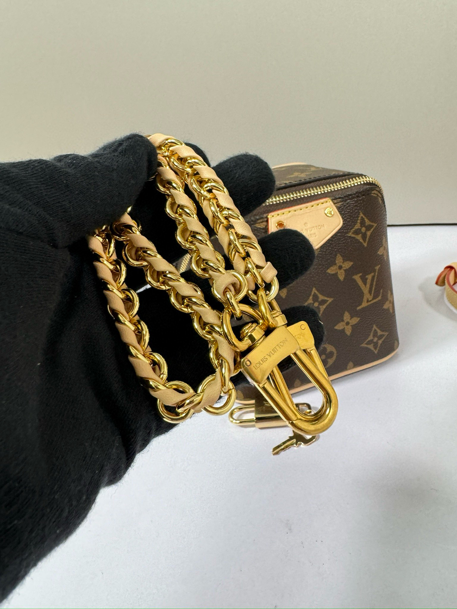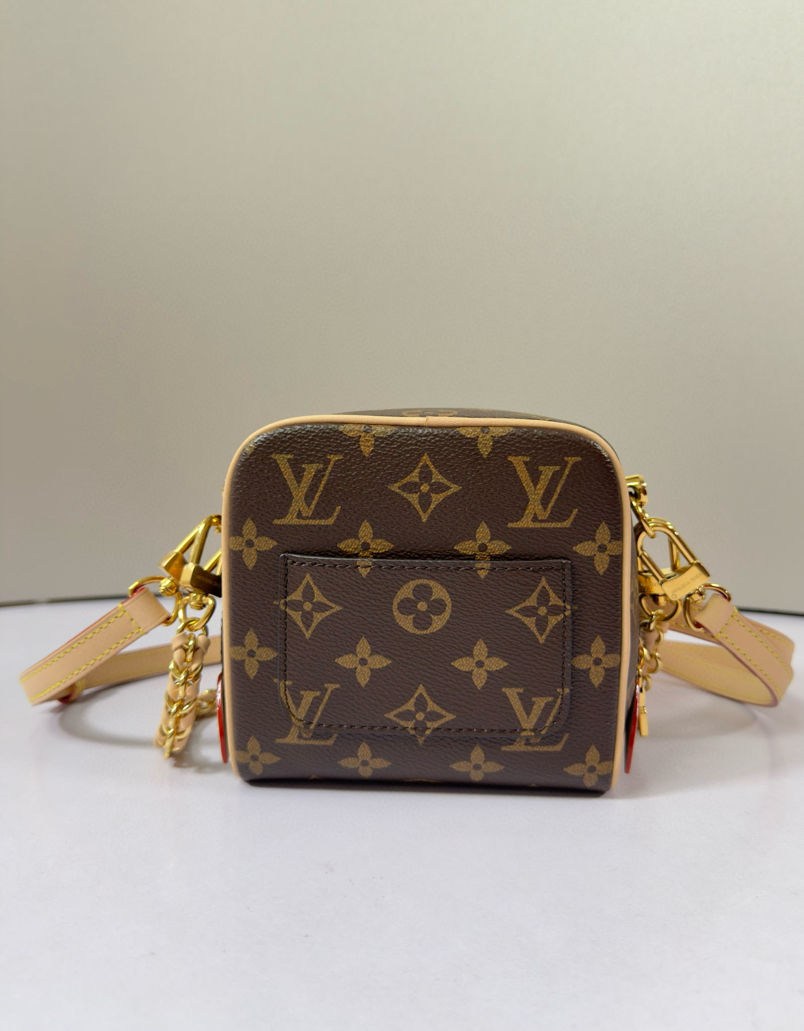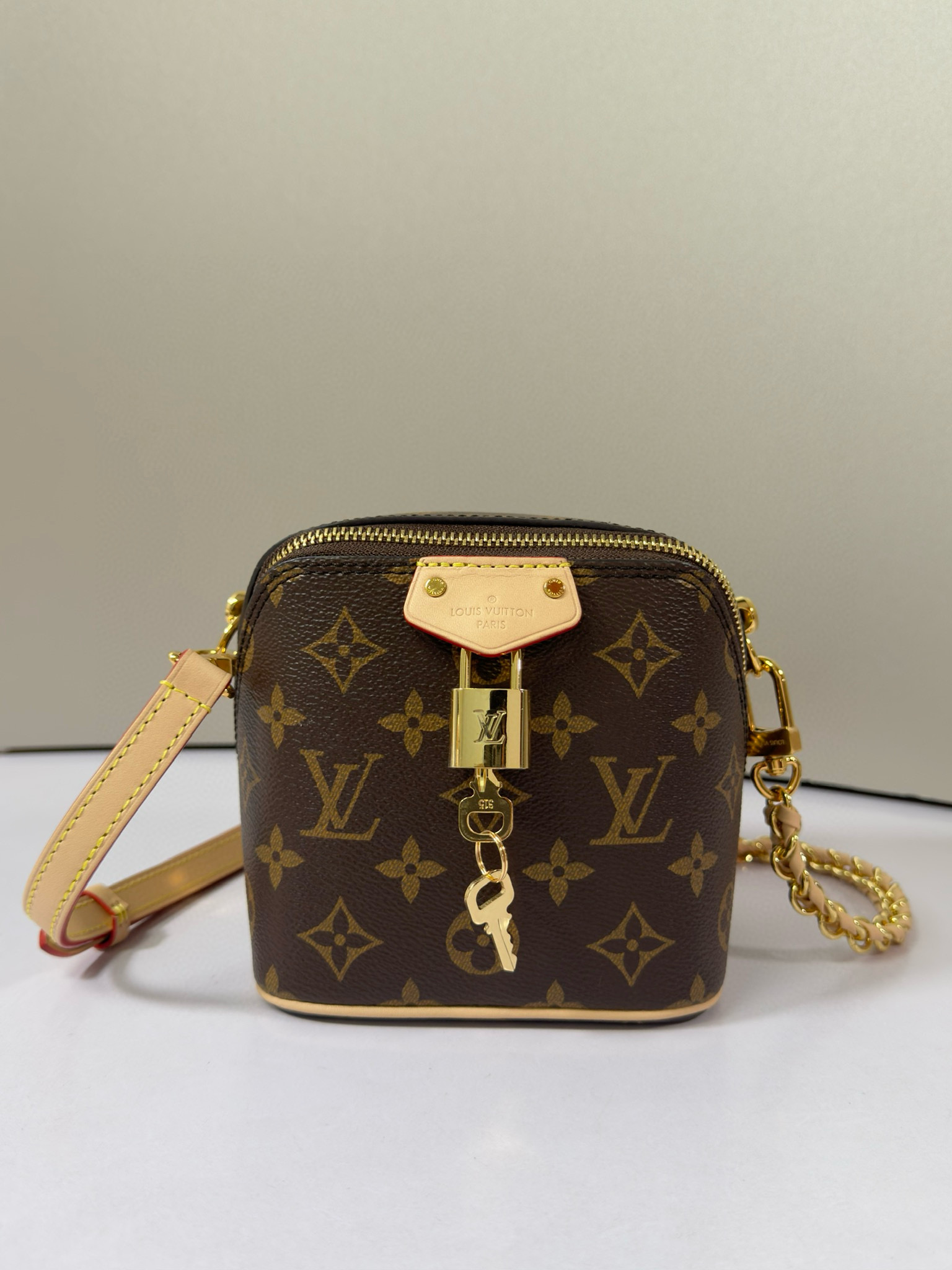 تعود حقيبة اليد Just In Case إلى تراث السفر الخاص بالعلامة التجارية، وهي مصنوعة من قماش Monogram وجلد البقر لخلق شكل مضغوط يمكنه استيعاب الهواتف المحمولة والمفاتيح ومستحضرات التجميل وغيرها من الضروريات اليومية. يظهر القفل وحقيبة المفاتيح تفاصيل كلاسيكية، كما أن السلسلة الجلدية المضفرة وحزام الكتف الجلدي قابلان للفصل، مما يسمح لك بالتبديل إلى خيارات الحمل الحديثة.