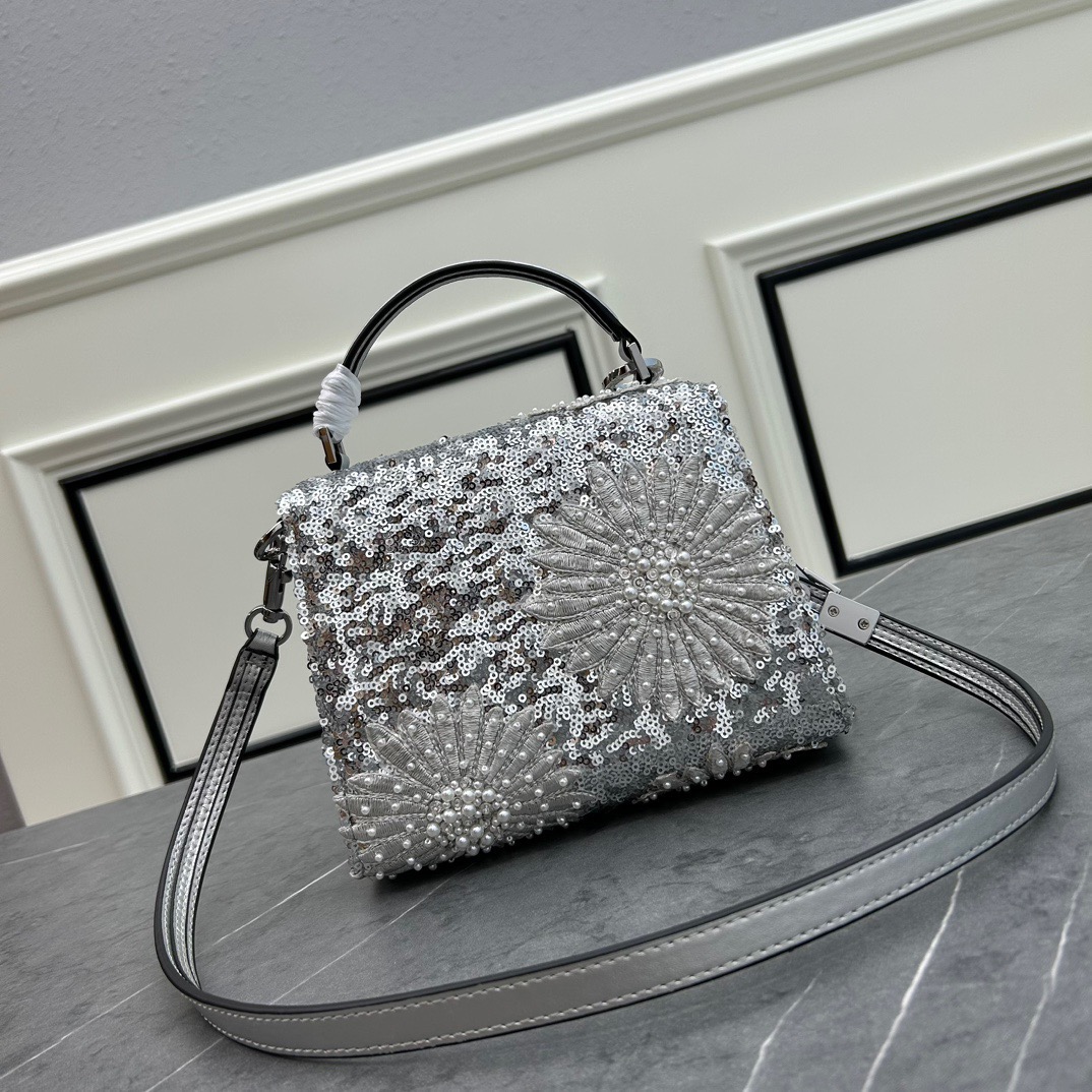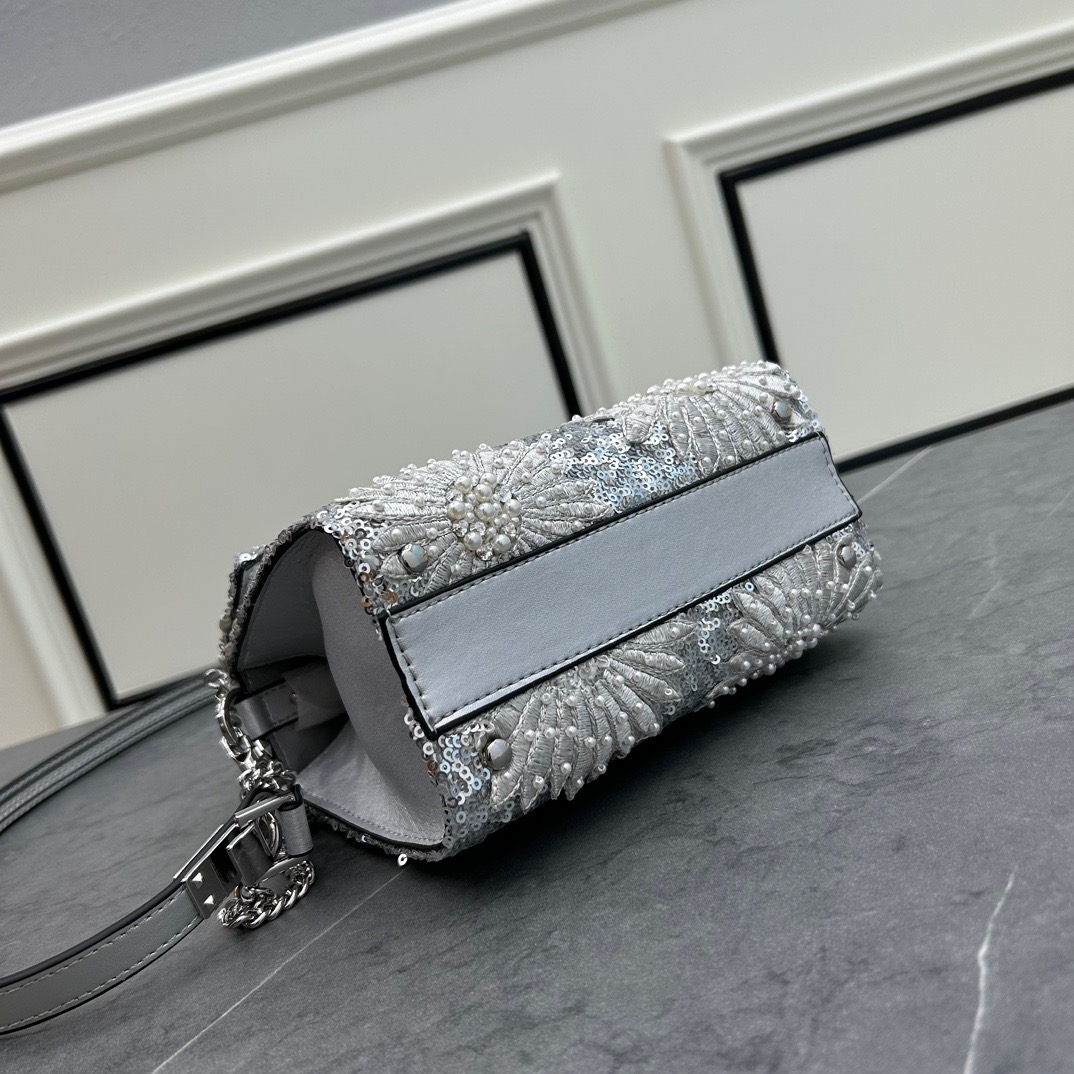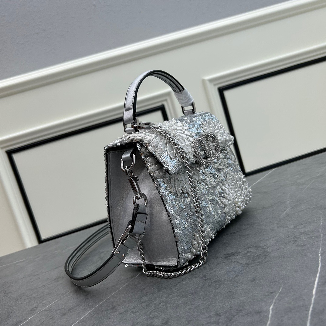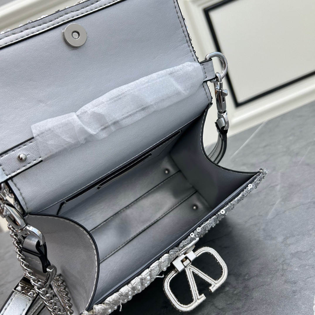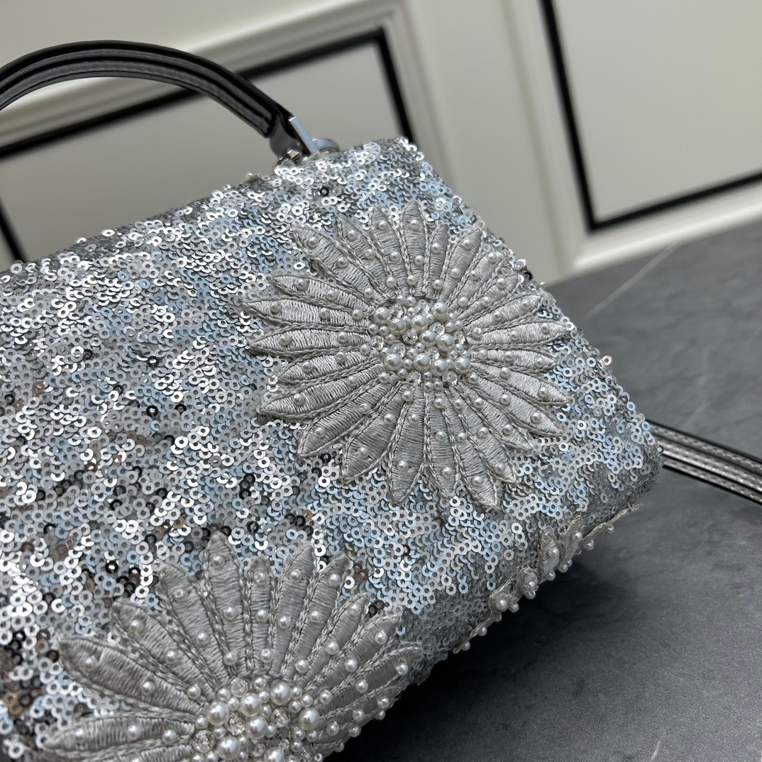 حقيبة يد مطرزة بعباد الشمس مع تصميم مطرز يدويًا بالكريستال والخرز والترتر وإغلاق بشعار VLogo. حزام كتف بطول قابل للتعديل للارتداء على الكتف أو الجسم.