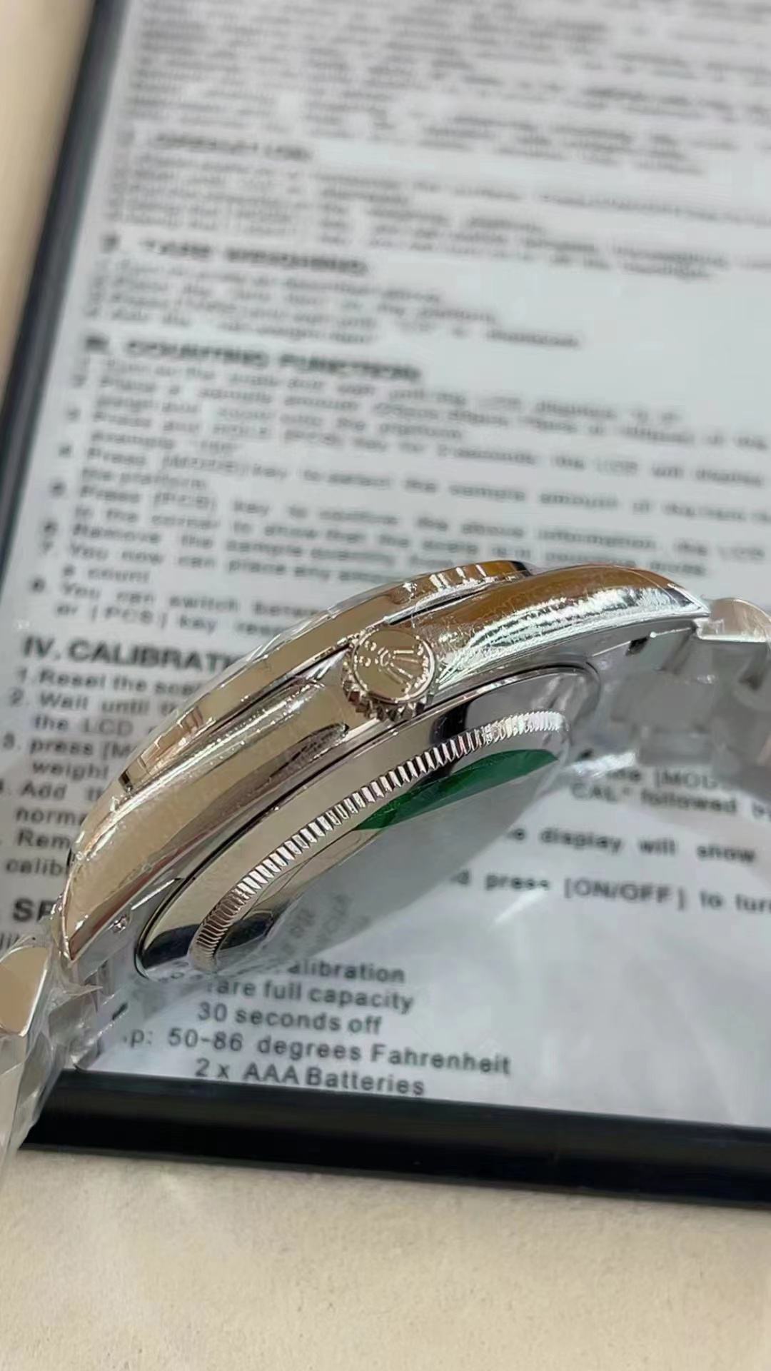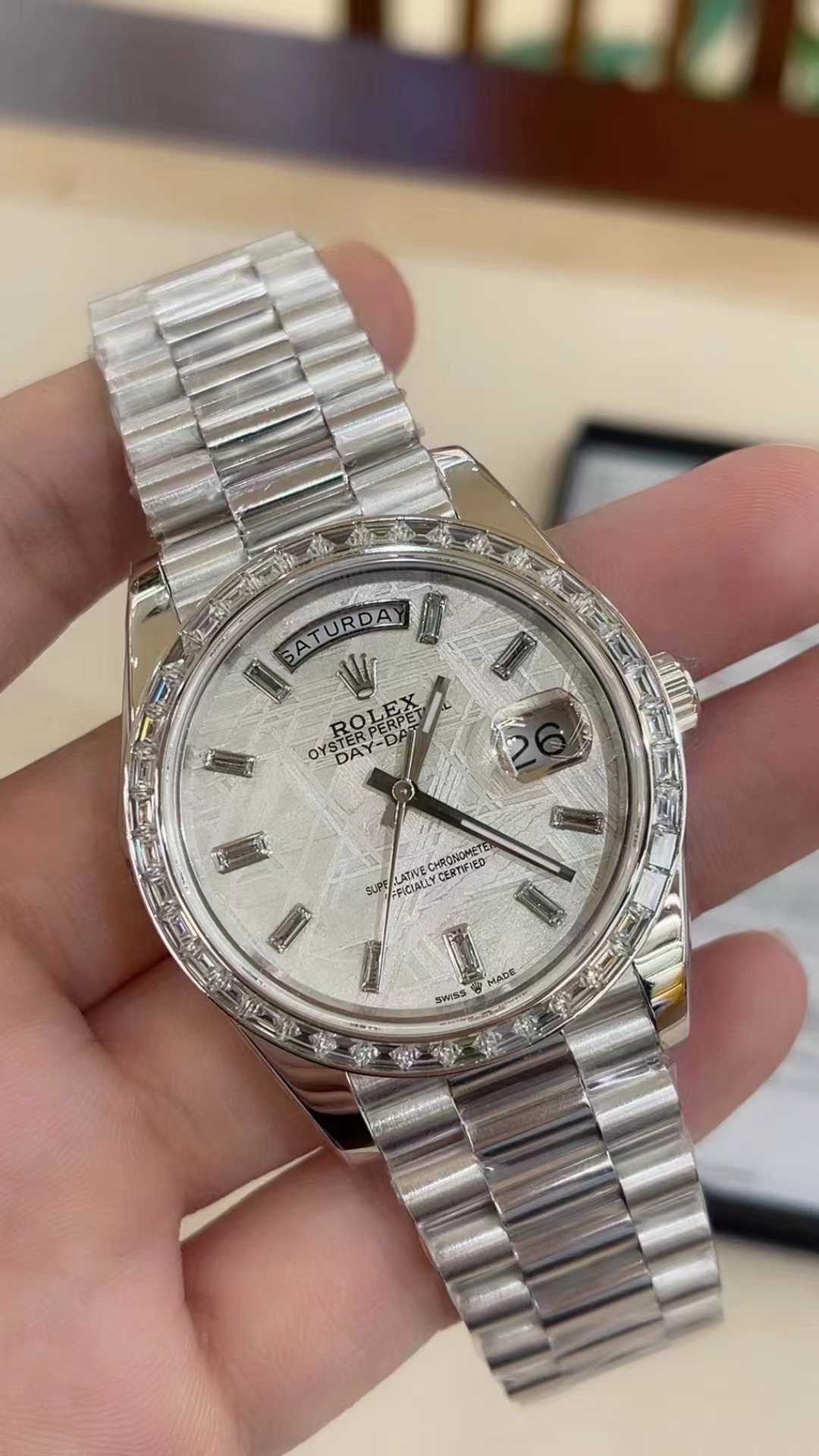 نسخة رولكس ديت جست 40 ملم مطلية بالذهب عيار 18 قيراط، لوحة نيزكية، تستعيد لوحة بديلة التأثير البصري الأصلي، إطار مويسانيتي ملون D، يزن 160.9 جرام، ذهب أبيض عيار 18 قيراط، يستعيد التأثير البصري البلاتيني