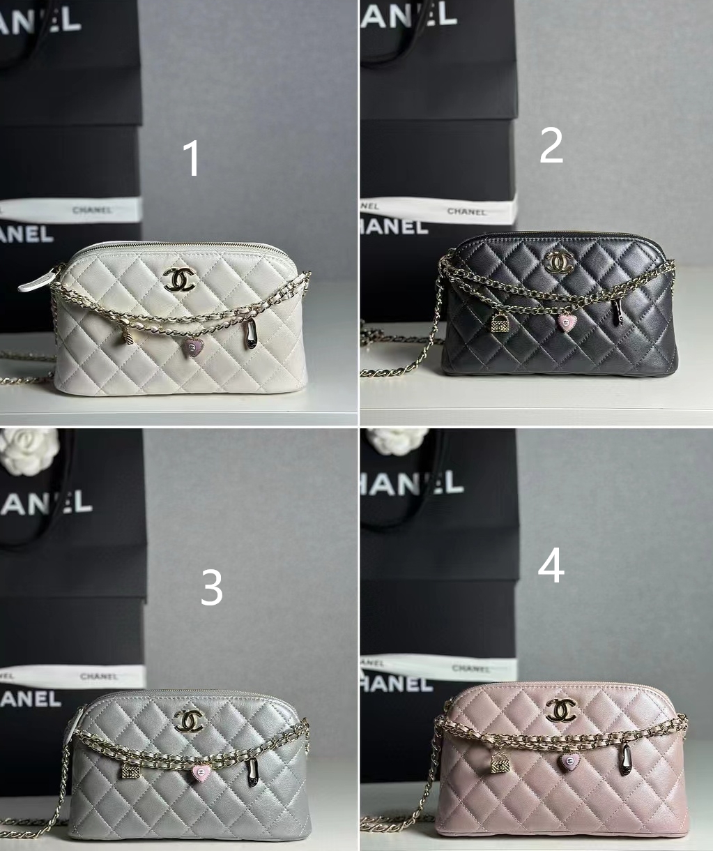 تتميز الواجهة بتصميم سلسلة مزدوجة قصيرة قابلة للتكديس، مع ثلاث قلادات صغيرة معلقة من سلسلة واحدة. كل قلادة رائعة حقًا! 😍 كعب عالٍ، قلب مطلي بالمينا، وحقيبة معدنية صغيرة ; جميعها تحمل شعار شانيل المميز. 🌟🌟 أنا معجبة جدًا بتصاميم شانيل الرقيقة والفريدة من نوعها.