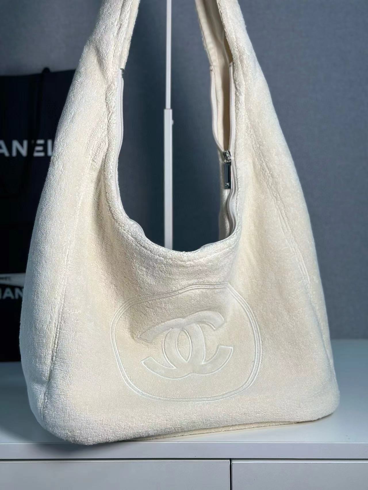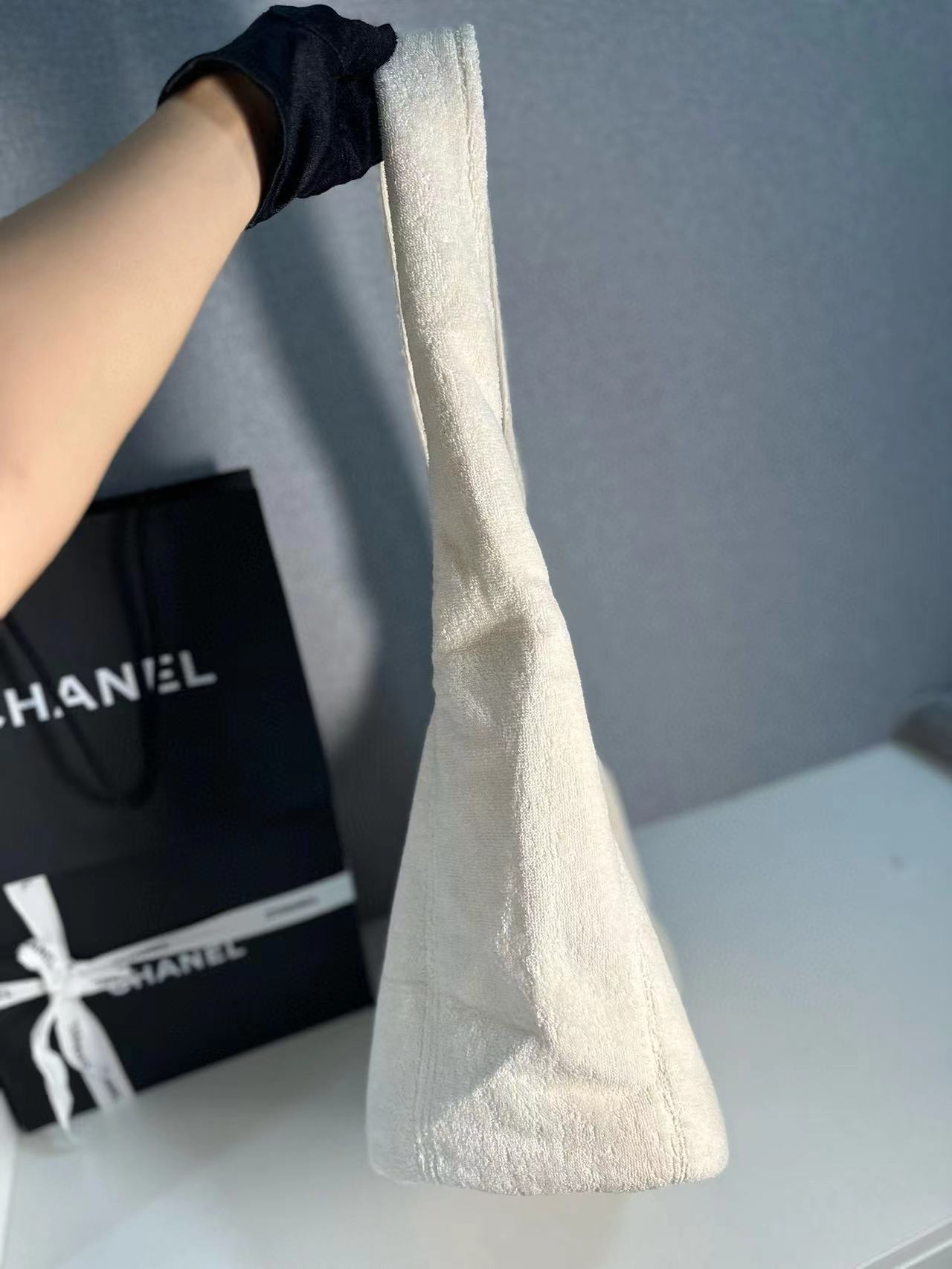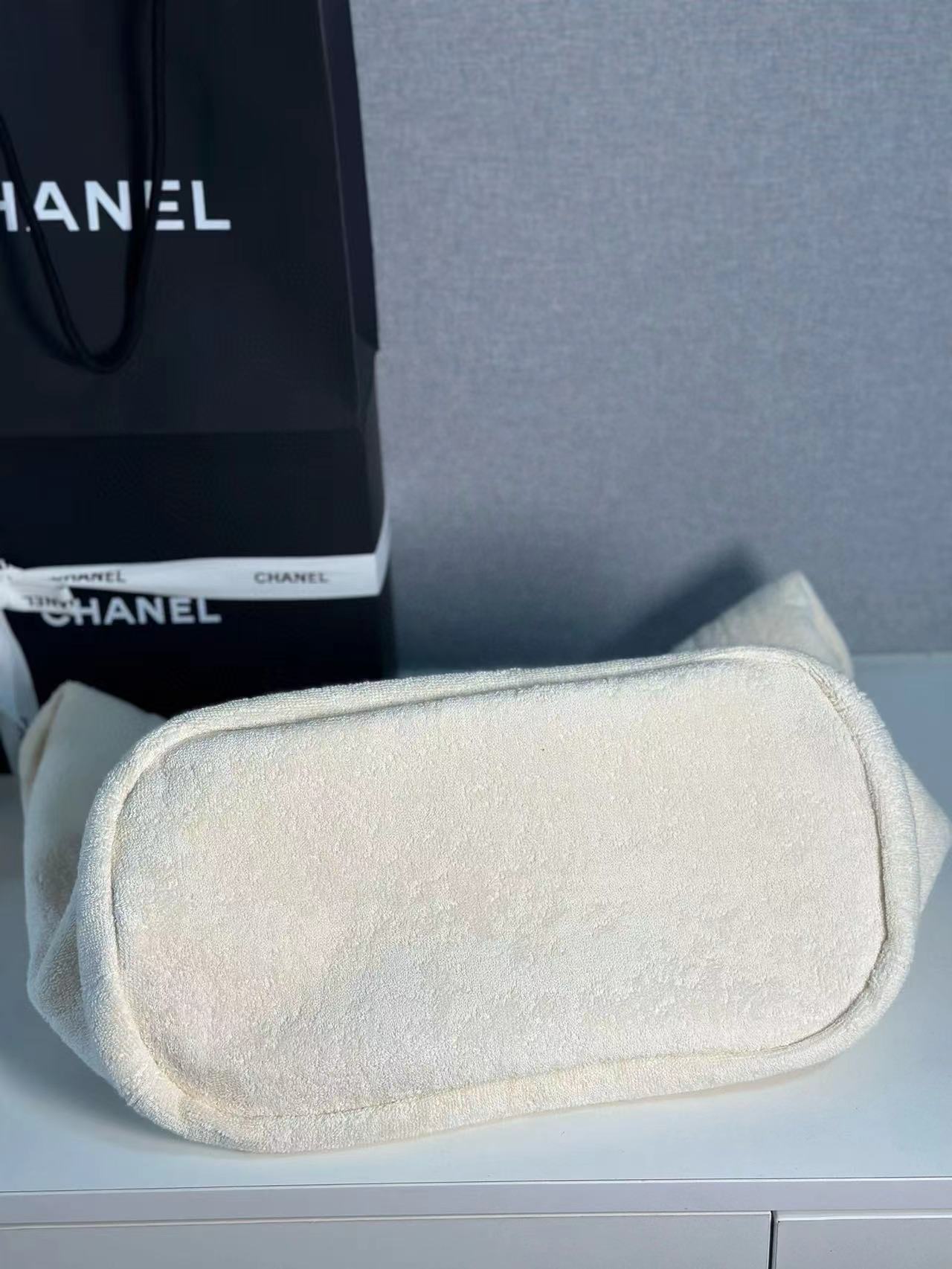 تتميز بتطريز كلاسيكي منقوش بشعار CC وجيب داخلي صغير! مصنوعة بالكامل من قماش منشفة الحمام، هذا التصميم مذهل حقًا! ملمسها الأنيق البسيط يُجسّد جوهر الشاطئ.