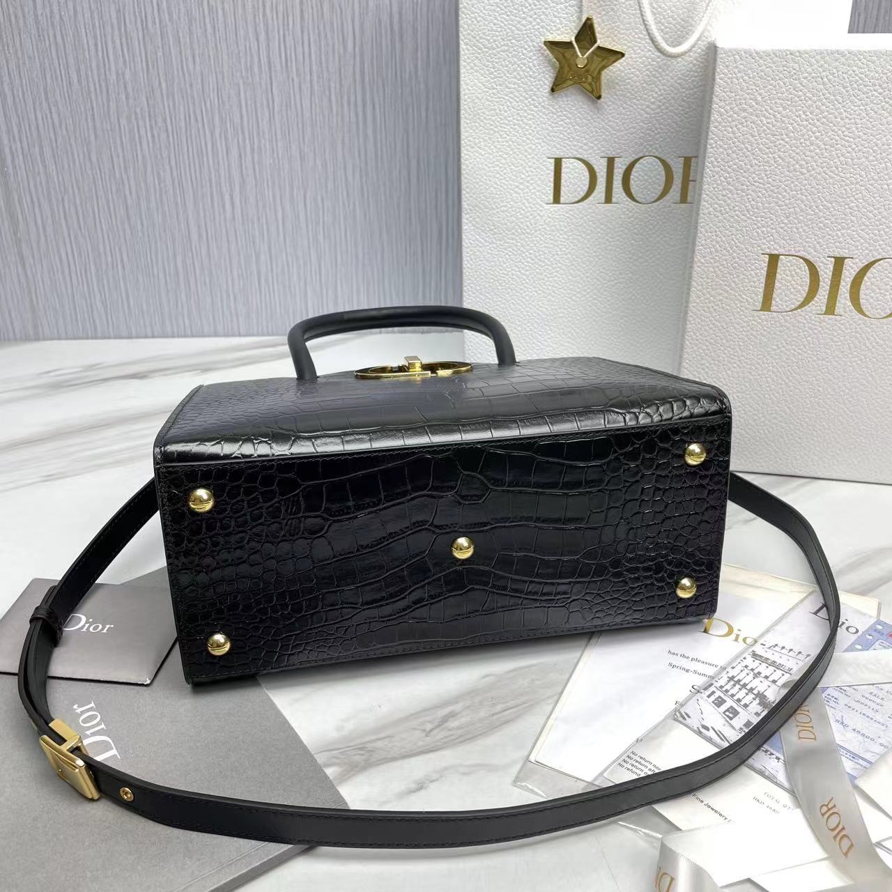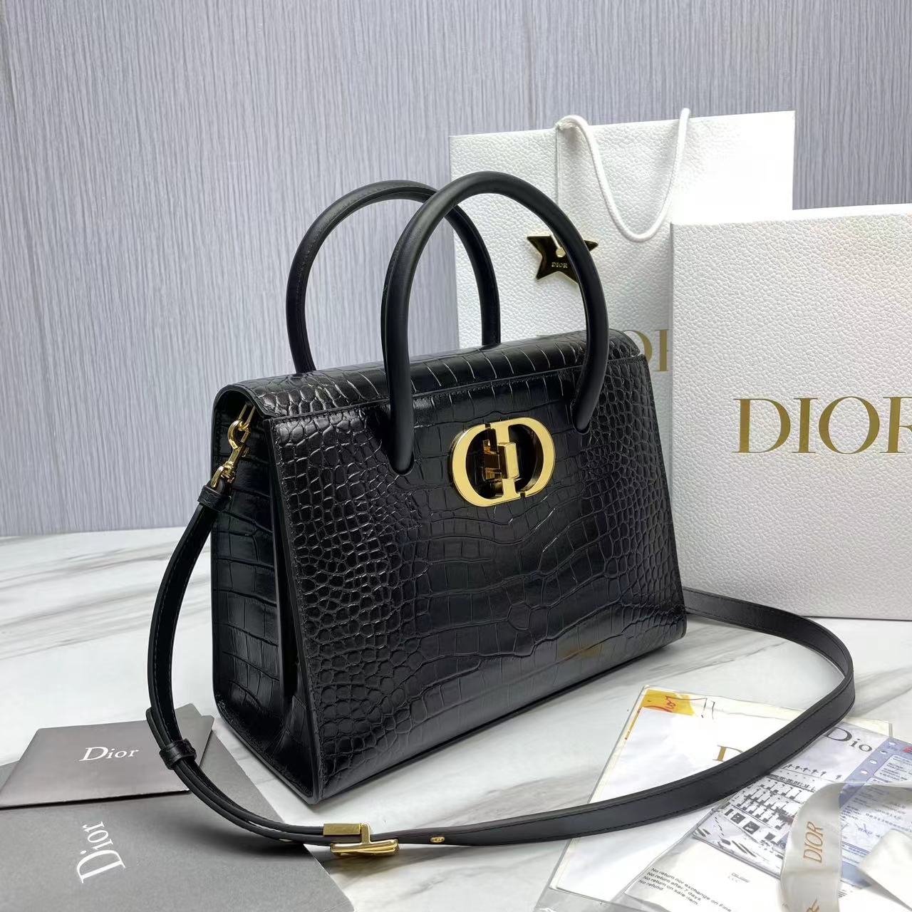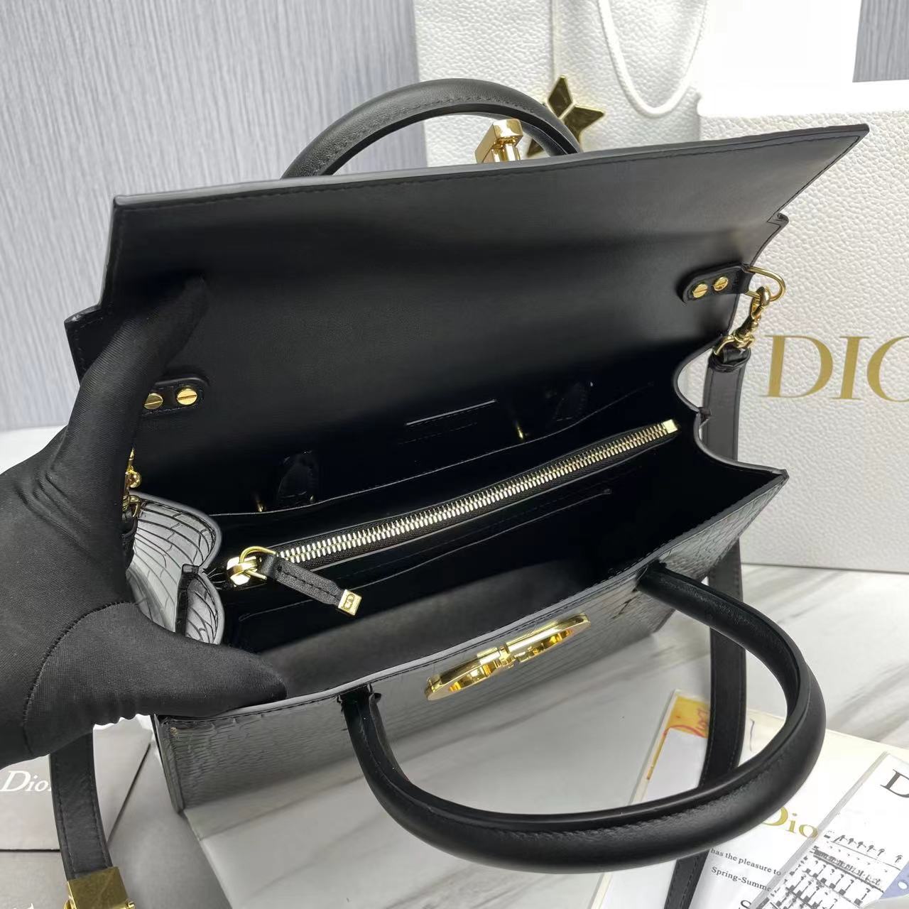 حقيبة مصنوعة يدويًا: غطاء DIO.R يمكن طيه إلى داخل الحقيبة بمشبك على شكل مقبض “CD” وشعار “30 Montaigne” منقوش على الظهر، مقصورتين داخليتين، 3 جيوب داخلية للرقعة، جيب داخلي كبير بسحاب، جيوب جانبية خلفية قابلة للإزالة، قابلة للتعديل يمكن حمل حزام الكتف الجلدي، مع إبزيم “Christian Di.or” ذو الطراز العسكري، باليد أو الكتف أو حول الجسم.تقدم المديرة الإبداعية للسيدات لدى Dior ماريا غراتسيا تشيوري (MARIA GRAZIA CHIURI) حقيبة DIOR ST HONORÉ الجديدة تكريماً إلى شارع سان أونوريه، الشارع العصري الذي يحمل نفس الاسم في باريس، ويحتفل بالأناقة الخالدة. تتميز حقيبة اليد DIOR ST HONORÉ الجديدة بمنحنيات ناعمة، ويتم تفسير شعار “CD” الكلاسيكي بشكل رائع بمقبض، مما يُظهر براعتها العميقة. تم تجهيز حقيبة اليد هذه بحزام كتف قابل للفصل، والذي يمكن أن يفتح المزيد من الإلهام للمزيج والمطابقة للأسلوب، كما أنه يضخ حيوية جديدة MONTAIGNE الكلاسيكية، التي ترث سحر Dior Haute Couture مع الإبداع الحديث والحرفية الرائعة.