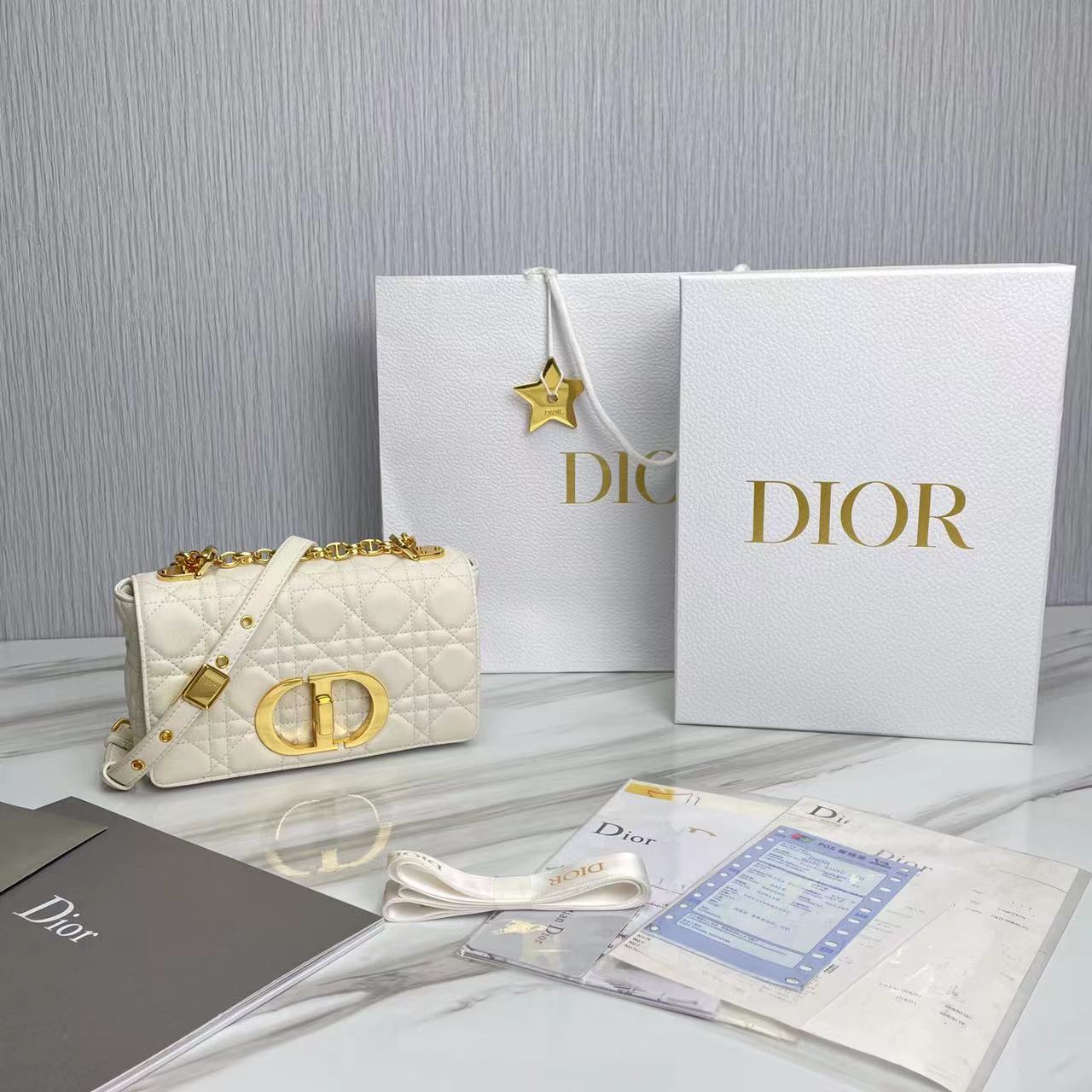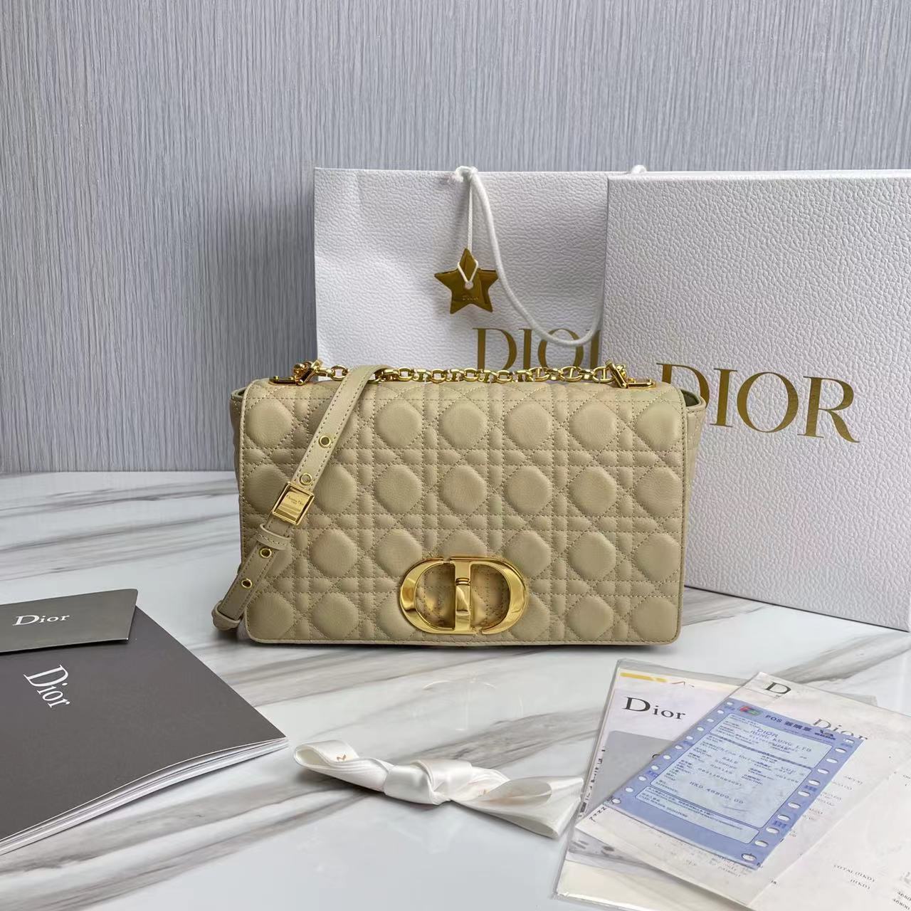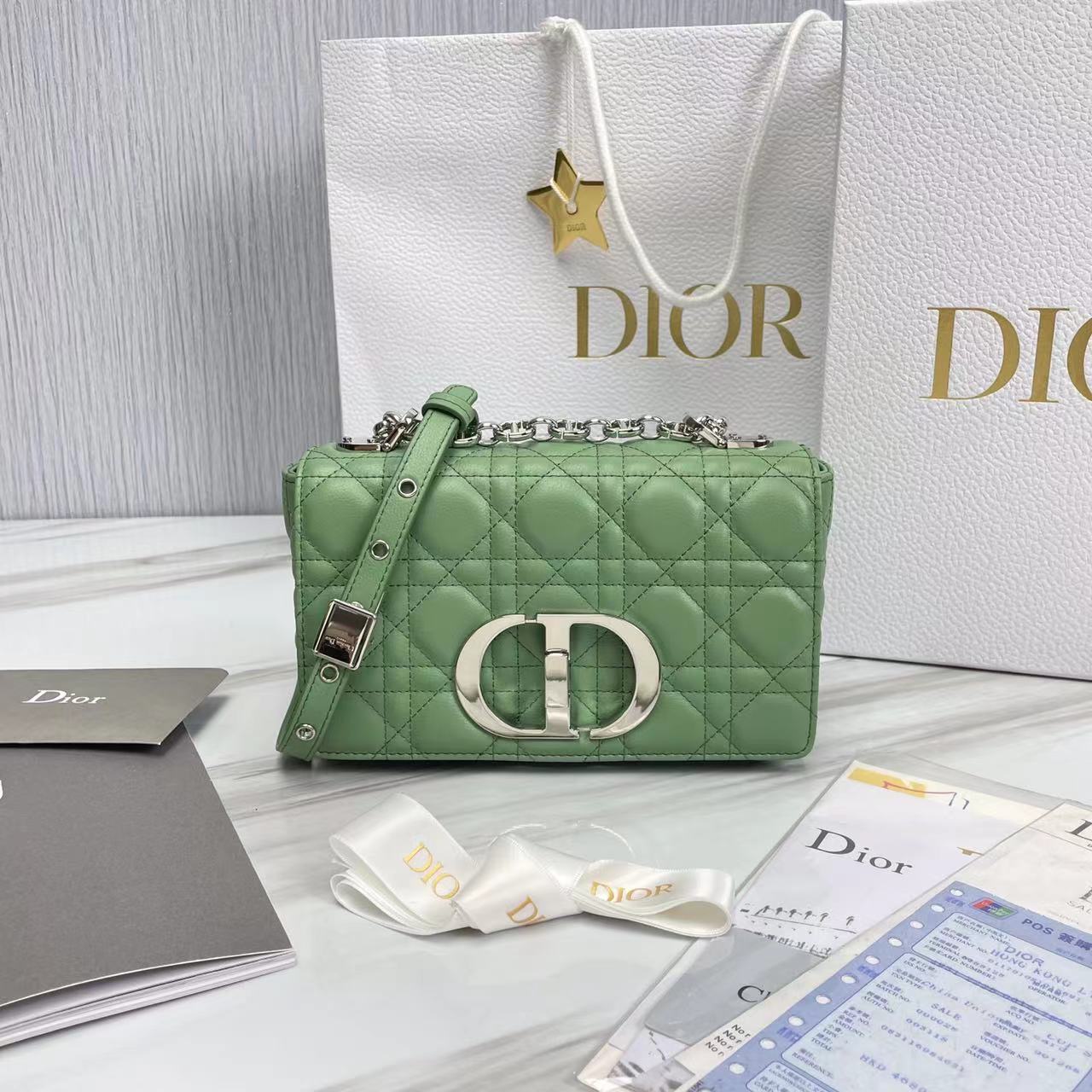 حقيبة  حقيبة Dior Caro الجديدة مصنوعة من مادة ناعمة وتتميز بغطاء بمشبك معدني على شكل حرف “CD” بلمسة نهائية ذهبية عتيقة، مستوحاة من إغلاق زجاجة عطر Christian Dior. يأتي مزودًا بحزام كتف قابل للفصل على شكل سلسلة “CD”، ويمكن أيضًا استبداله بحزام كتف عريض مطرز، مما يجعله أكثر أناقة وعصرية. يمكن ارتداؤه بسهولة سواء كان مظهرًا يوميًا أو حفل عشاء. إغلاق بغطاء قلاب بإبزيم “CD” على شكل مقبض وشعار “30 Montaigne” منقوش على الظهر. حزام كتف على شكل سلسلة “CD” قابل للإزالة والتعديل مع إبزيم “Christian Dior” على الطراز العسكري، وجيب داخلي بسحاب وجيب رقعة في الخلف، وجيوب جانبية. يمكن حملها باليد أو الكتف أو عبر الجسم