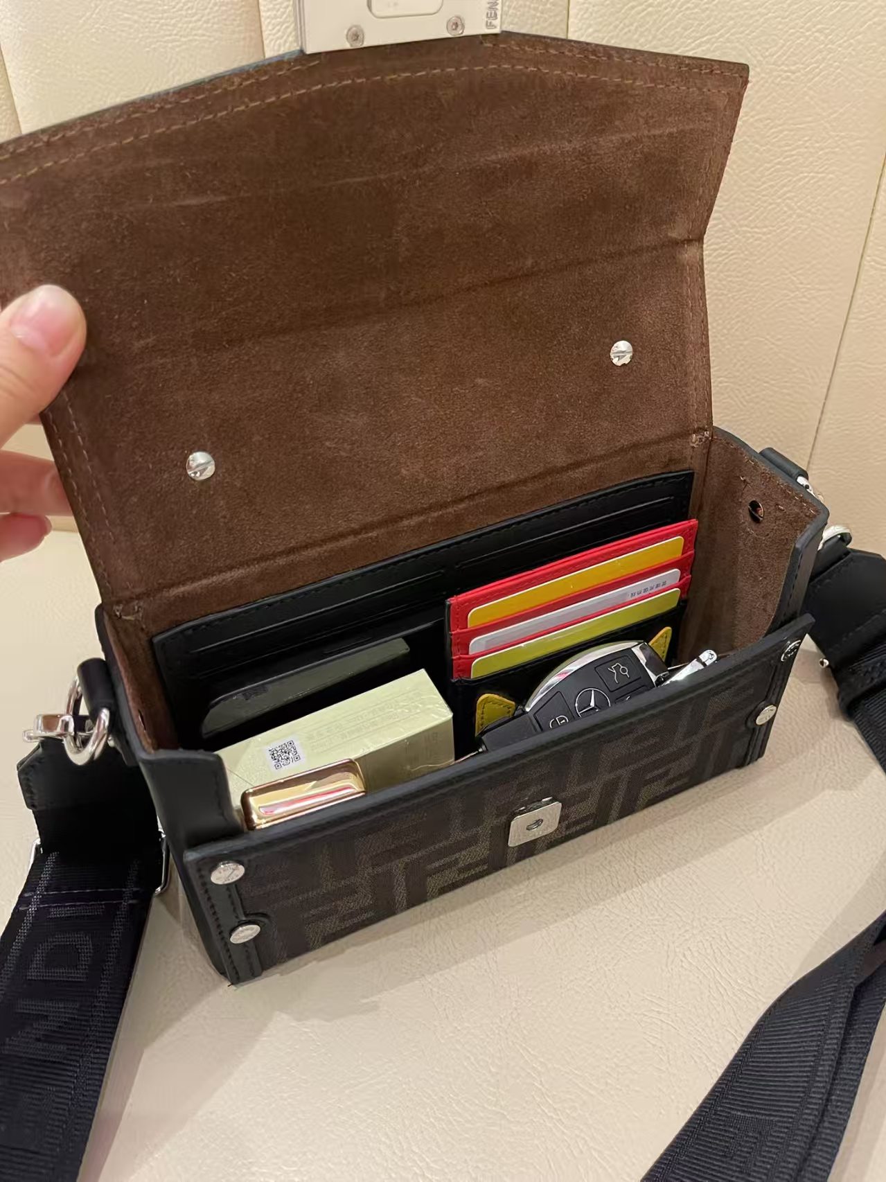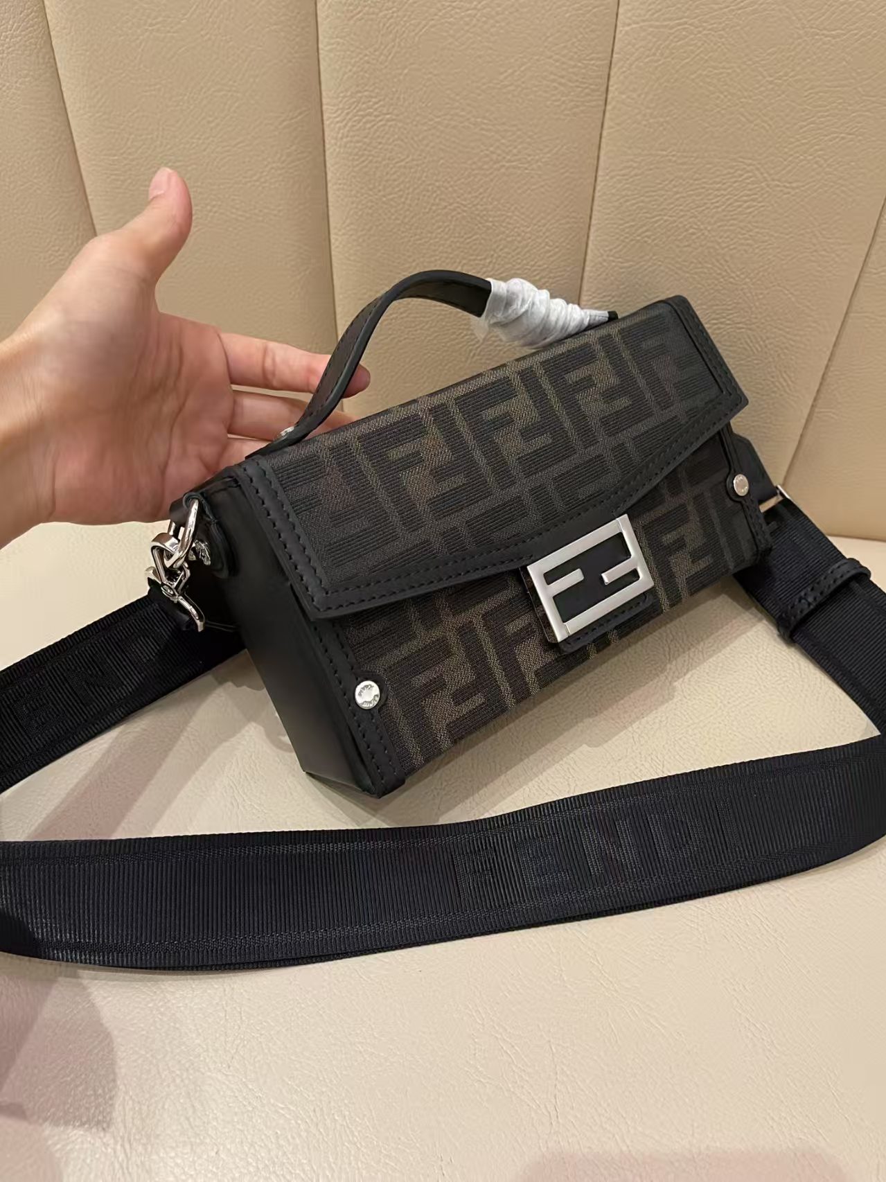 حزام كروس مصنوع من قماش أسود عالي التقنية يحمل علامة FENDI التجارية، وهو قابل للتعديل والإزالة.