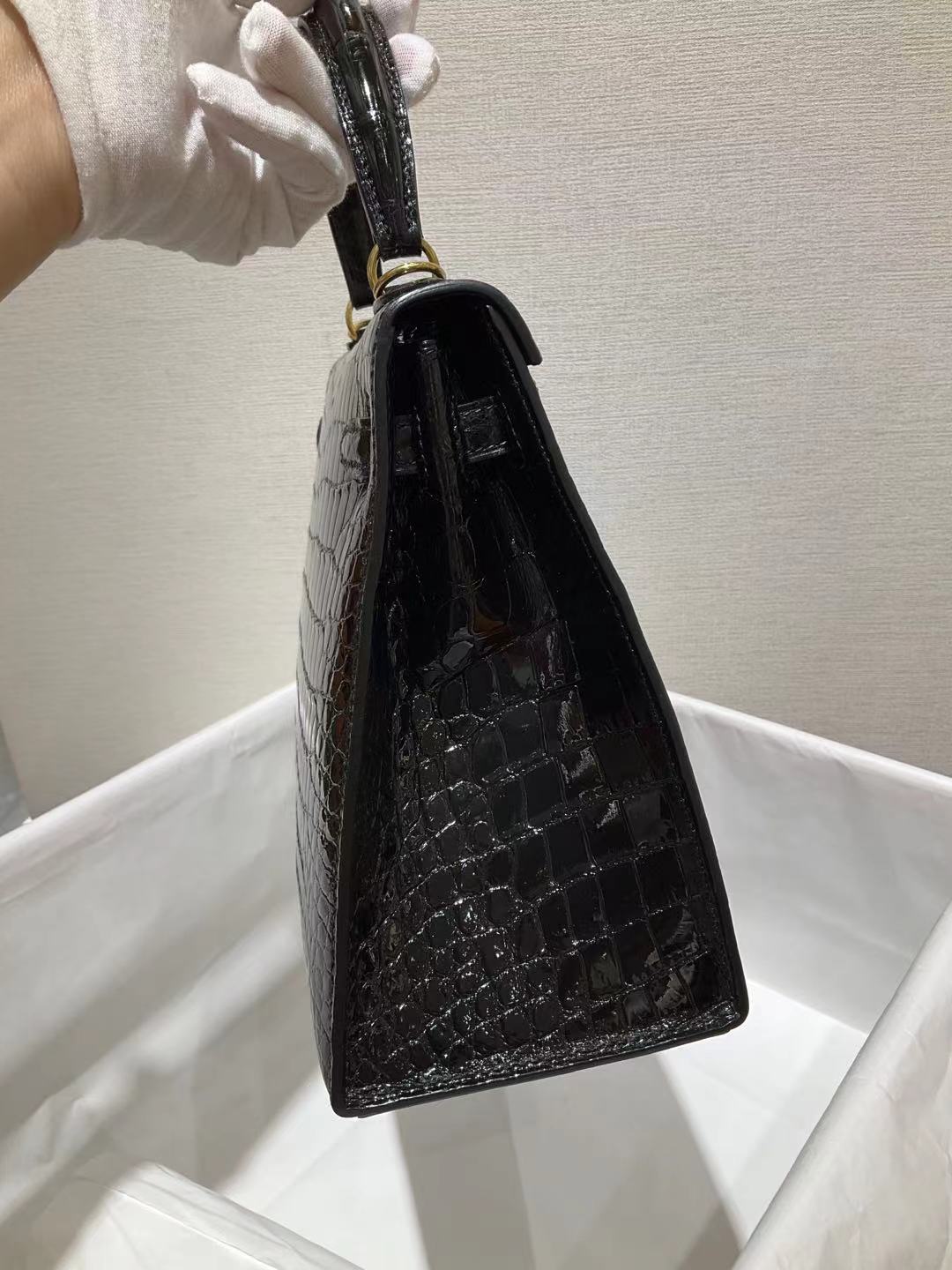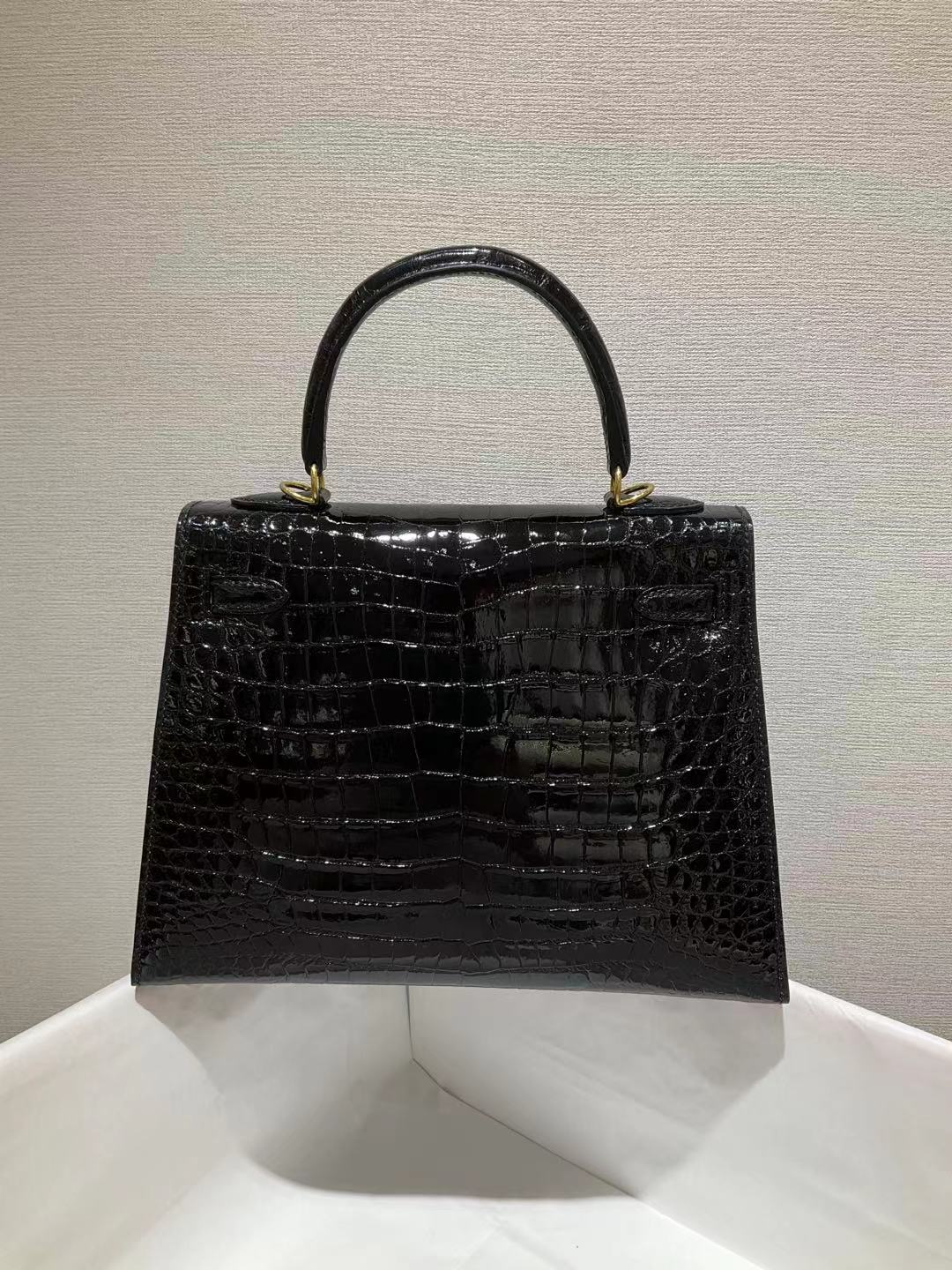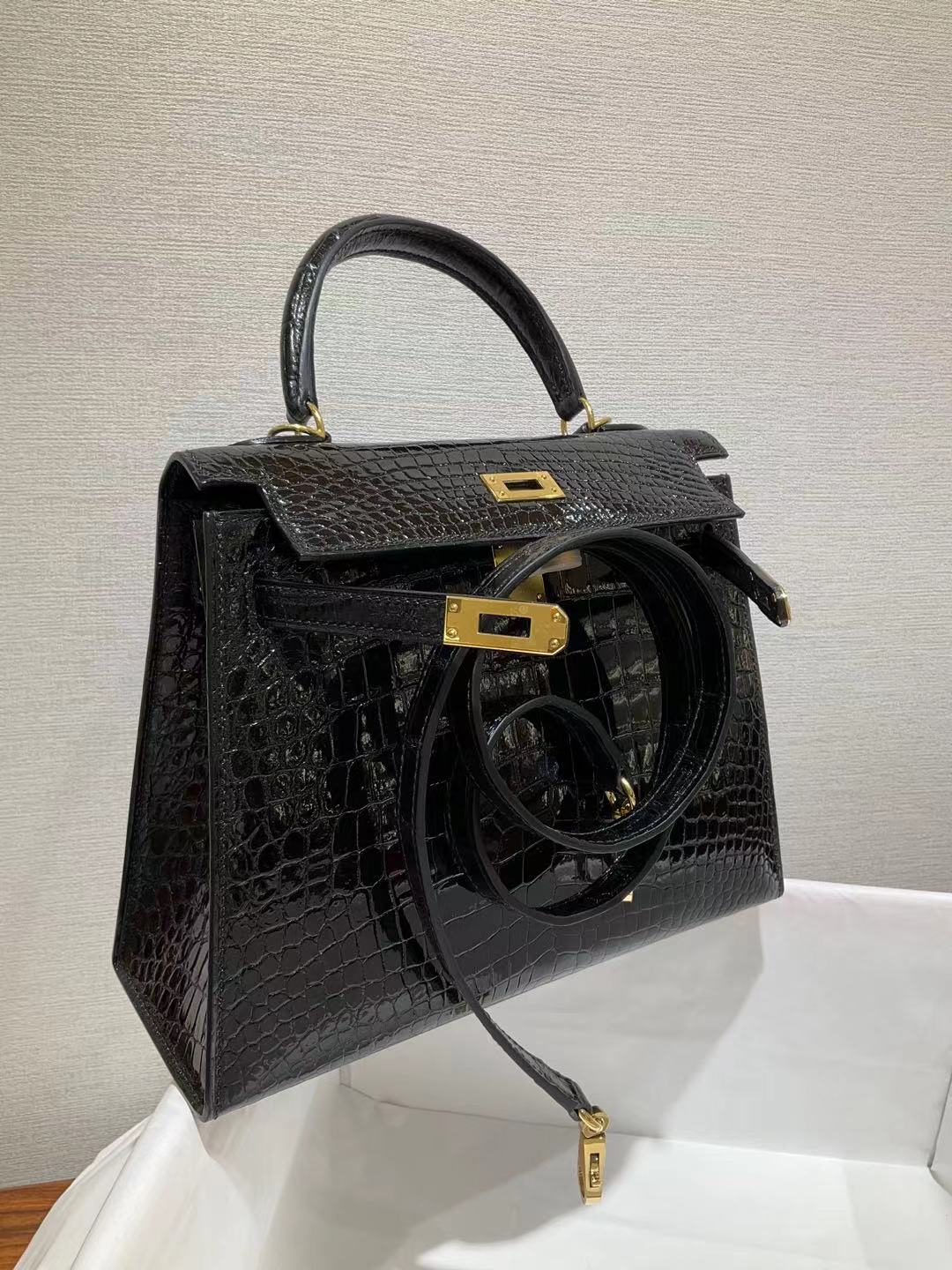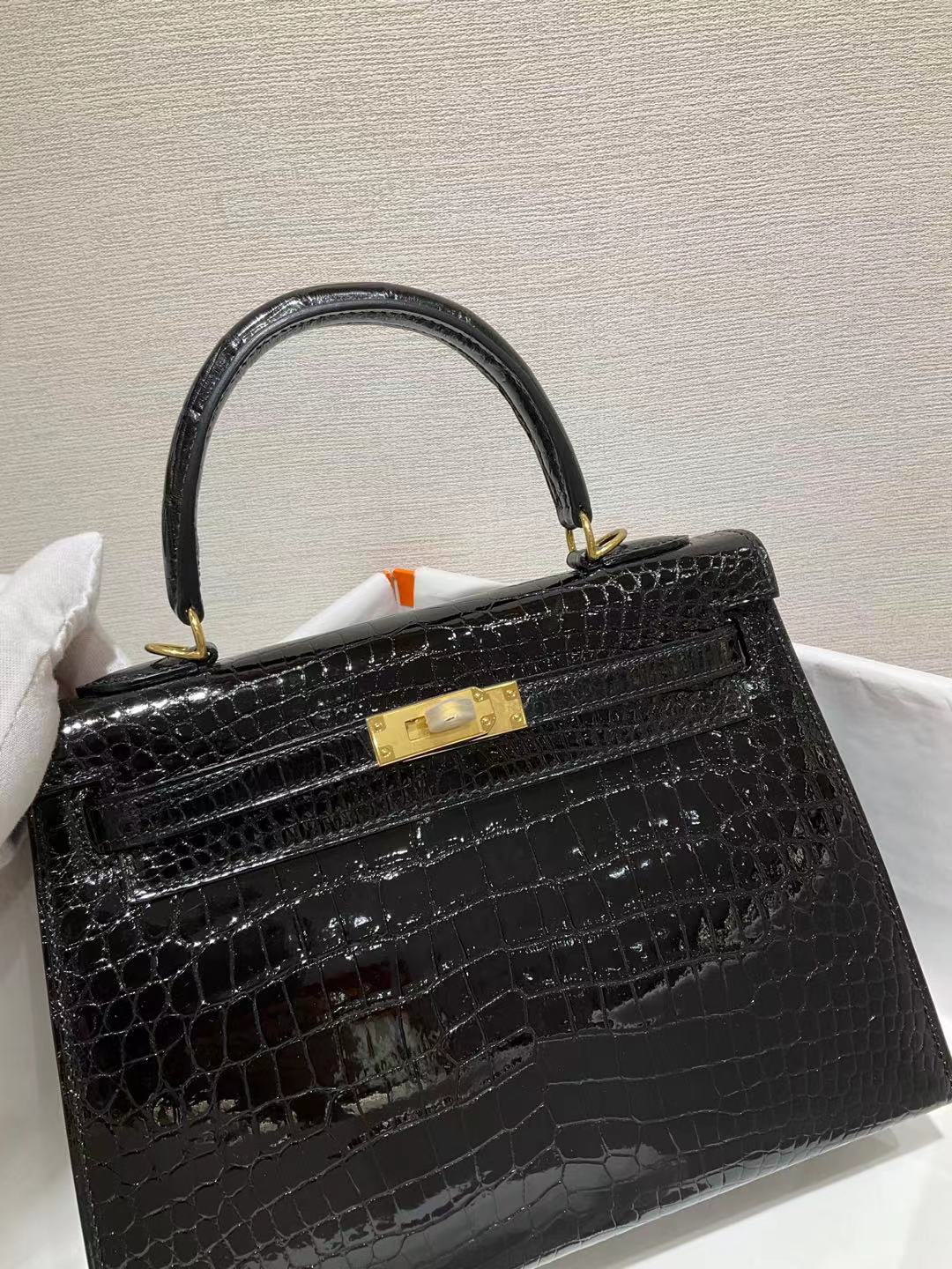 ✈️✈️✈️ كيلي 25 سم الأسود مشرق جلد التماسيح 🐊🐊🐊 قيود ذهبية
