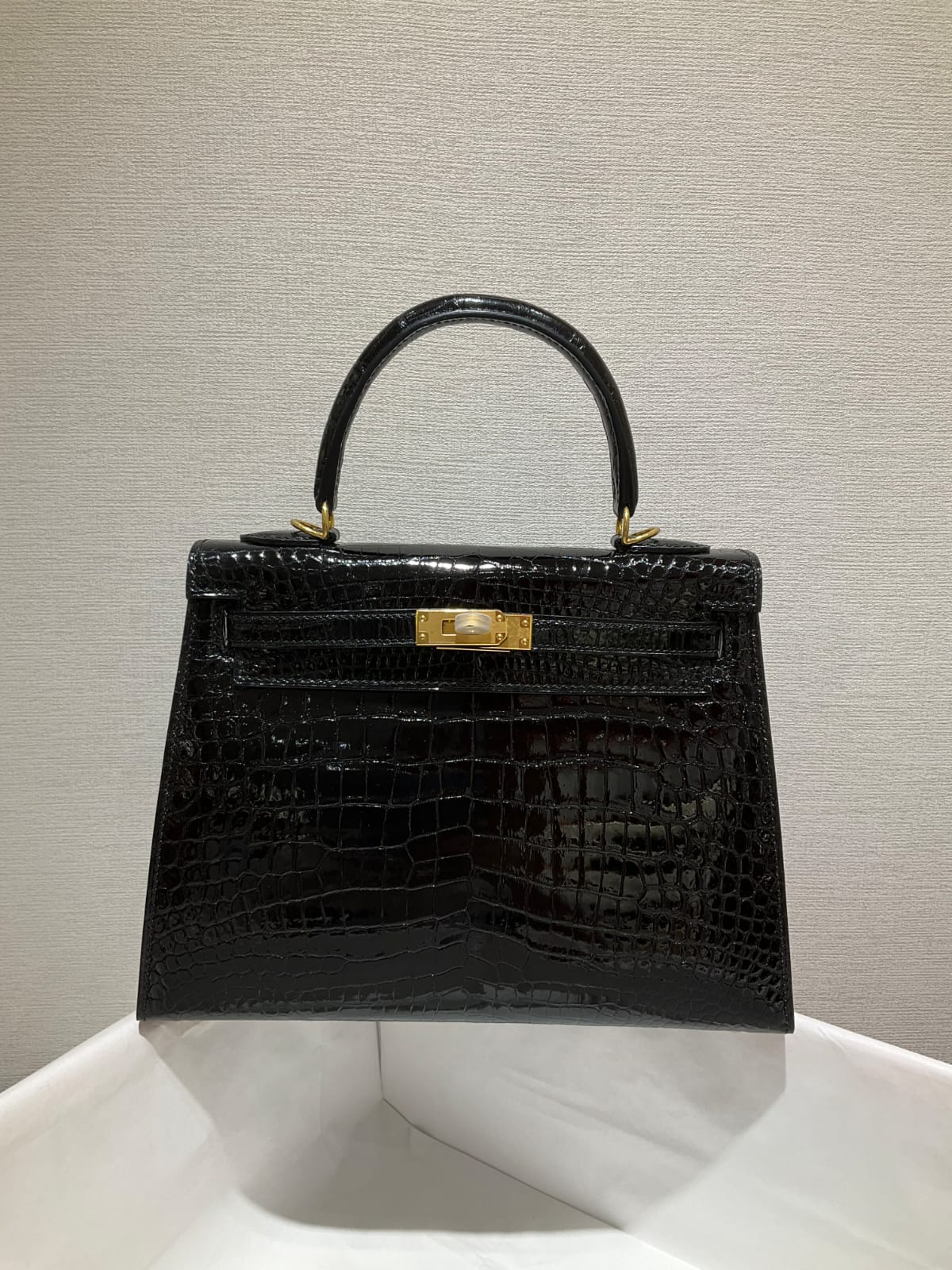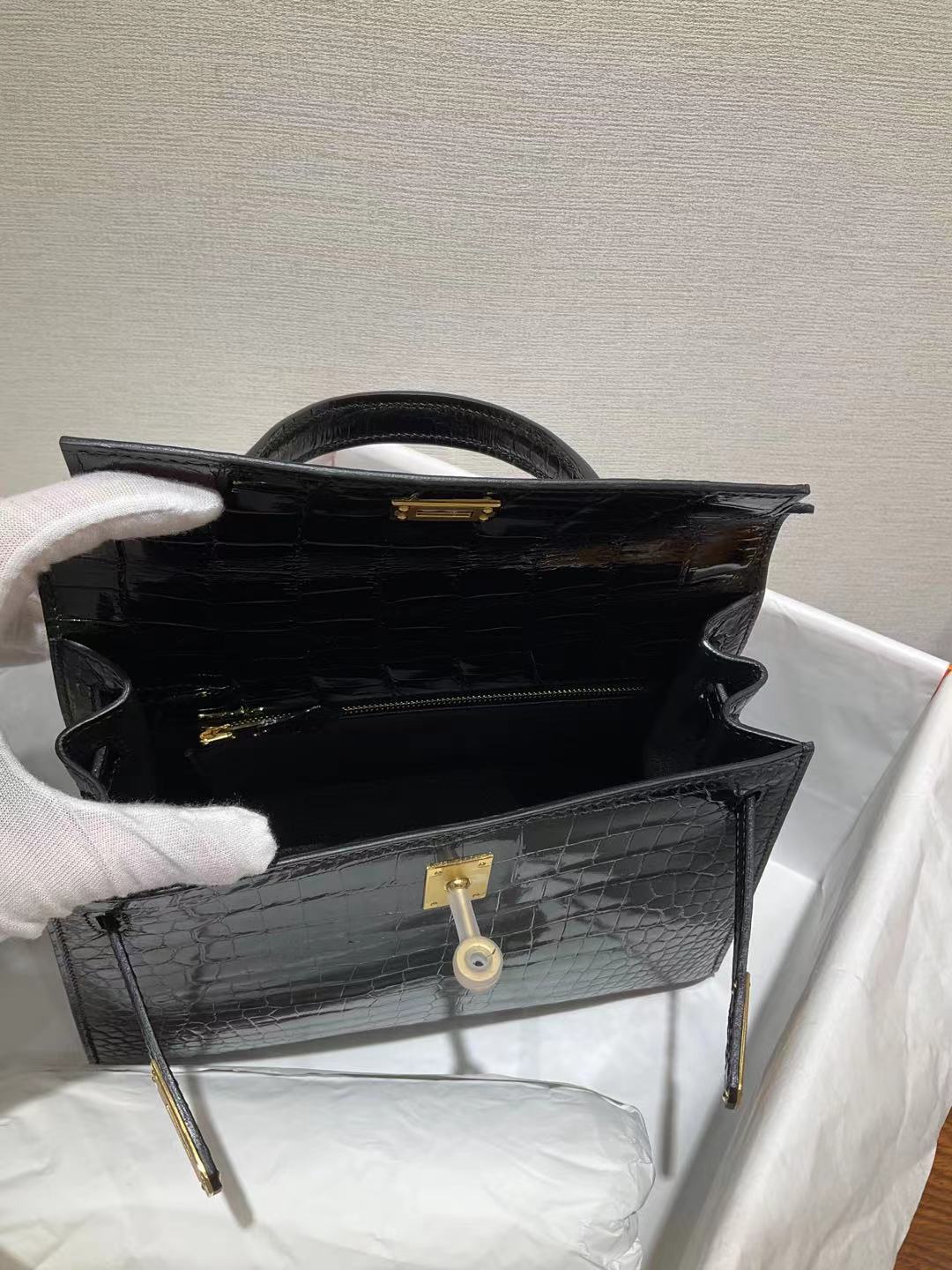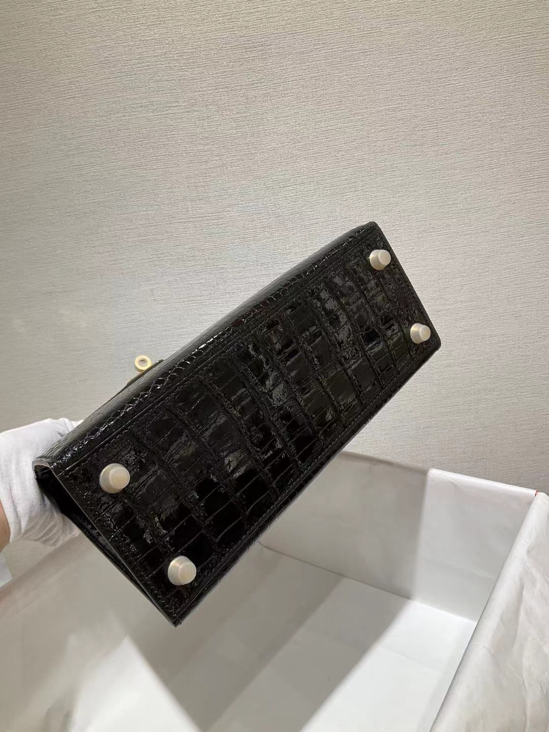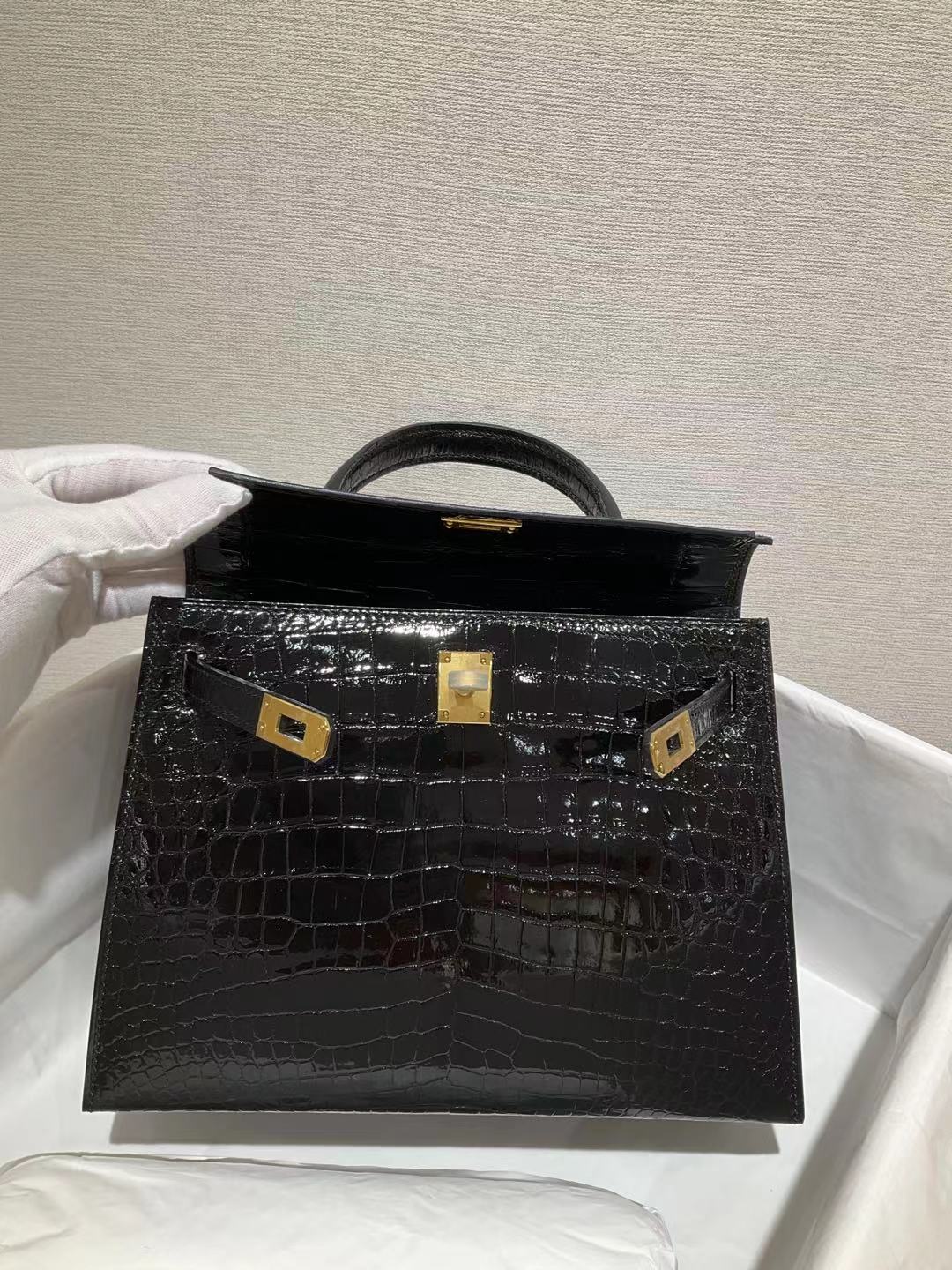 ✈️✈️✈️ كيلي 25 سم الأسود مشرق جلد التماسيح 🐊🐊🐊 قيود ذهبية