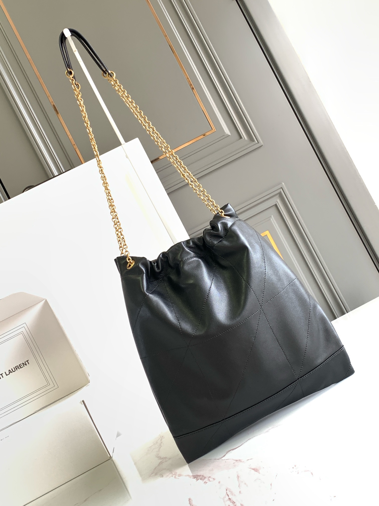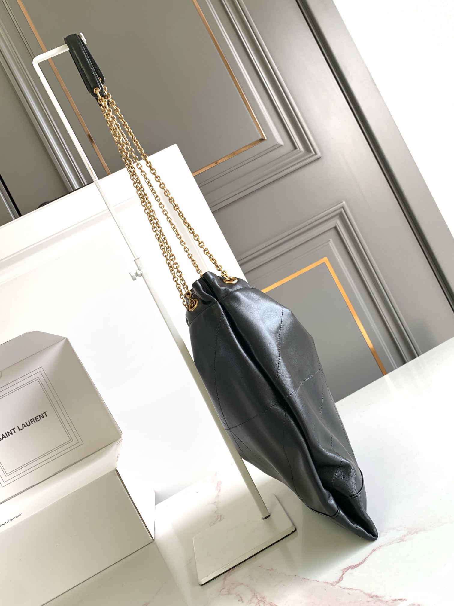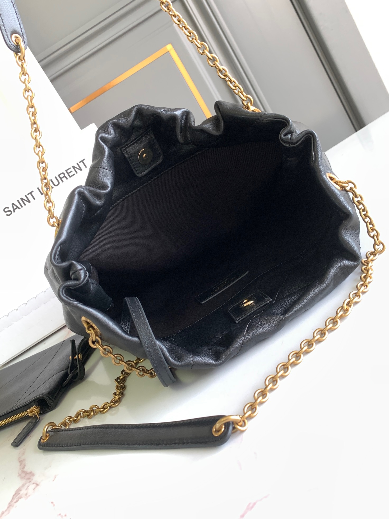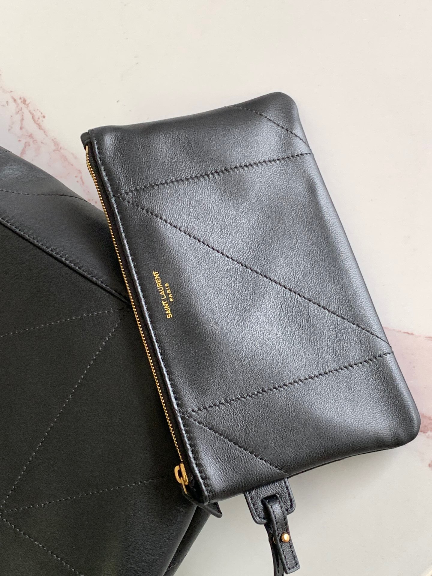 نسخة كلاتش من حقيبة اليد JAMIE 4.3، مصنوعة من جلد نابا الناعم، ومزينة بخياطة CARRÉ RIVE GAUCHE ومجهزة بحقيبة بسحاب قابلة للإزالة.