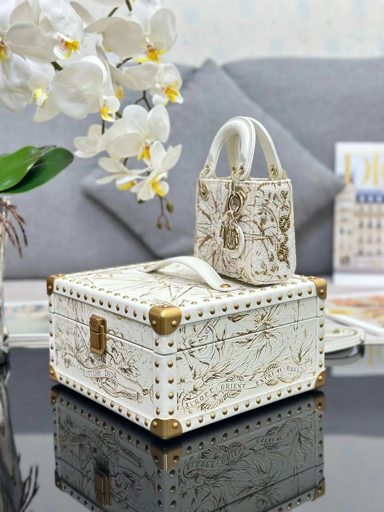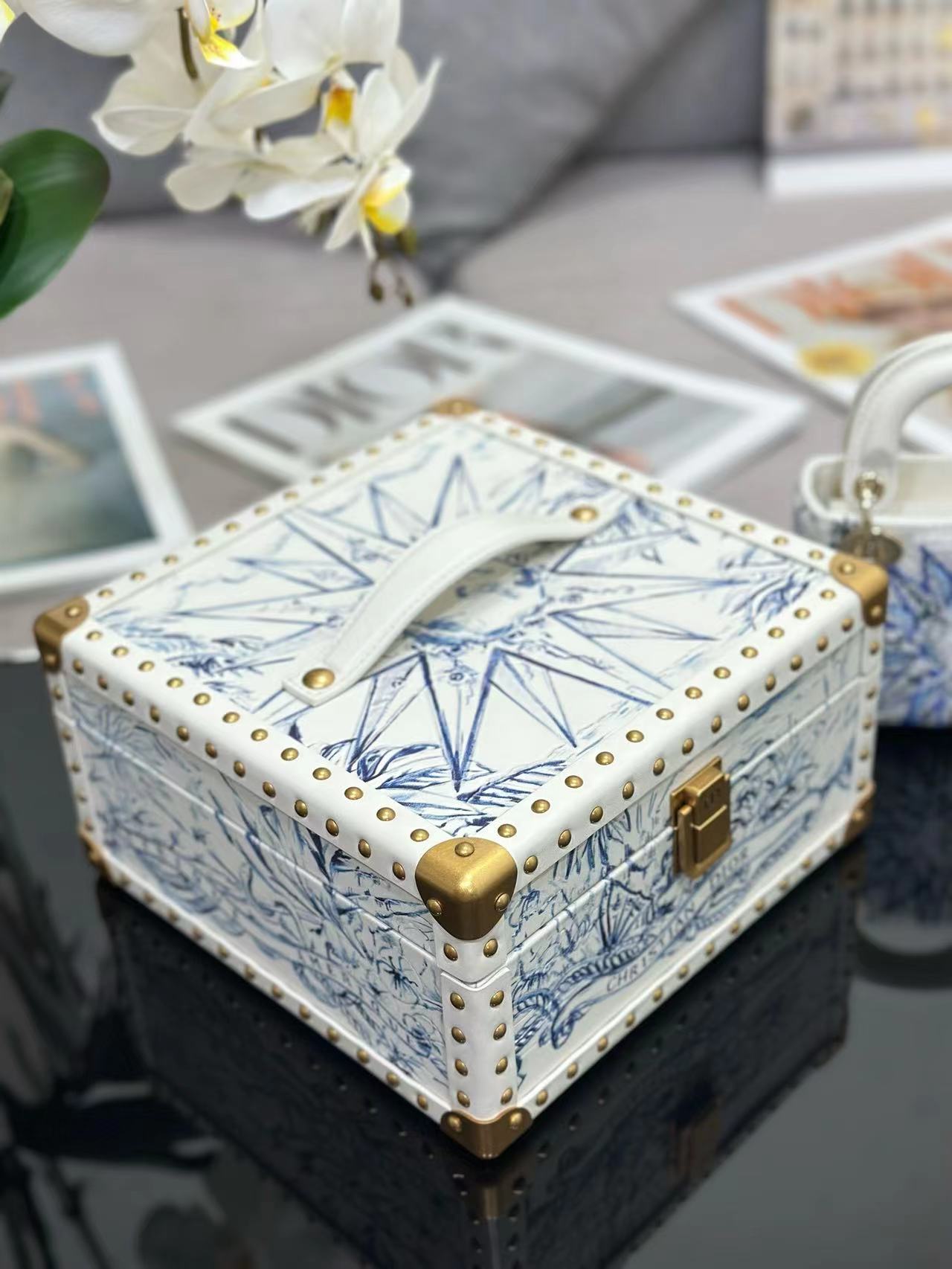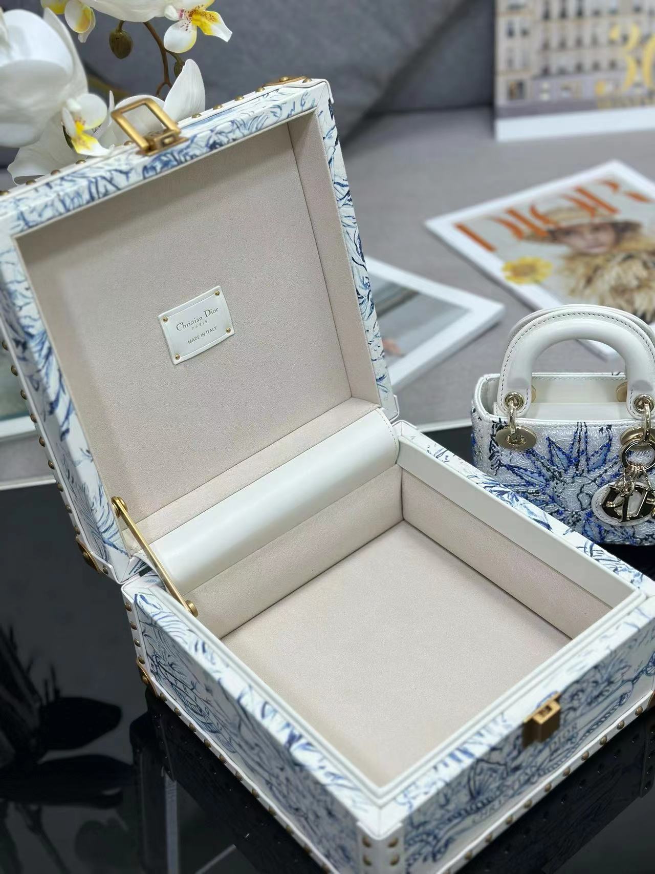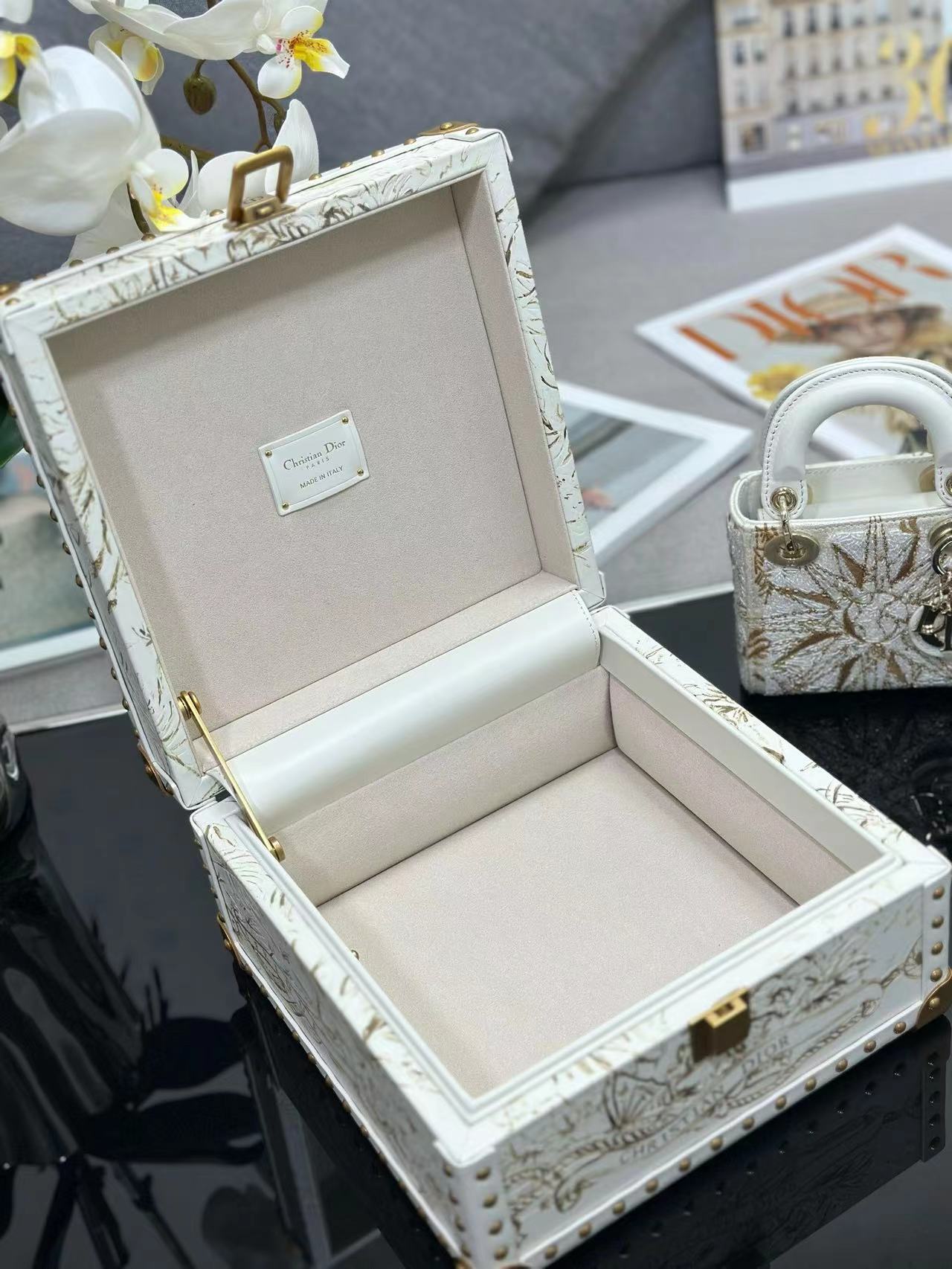 🎁 يعيد صندوق التخزين العلوي من Dior تفسير التصميم الكلاسيكي الأنيق ويظهر براعة Dior الاستثنائية. مصنوعة من جلد العجل باللون الأبيض، وتكشف عن عالم من الأناقة الملونة ويمكن أن تتسع لحقيبة Lady Dior الصغيرة جدًا. إغلاق وتفاصيل معدنية مطلية باللون الذهبي العتيق،