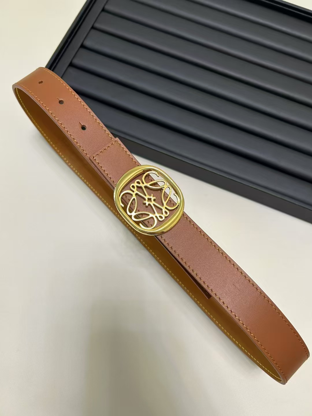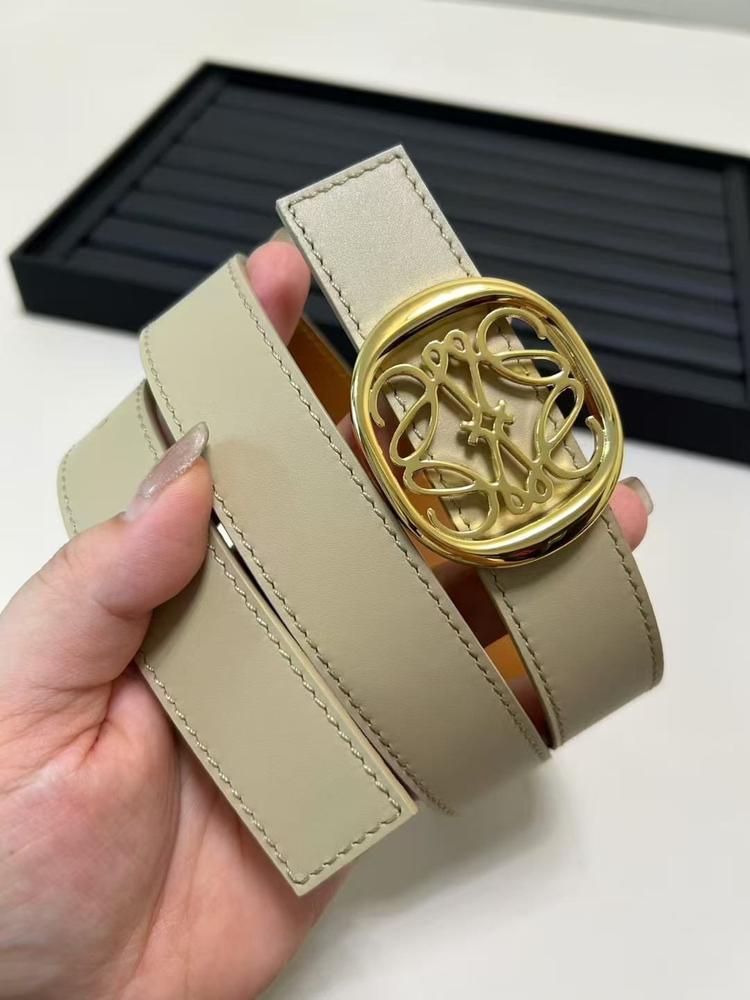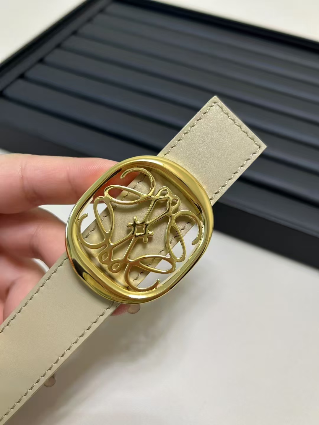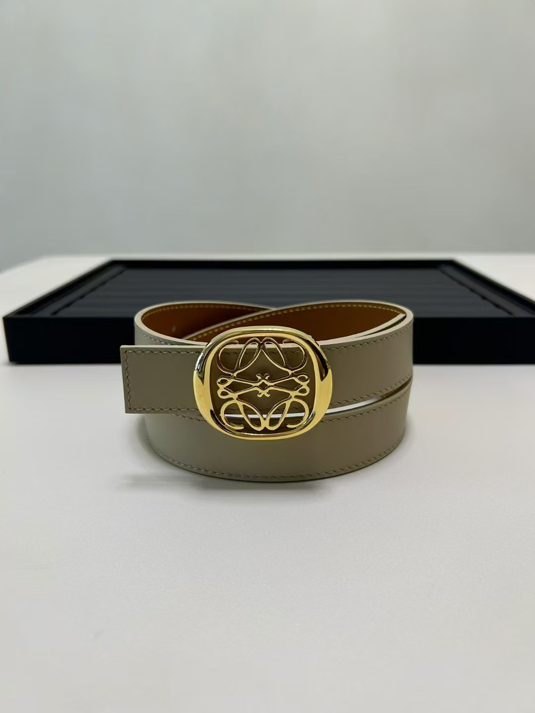 أحدث حزام من طاولة LOEWE مصنوع من جلد البقر الناعم وهو حزام ضيق مزود بإبزيم Anagram مصنوع بحرفية ممتازة