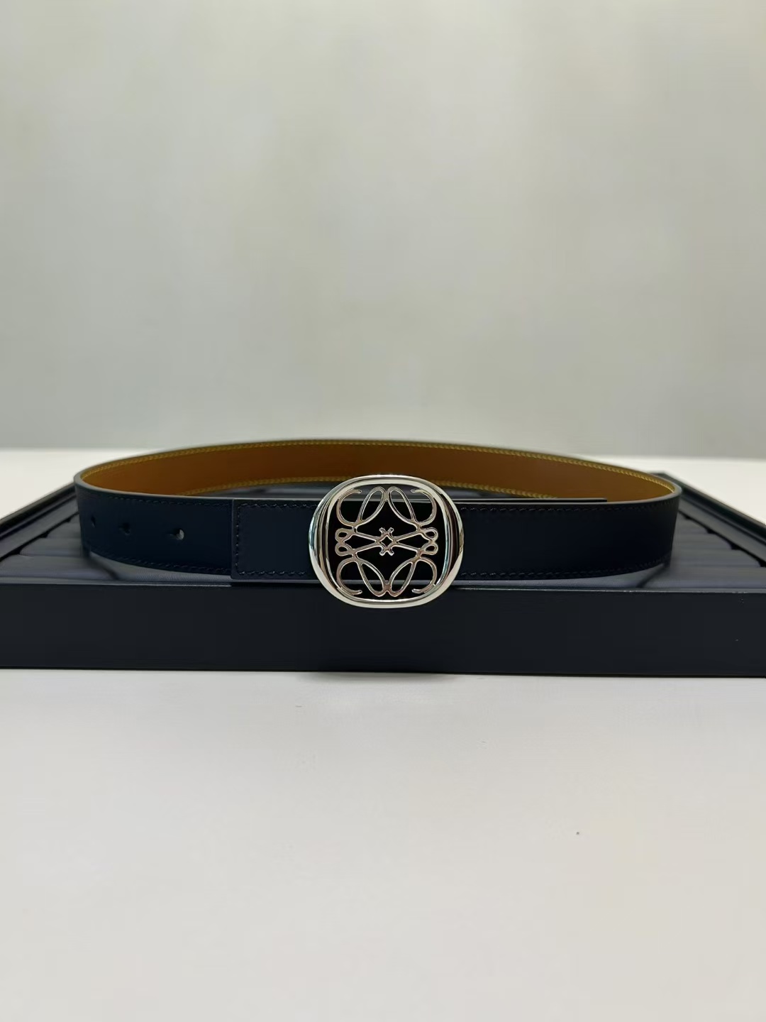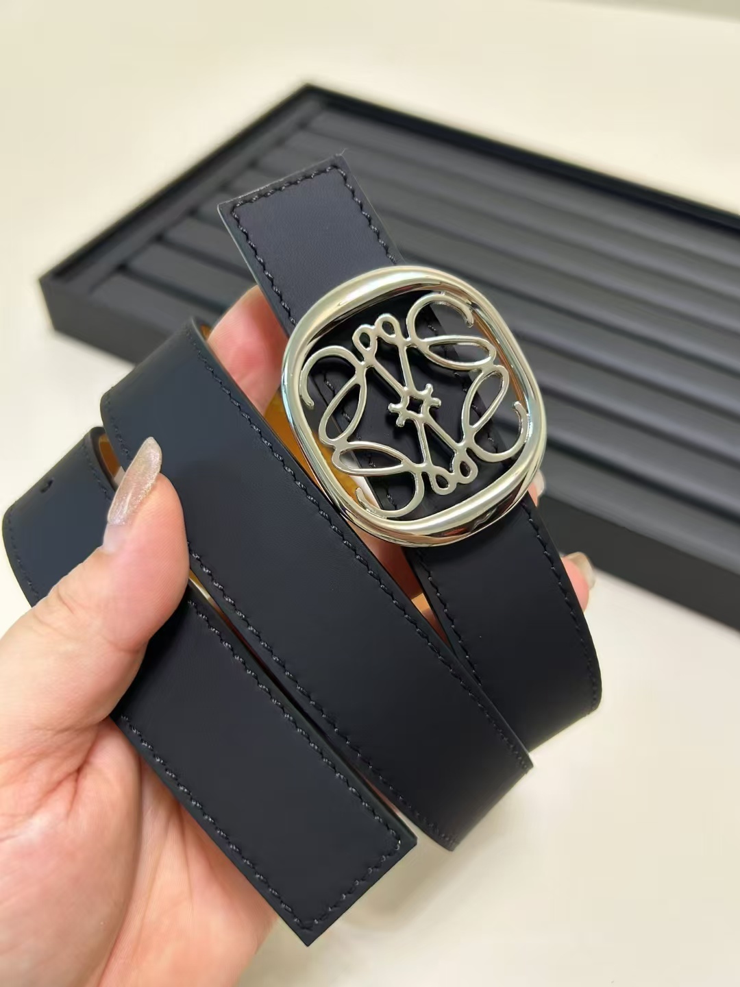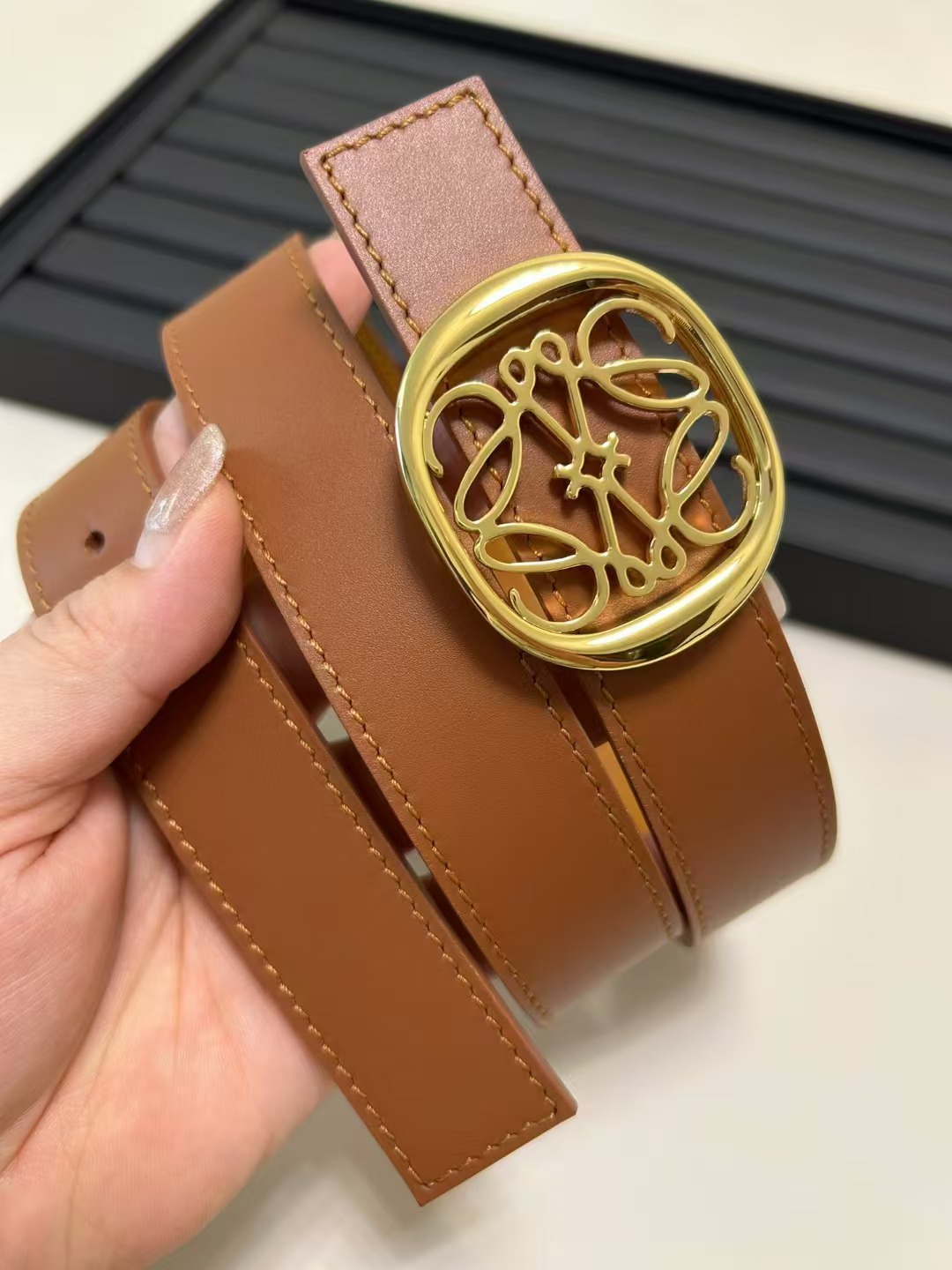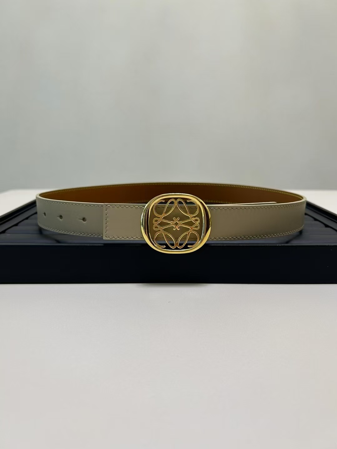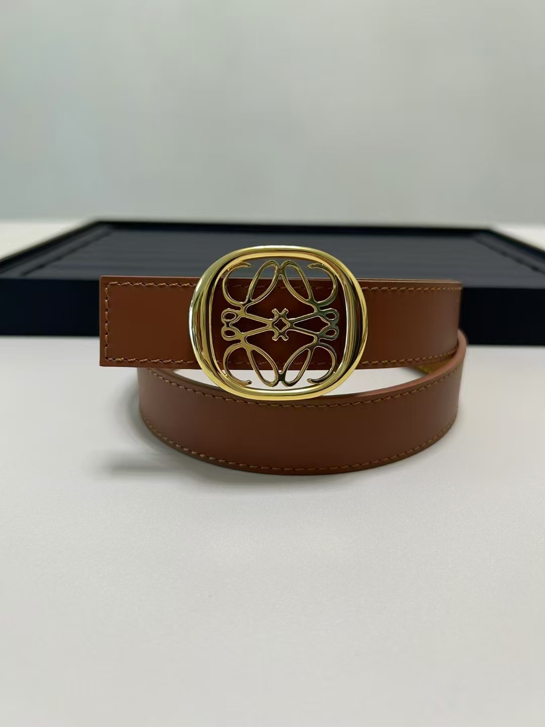 أحدث حزام من طاولة LOEWE مصنوع من جلد البقر الناعم وهو حزام ضيق مزود بإبزيم Anagram مصنوع بحرفية ممتازة