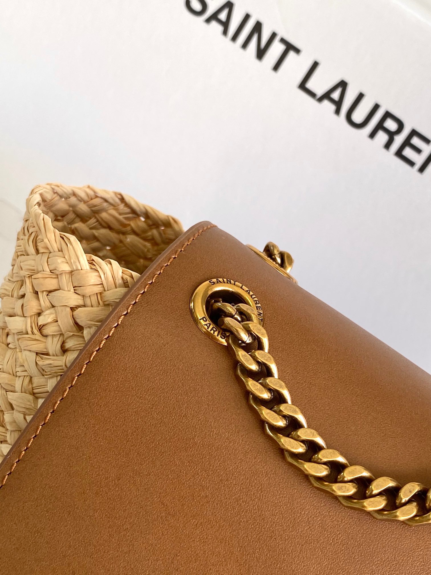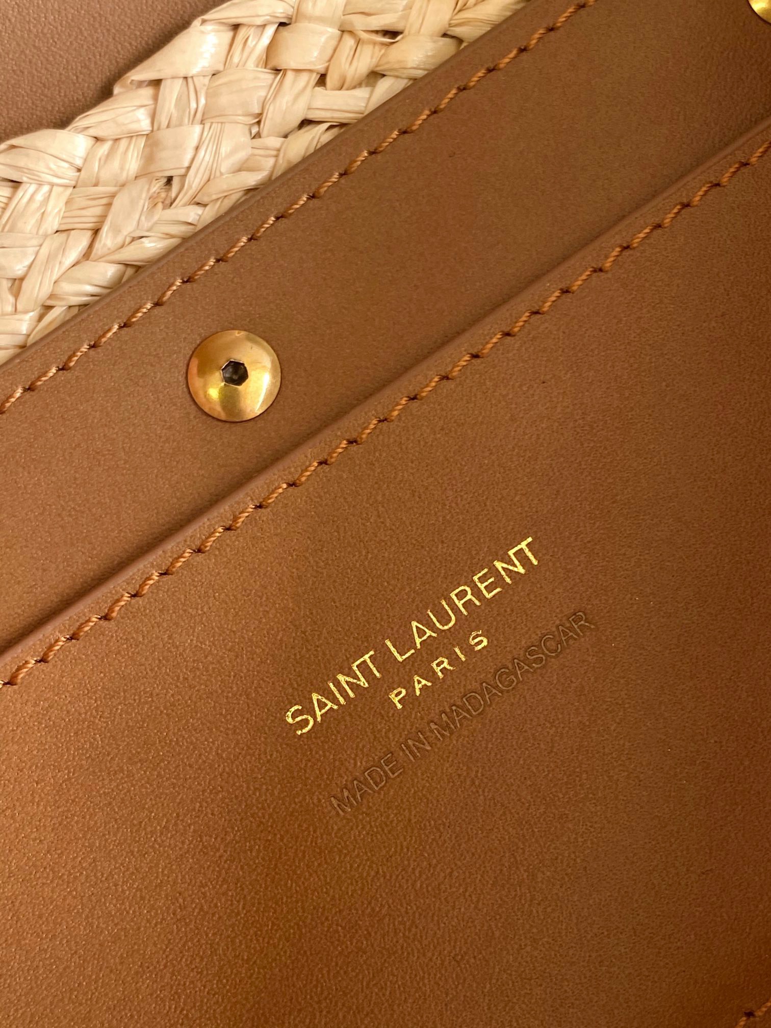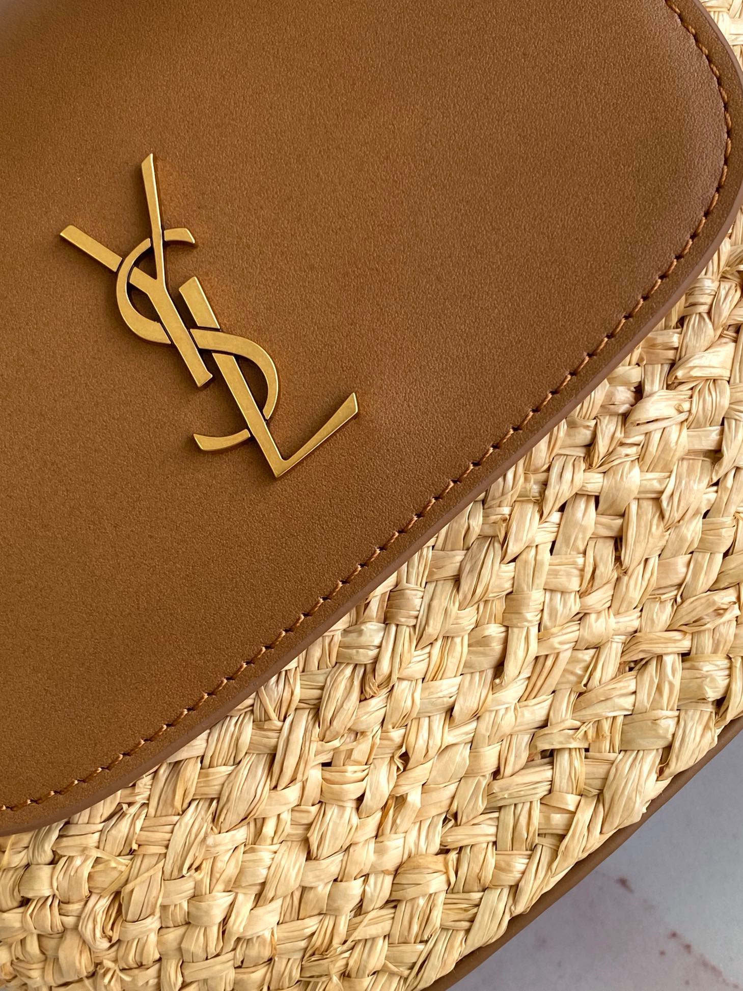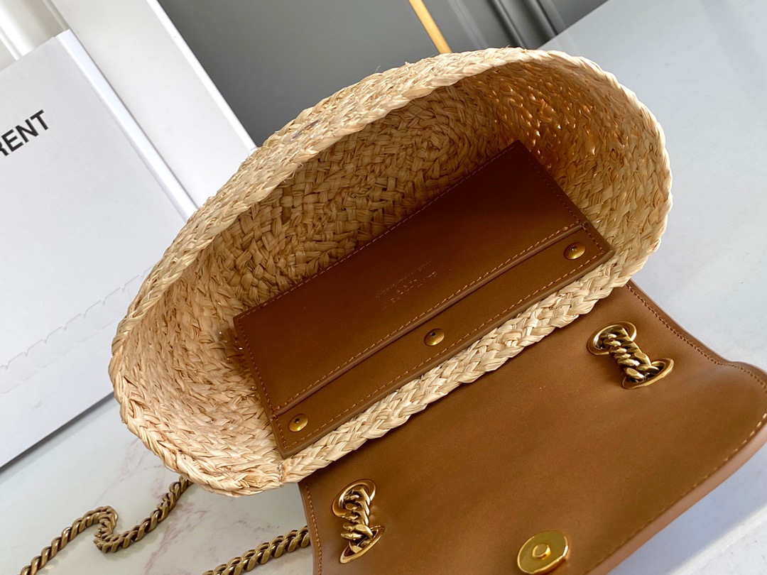 حقيبة سلة صغيرة من الرافية المنسوجة مع غطاء من الجلد المدبوغ الخالي من المعدن، ومزينة بـ LE CASSANDRE.