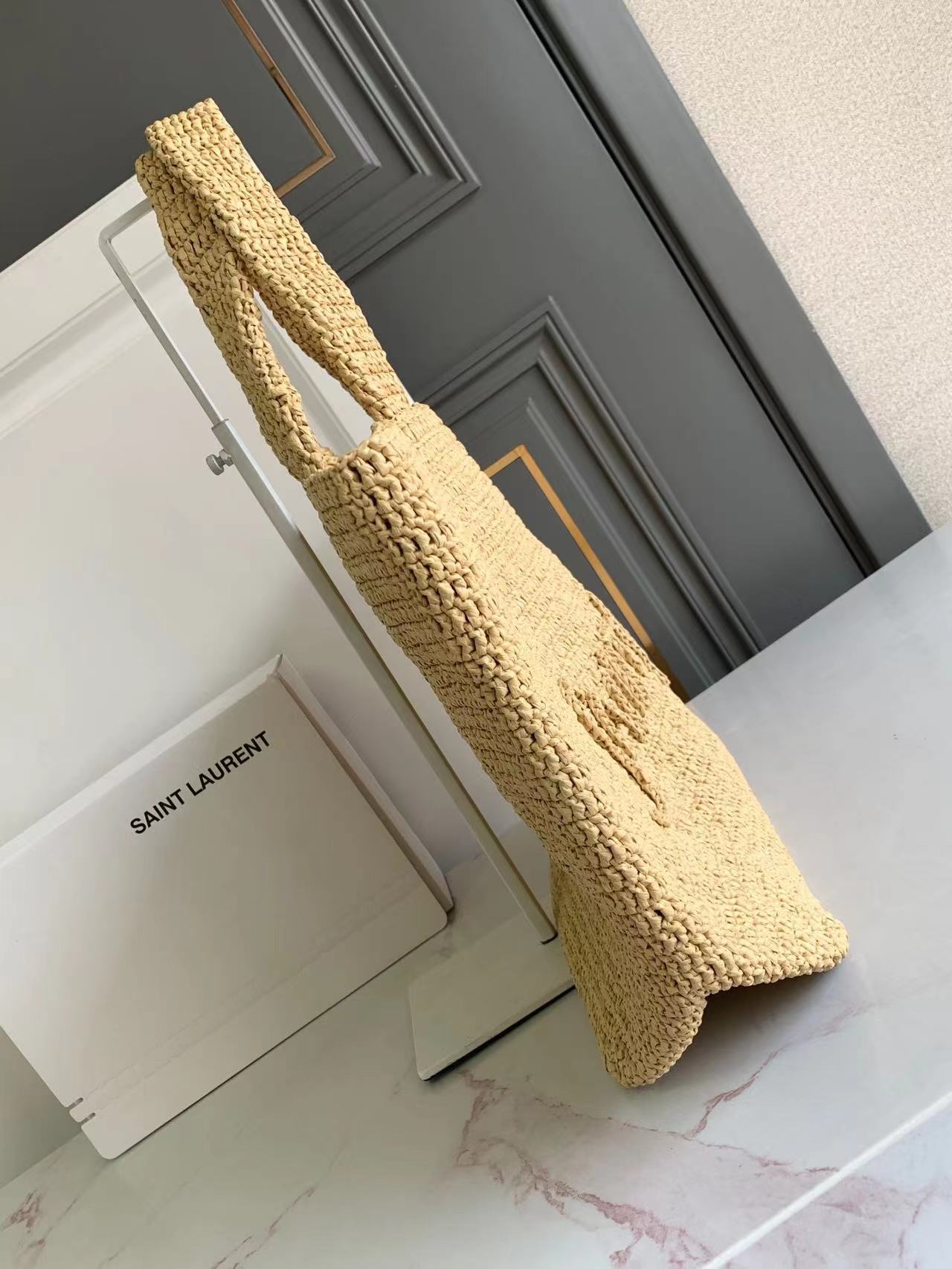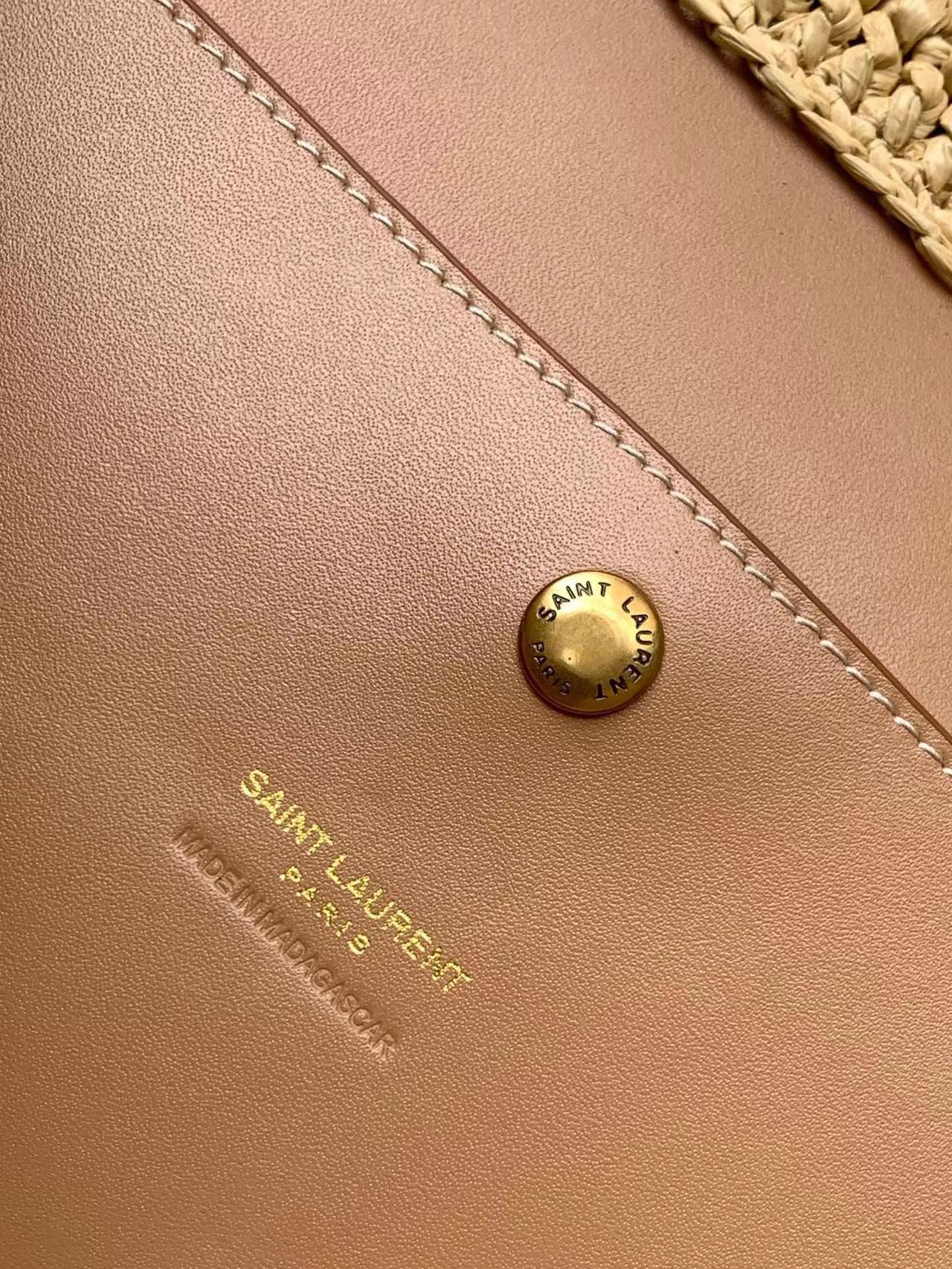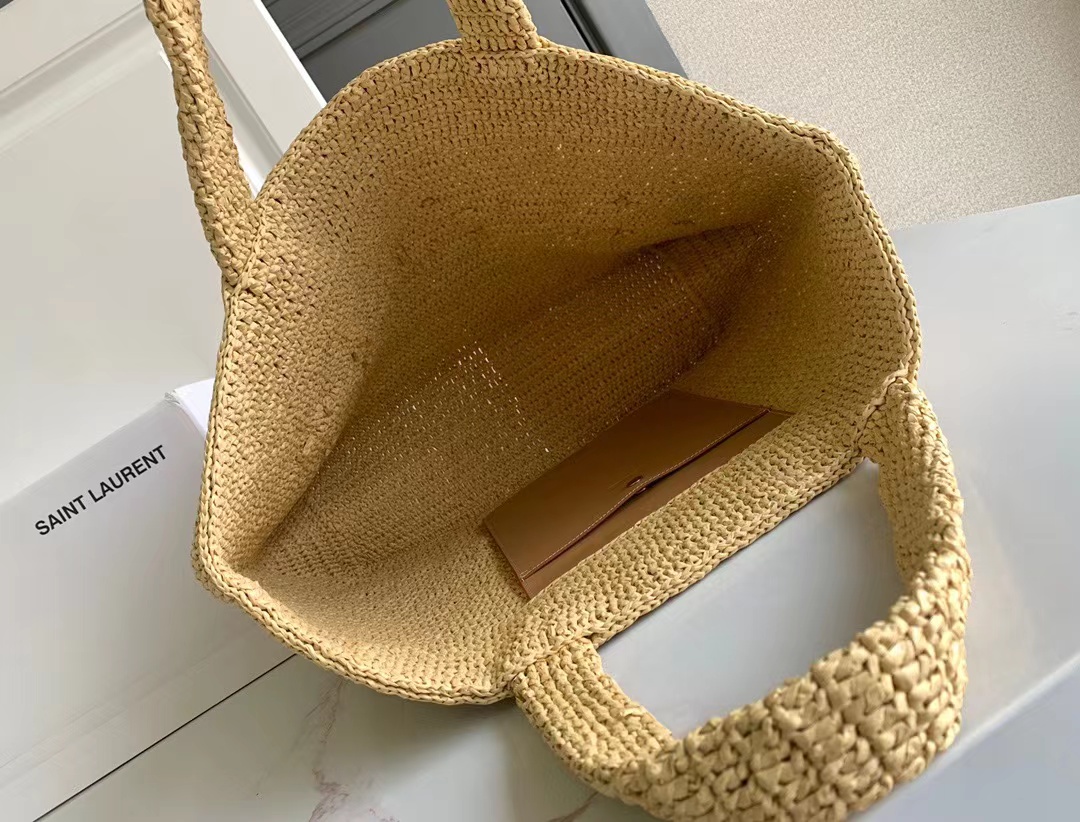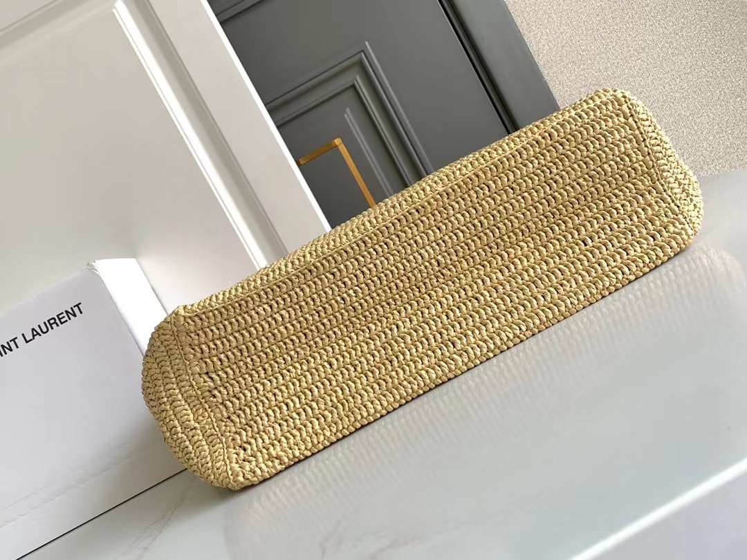 حقيبة كبيرة مصنوعة يدويًا من القش ومطرزة بتوقيع سان لوران بالقش المتناغم.