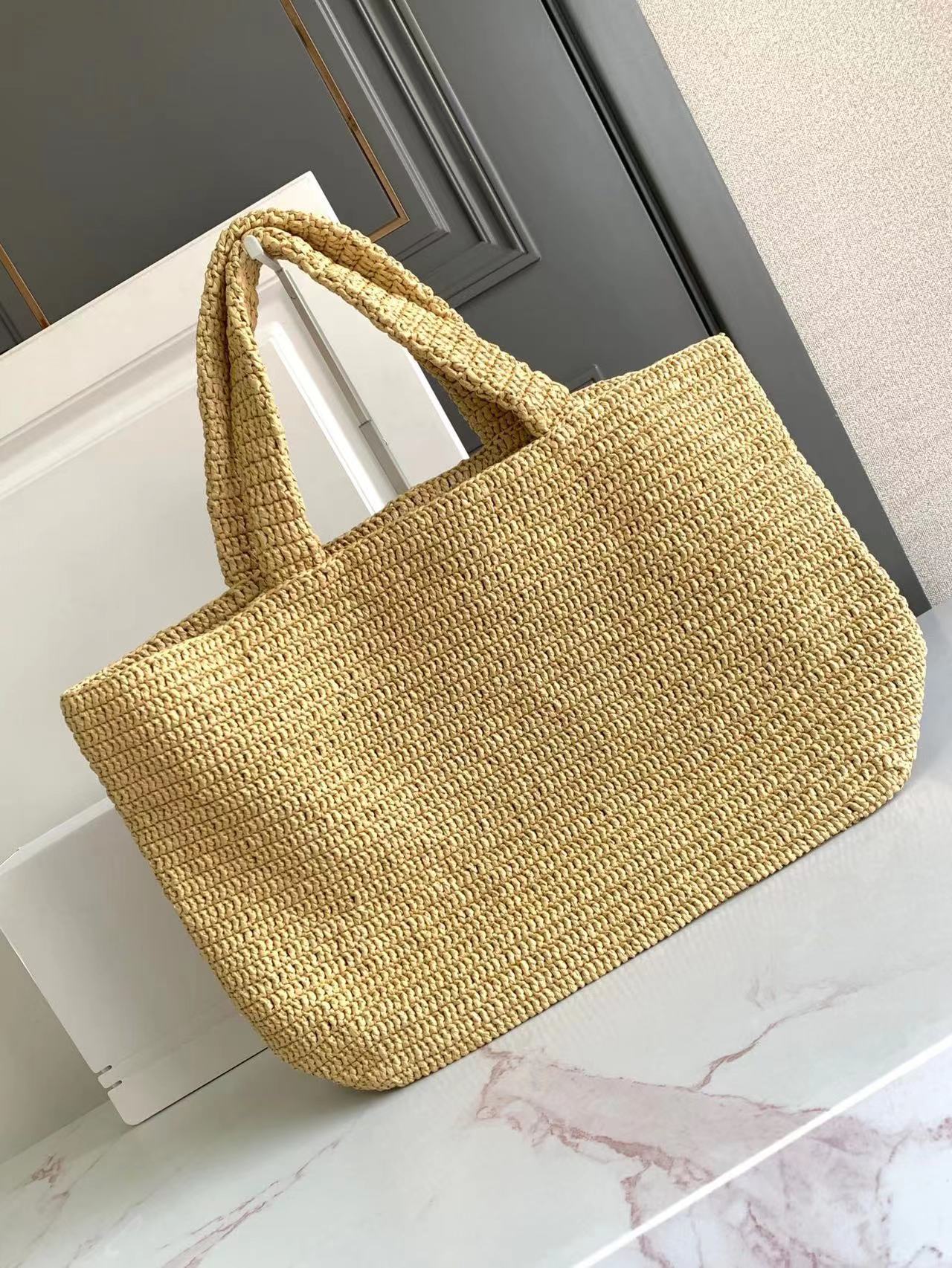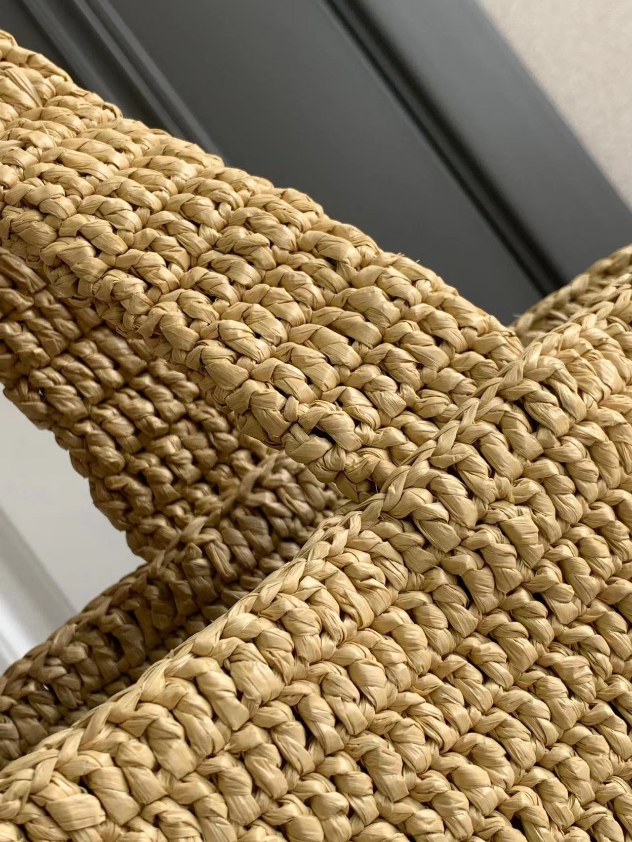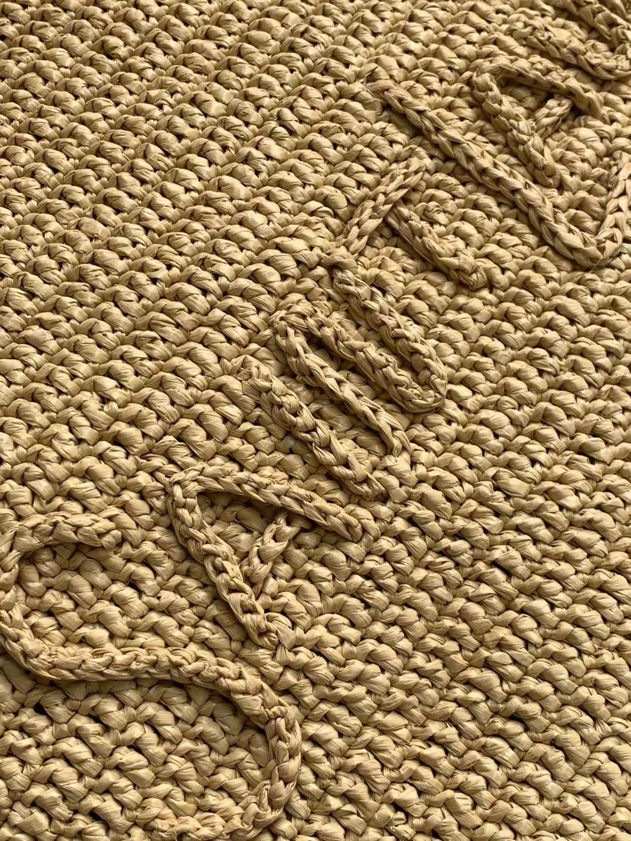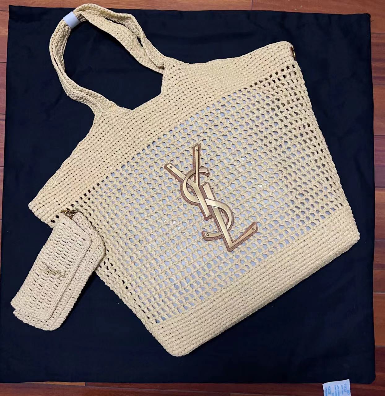حقيبة كبيرة مصنوعة يدويًا من القش ومطرزة بتوقيع سان لوران بالقش المتناغم.